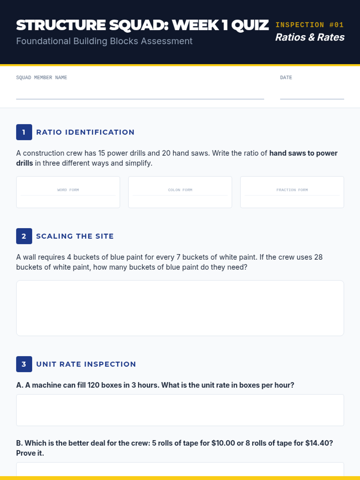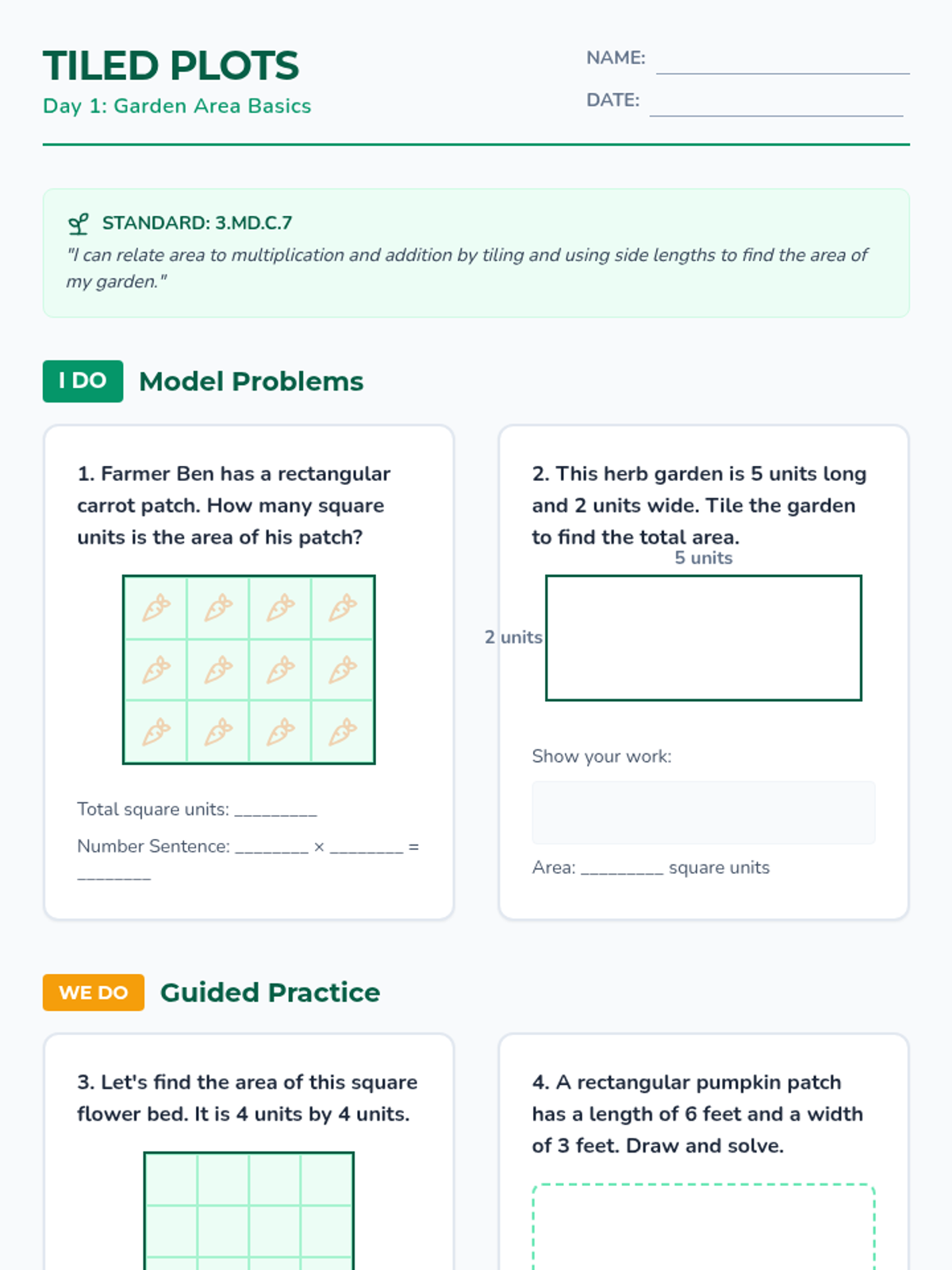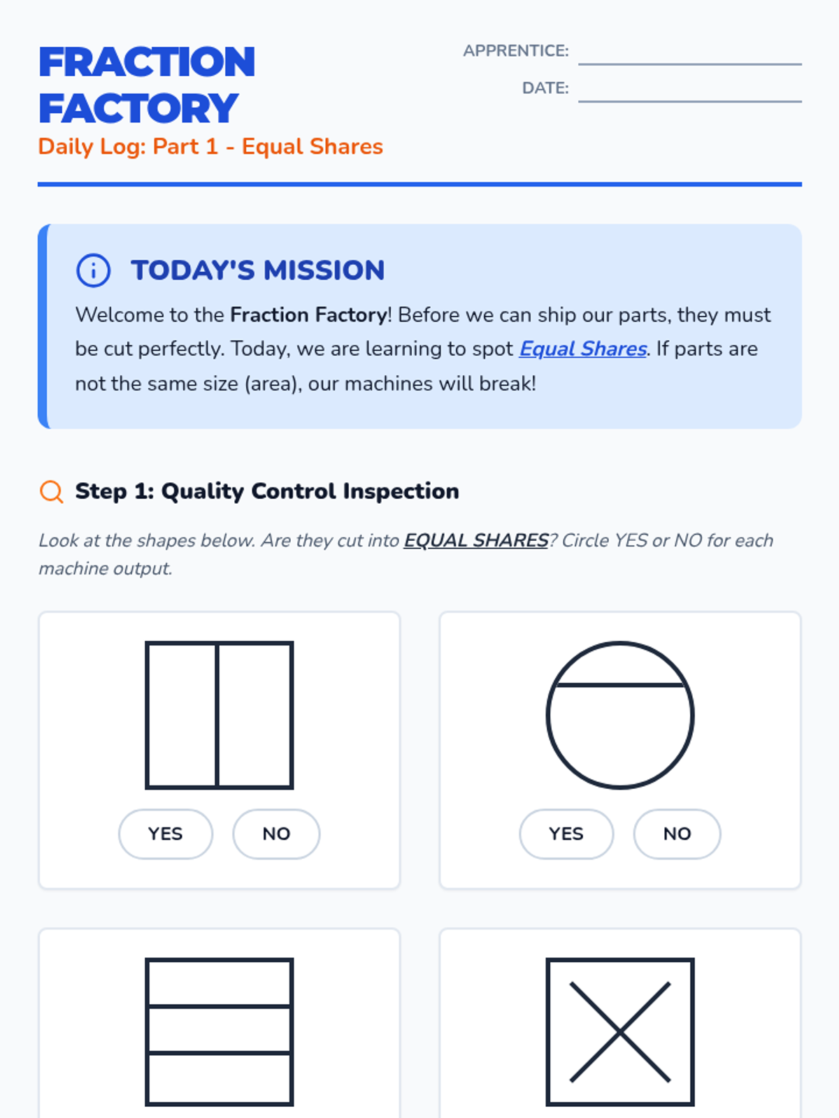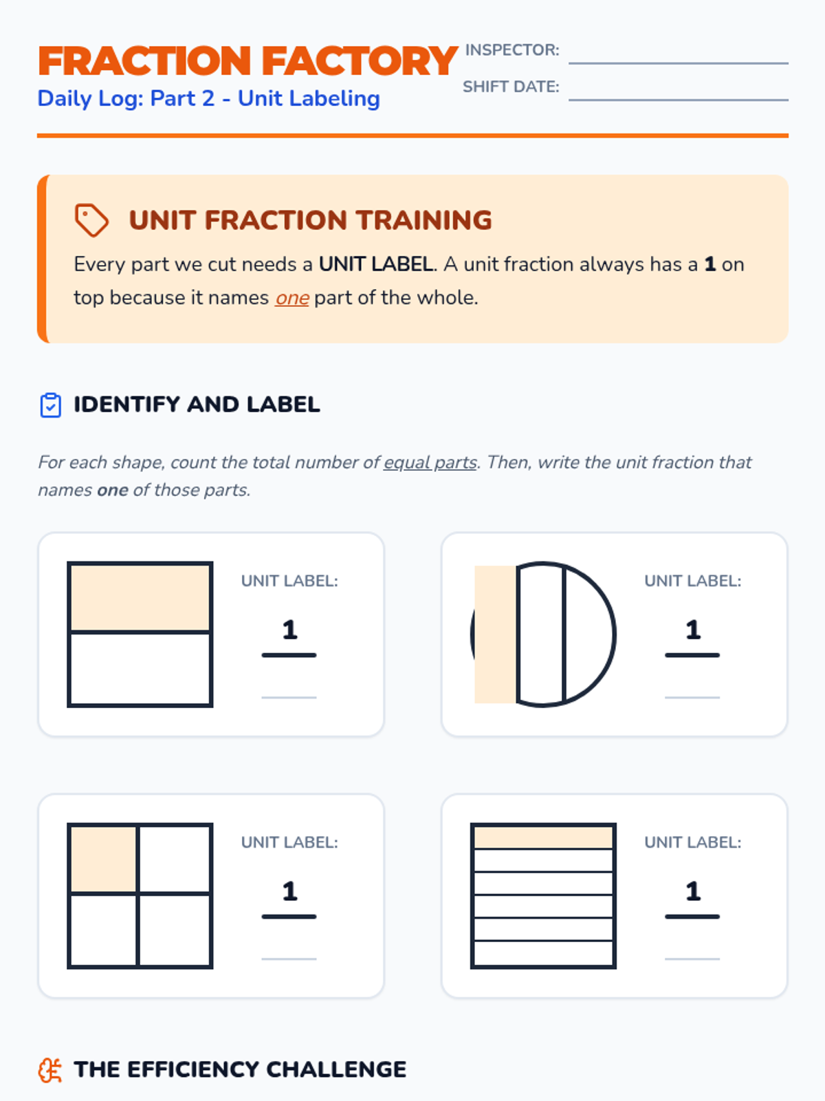 A 5-day self-paced unit explicitly aligned to Arizona Mathematics Standard 3.G.A.2. Students partition shapes into equal areas and express the parts as unit fractions (1/b). The 'Fraction Factory' theme provides a real-world engineering context for geometry and spatial reasoning.