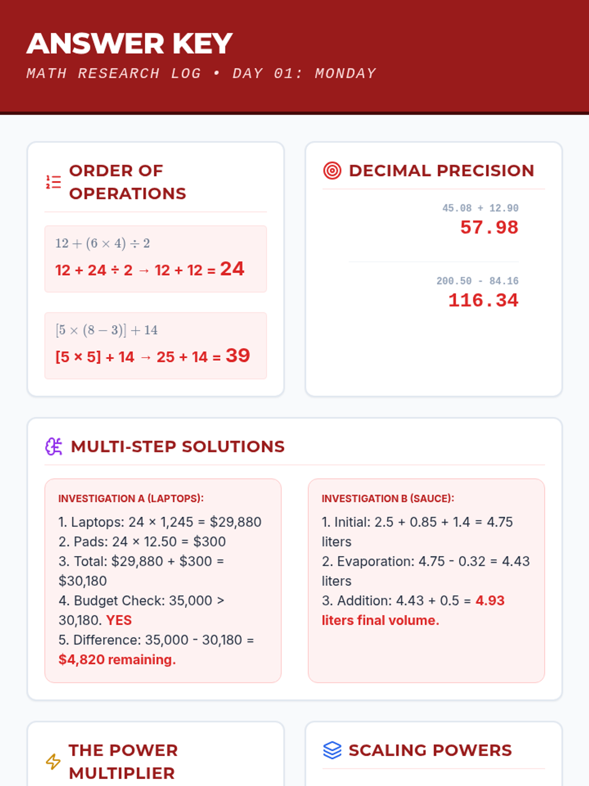 A comprehensive unit on performing the four operations with decimals, using a detective-themed approach to engage students in precision and problem-solving.