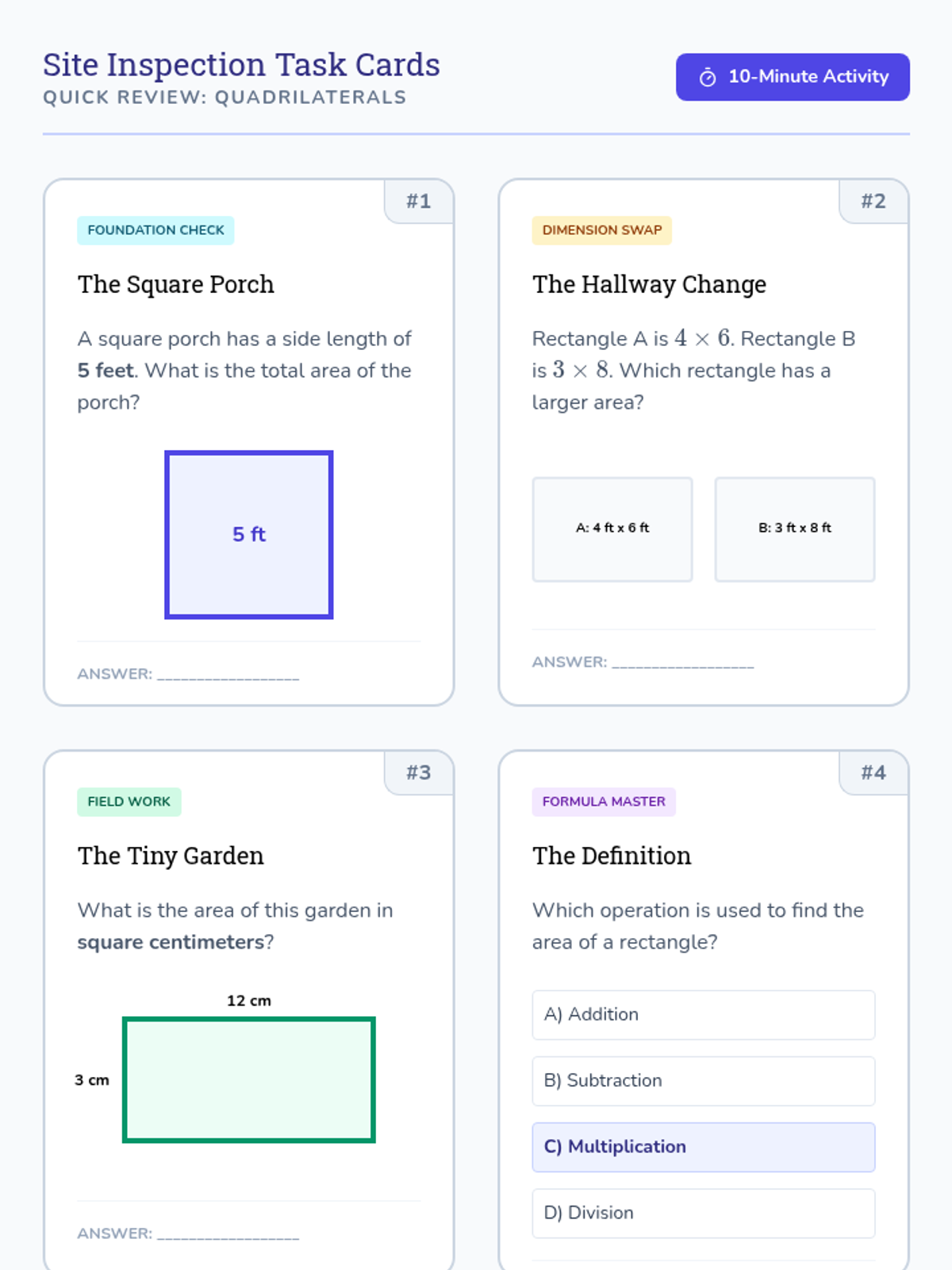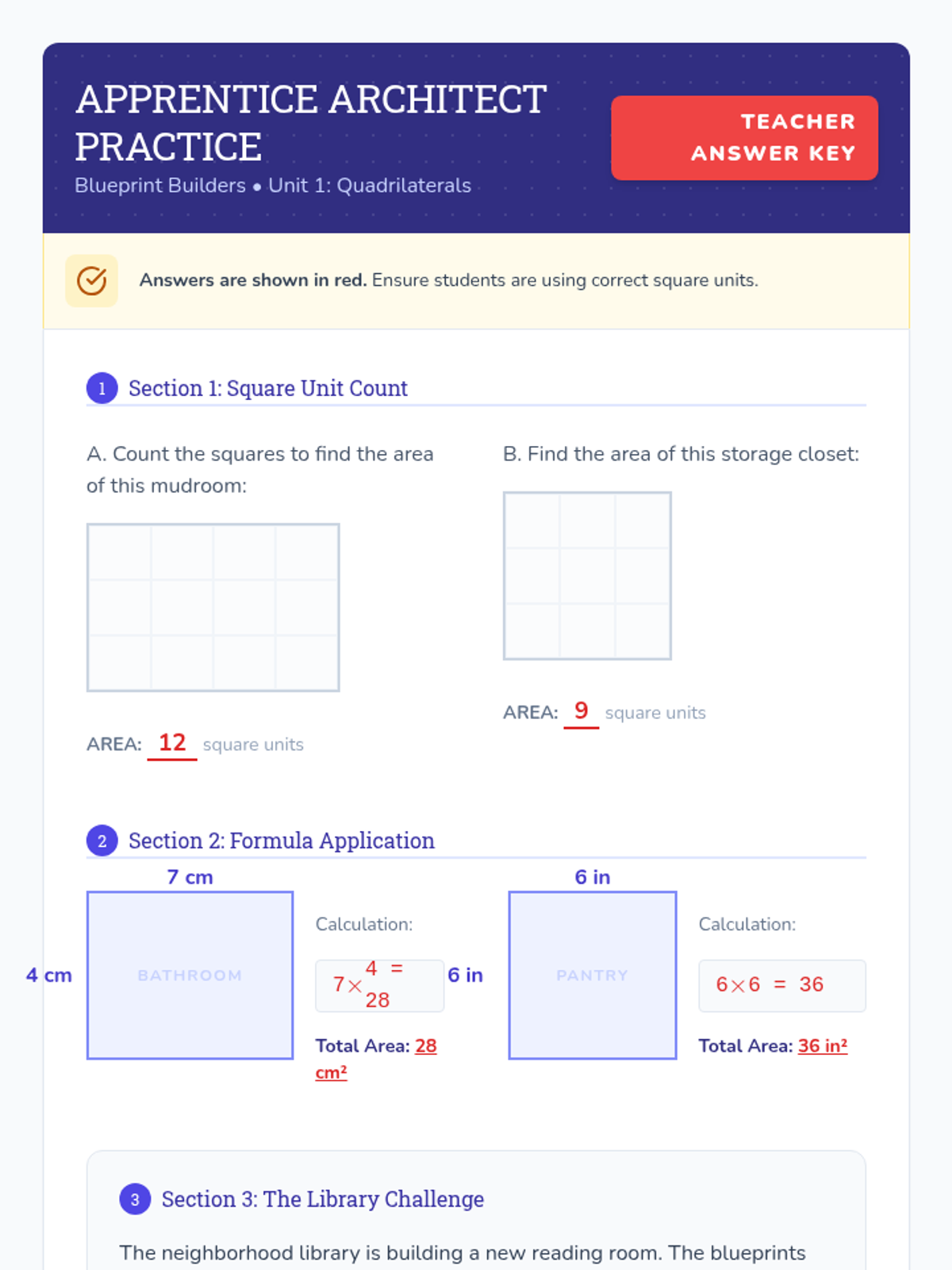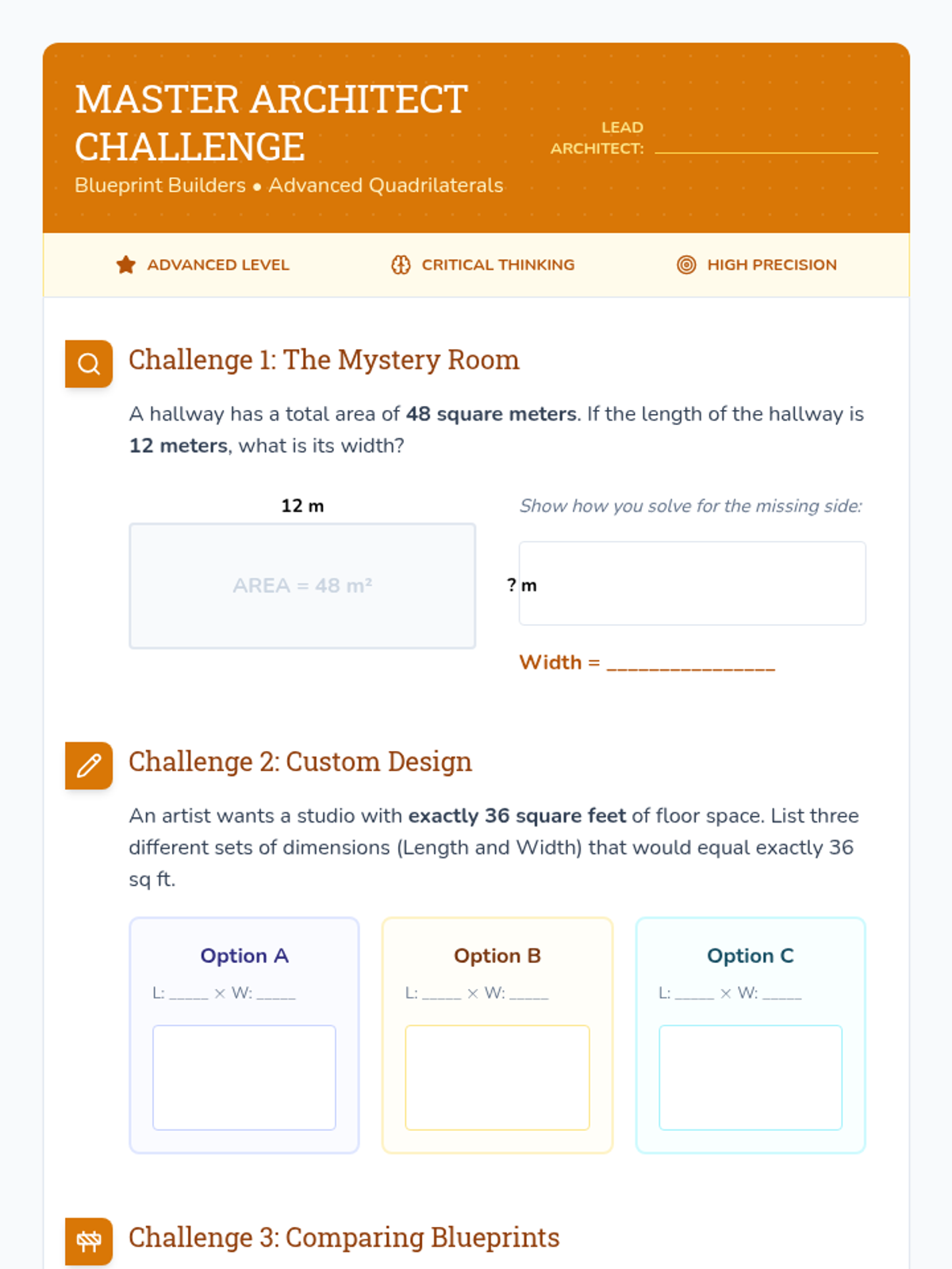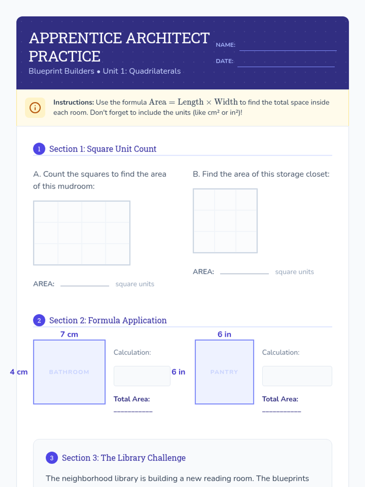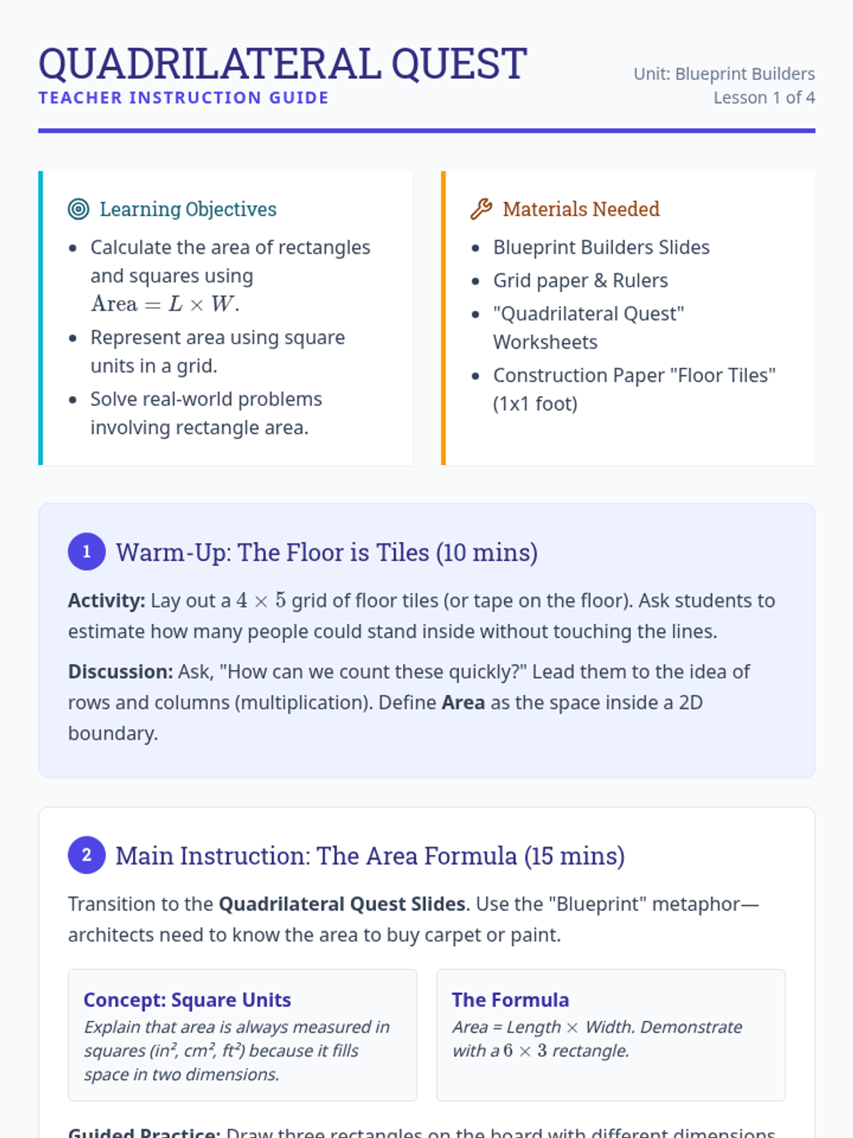 A comprehensive 4th-grade geometry unit focused on calculating the area of quadrilaterals, triangles, and irregular polygons through decomposition and formulas. The unit uses a 'Blueprint Builders' theme to engage students in real-world mathematical applications.
