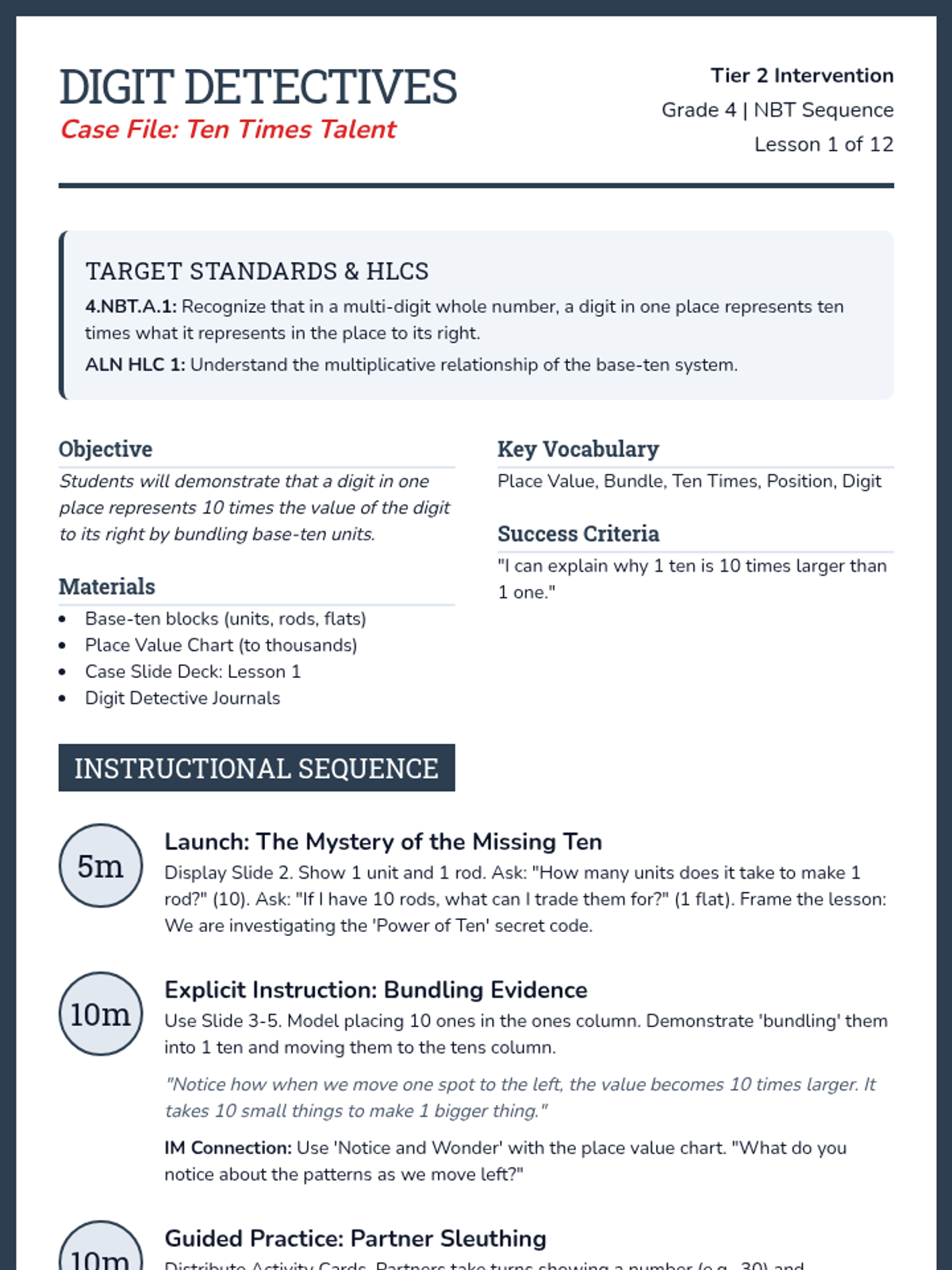 A 12-lesson Tier 2 intervention sequence for 4th grade, focusing on 4.NBT standards through the lens of 'Digit Detectives'. Lessons incorporate ALN High Leverage Concepts and IM-aligned strategies with visual models and explicit instruction.