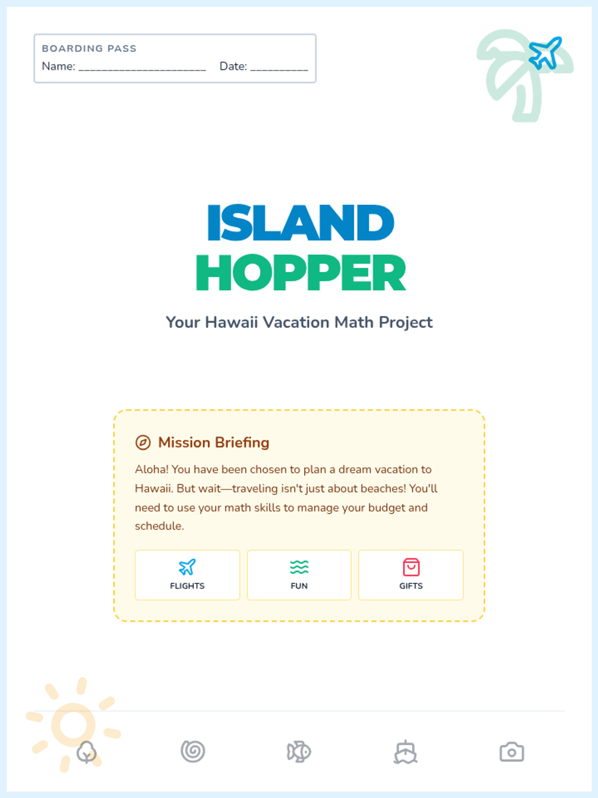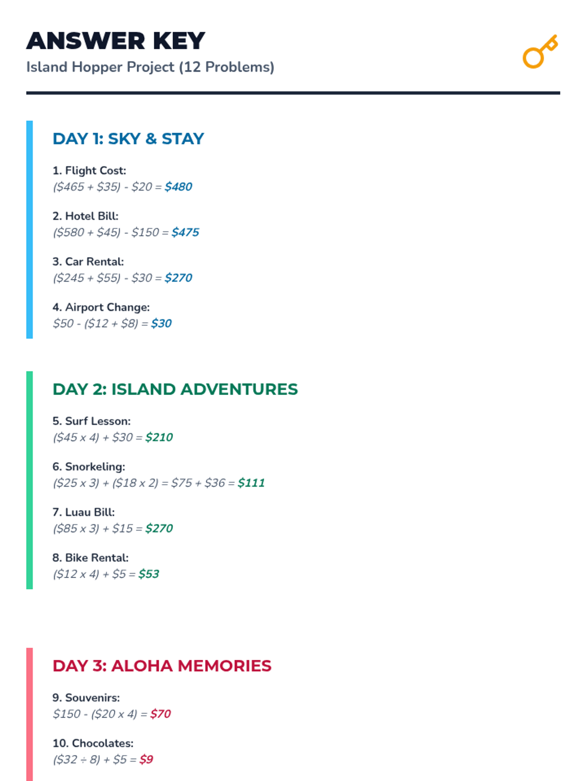 A three-day project-based learning sequence where students plan a Hawaii vacation while solving two-step word problems. The math progresses from addition and subtraction to multiplication and finally all four operations, all within 1000.