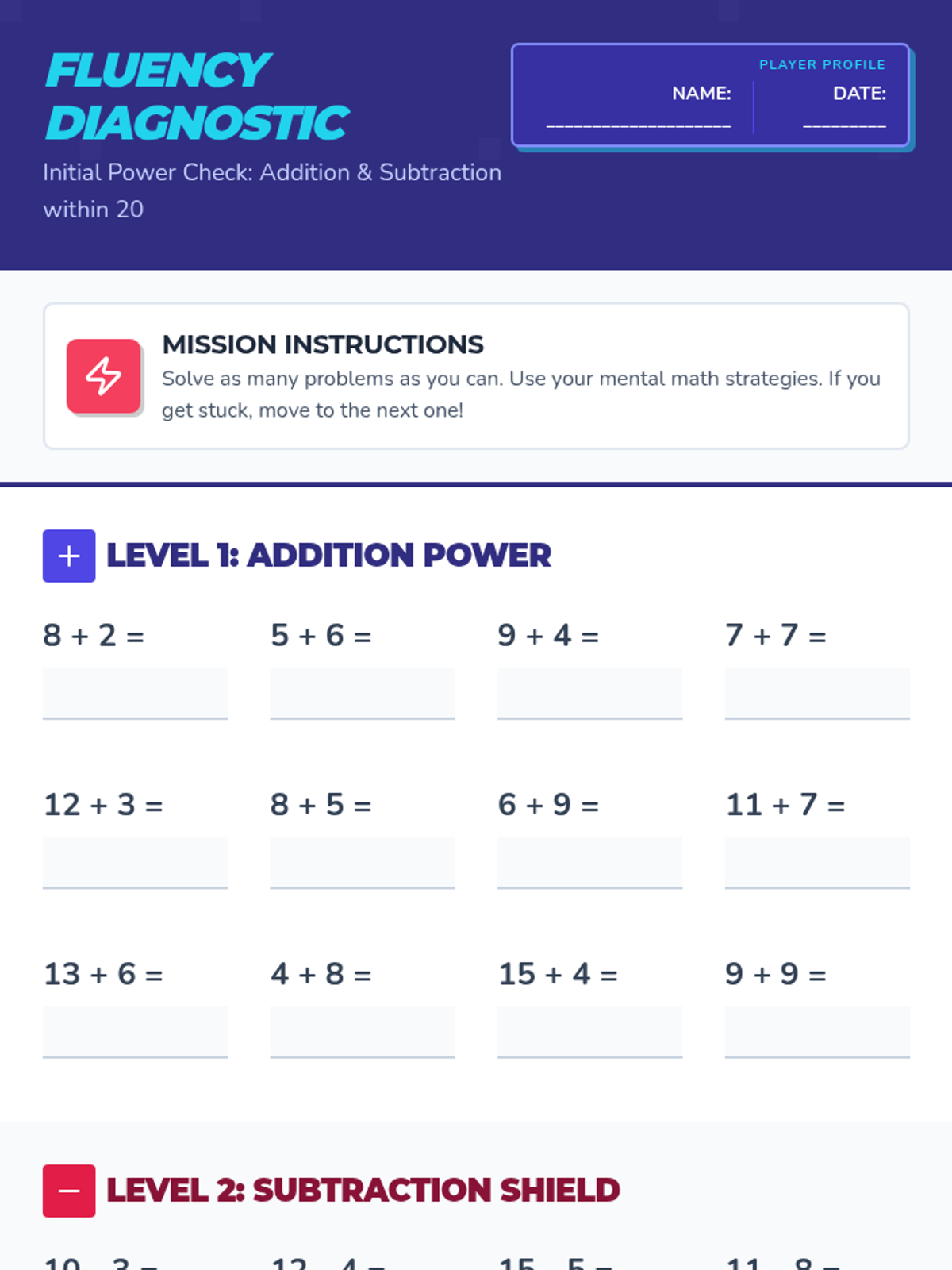 A targeted Tier 2 intervention program for 2nd graders focusing on mental math strategies for addition and subtraction within 20, featuring an arcade-themed progression.