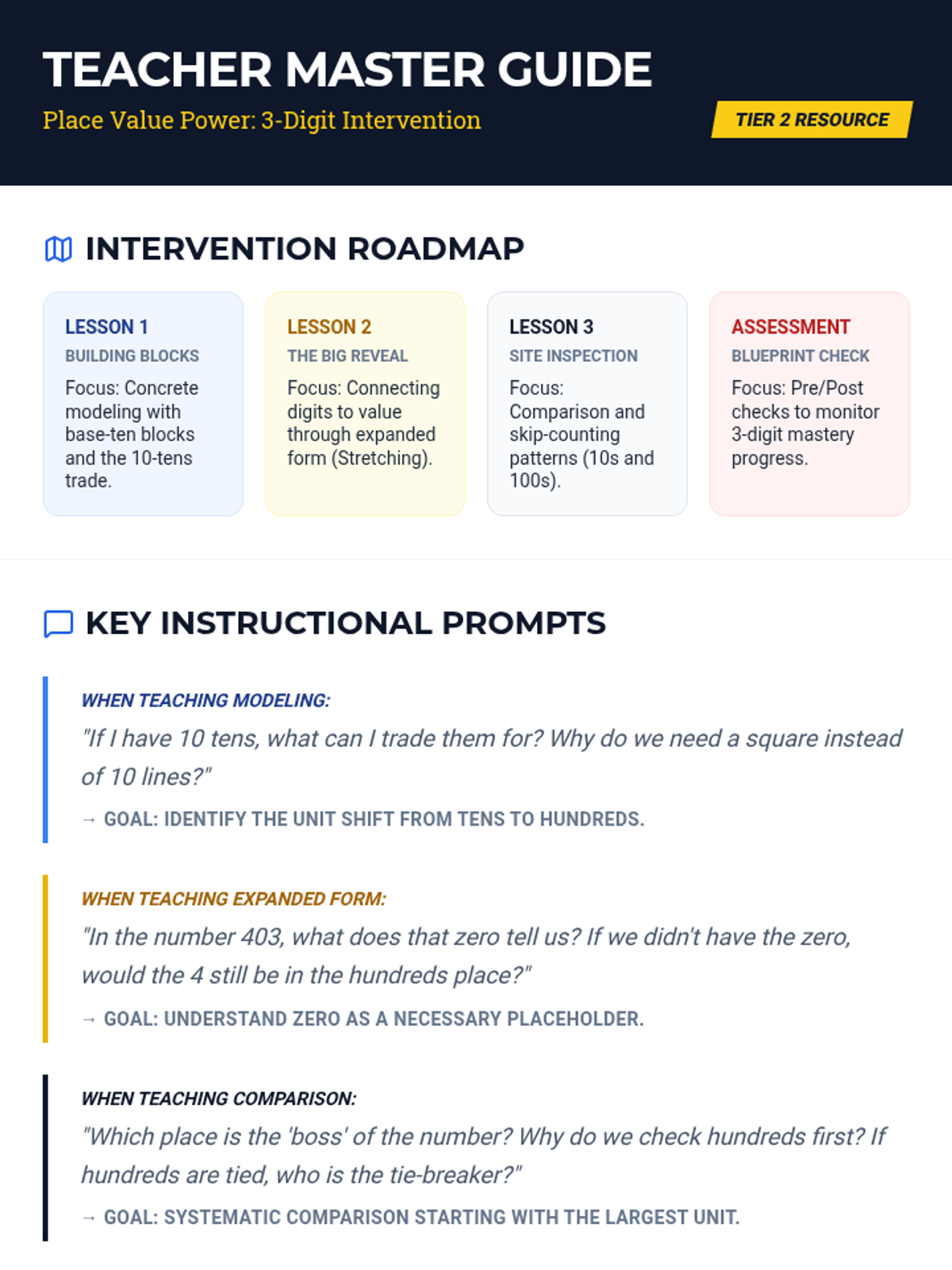 A targeted Tier 2 intervention sequence for 2nd graders focusing on 3-digit place value, progressing from concrete models to abstract representation and comparison.