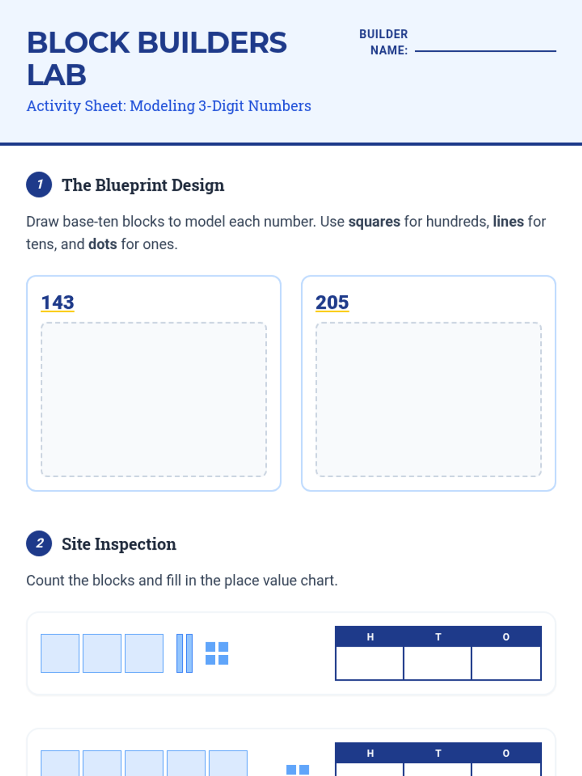 A foundational unit on place value that spirals from teen numbers up to the hundreds place. Using a 'Digit Builders' architectural theme, students learn to construct, deconstruct, and compare 2-digit and 3-digit numbers, building a solid foundation for future math.