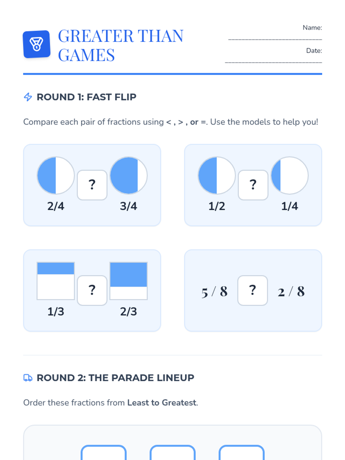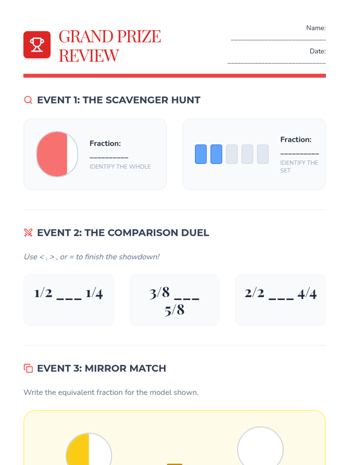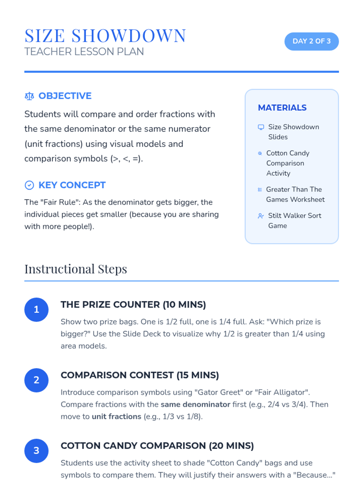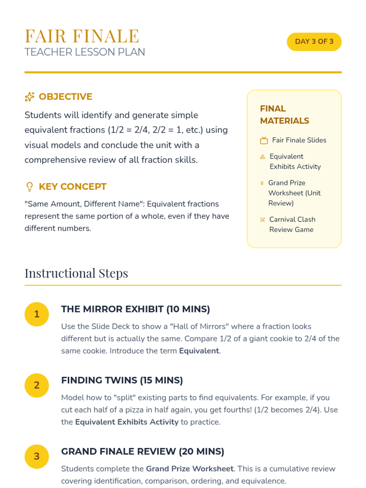 A fair-themed math unit where students explore fractions through interactive carnival games and activities, focusing on identifying, representing, and comparing parts of a whole.