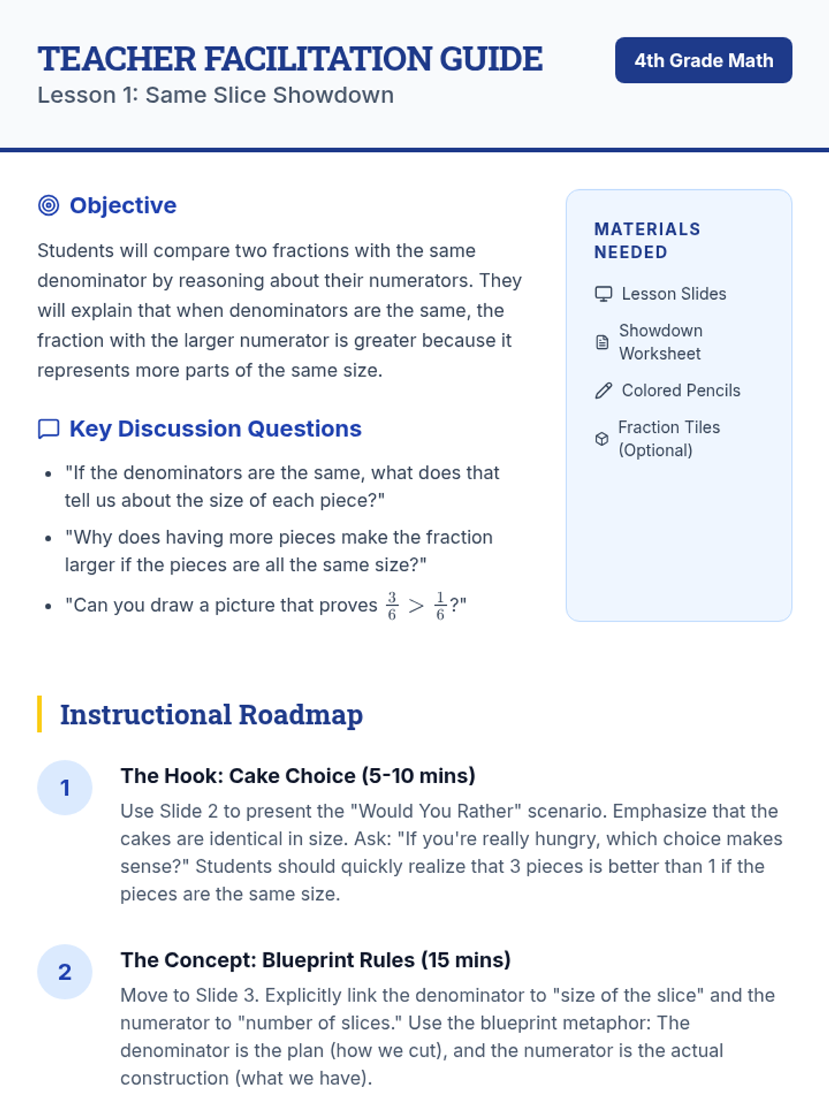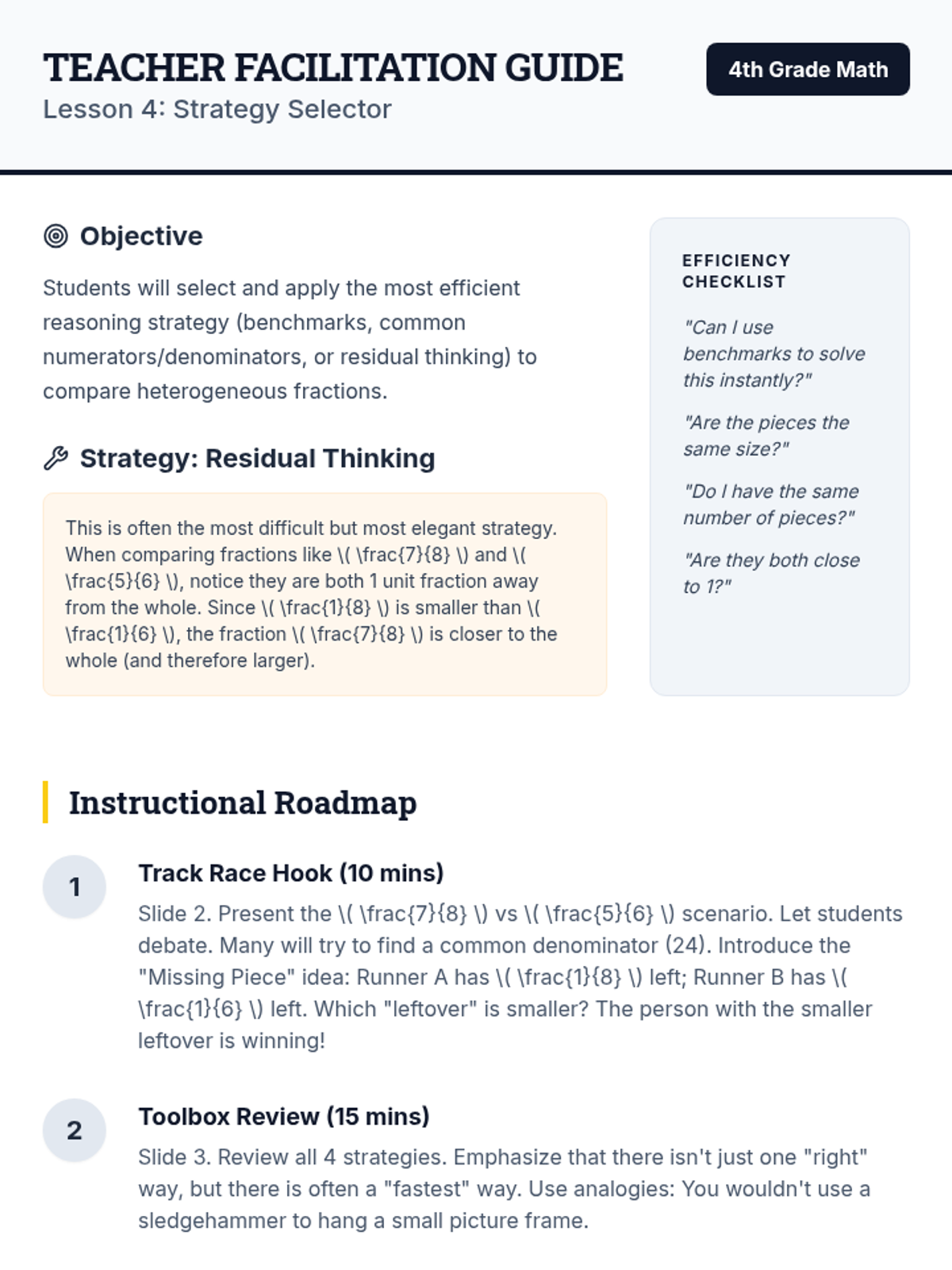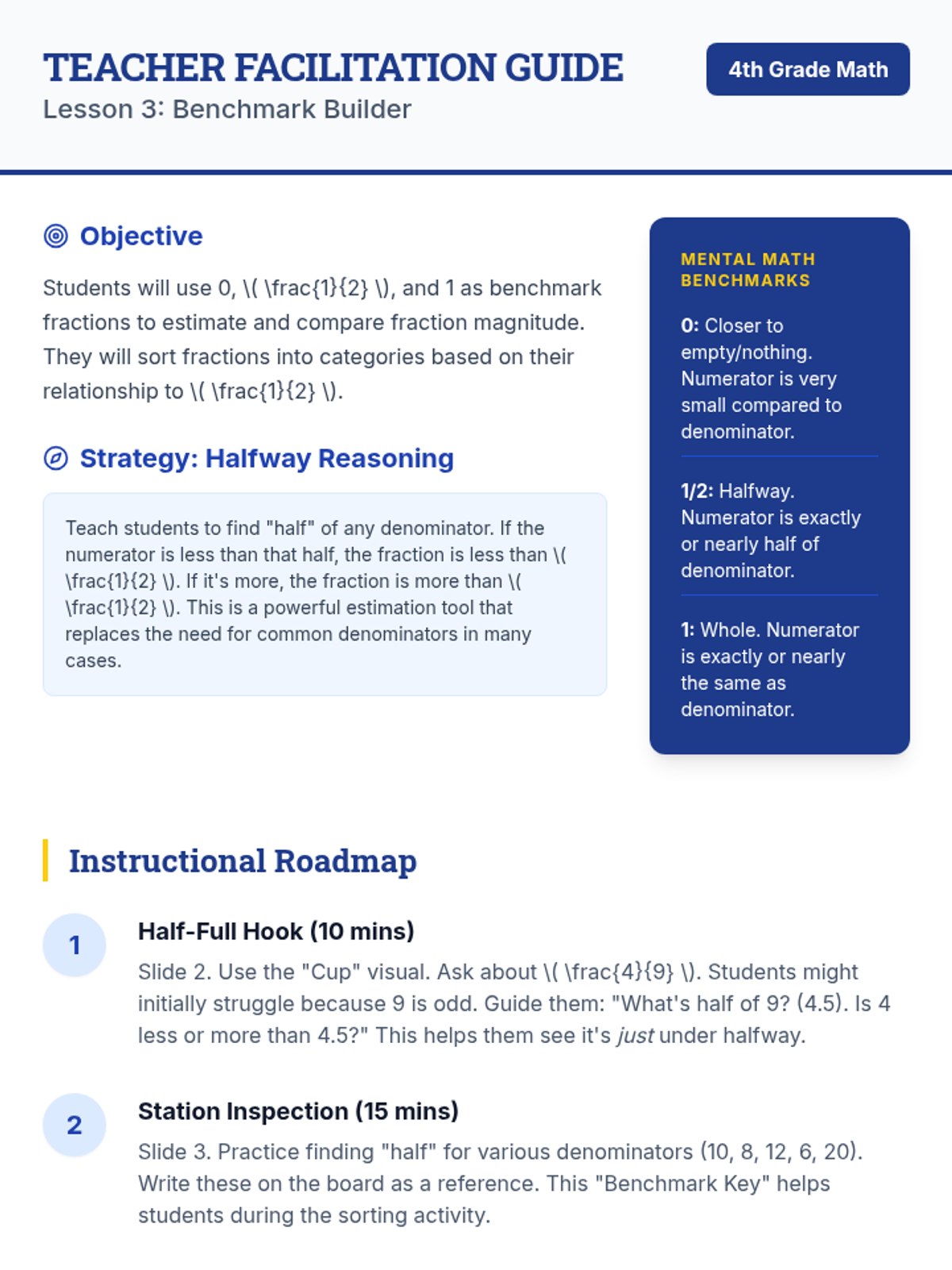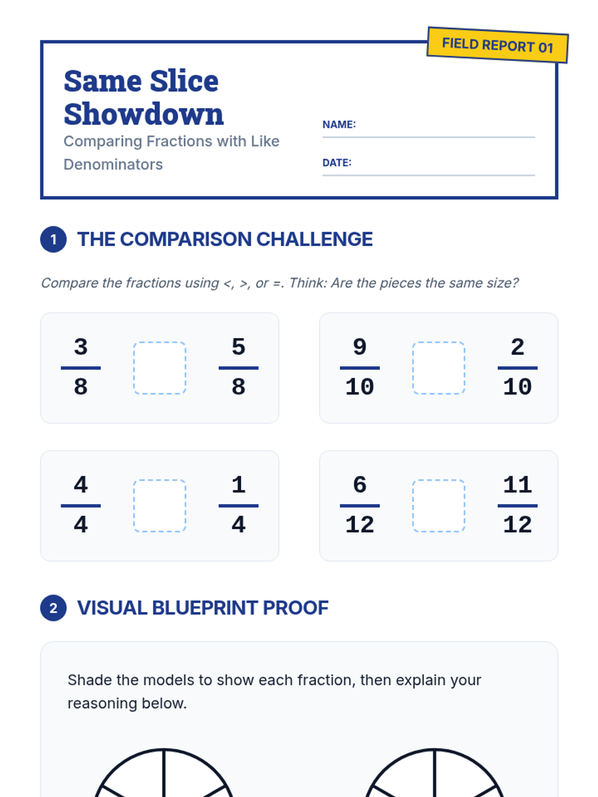 A comprehensive sequence for 4th graders to master comparing and ordering fractions using reasoning strategies like common denominators, common numerators, and benchmark fractions. Students move from basic like-denominator comparisons to complex heterogeneous fraction ordering.