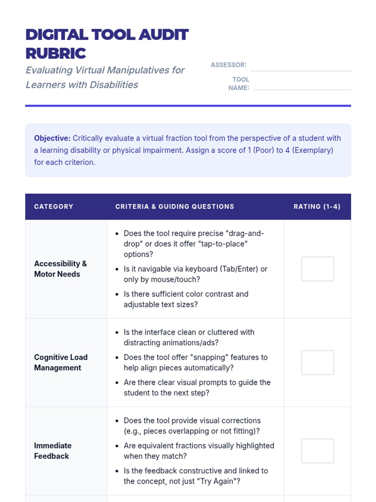 A comprehensive sequence for pre-service special education teachers focusing on diagnosing fraction misconceptions and implementing hybrid intervention strategies using physical and virtual manipulatives. Students move from error analysis to designing technology-integrated support plans for learners with disabilities.