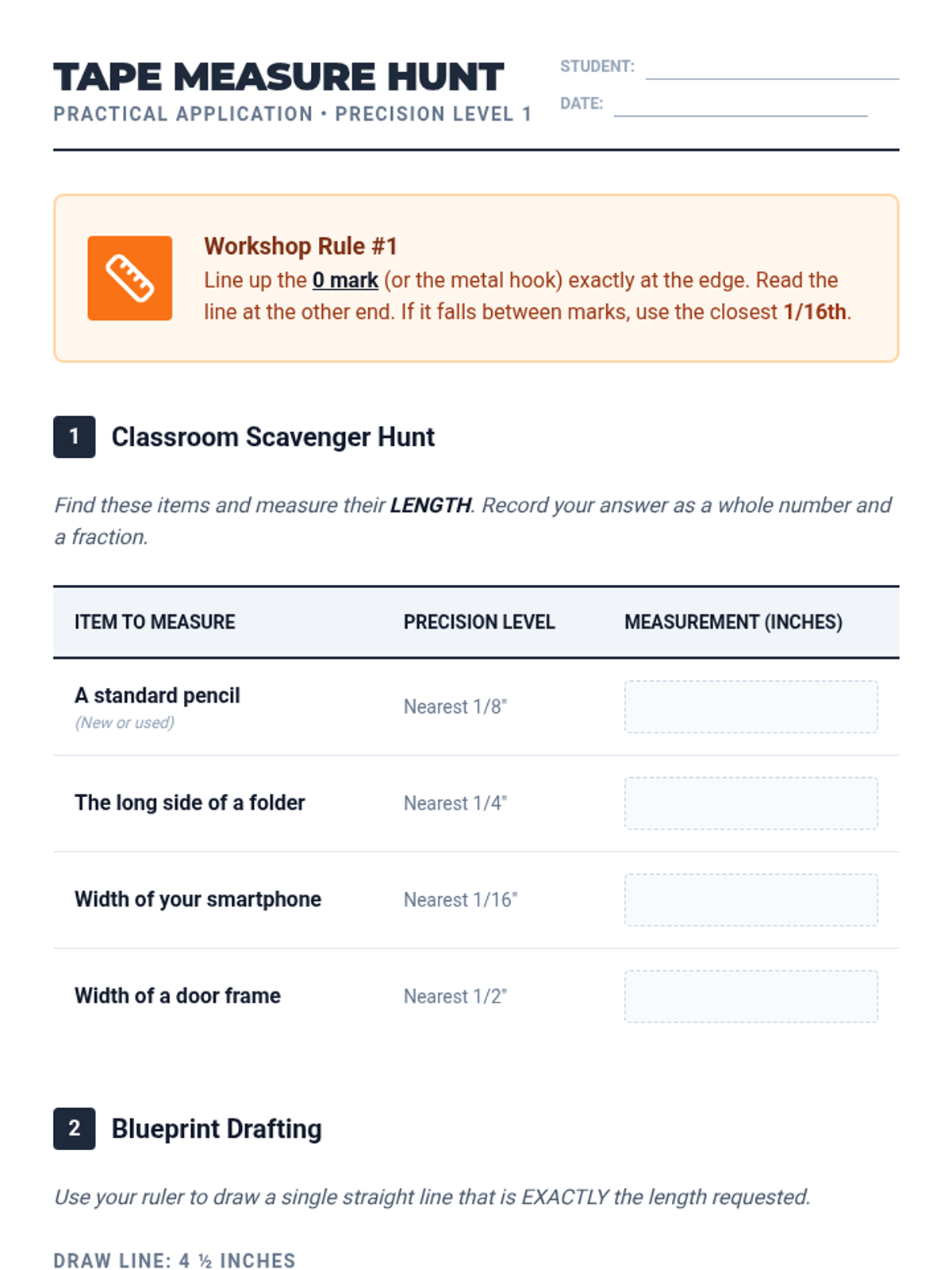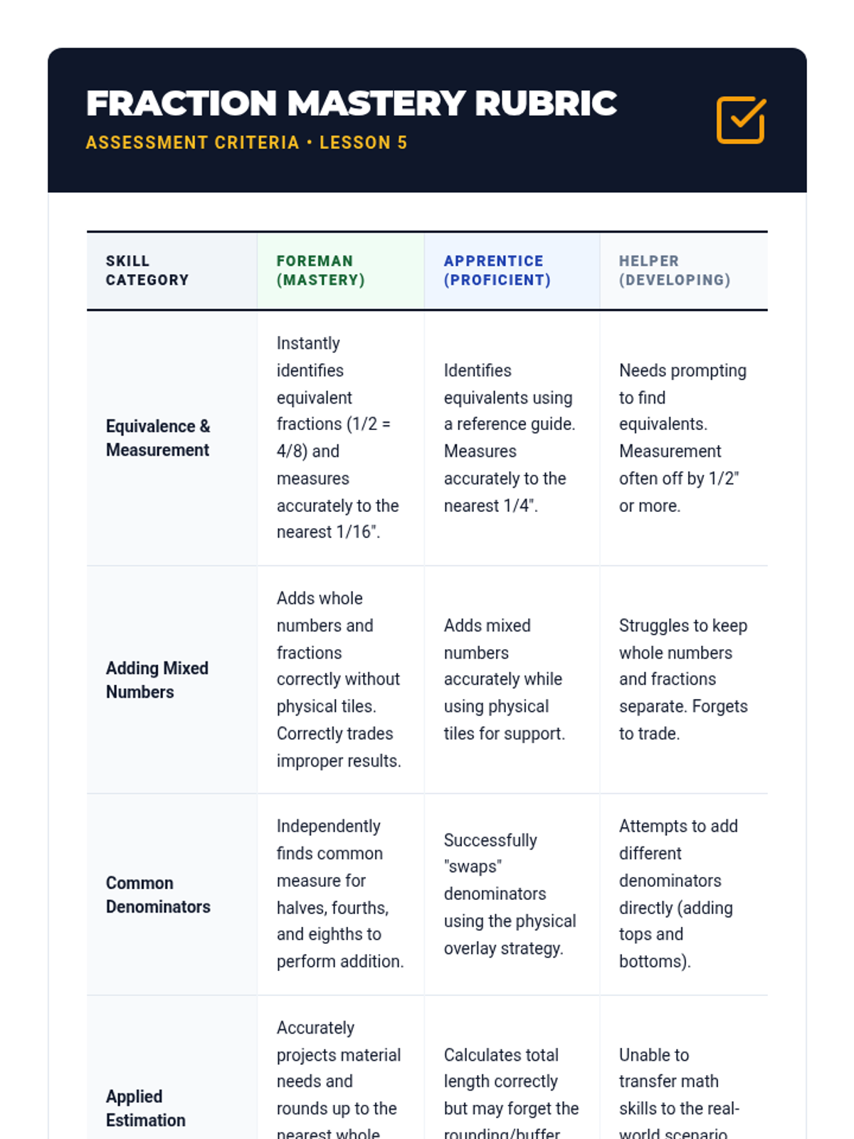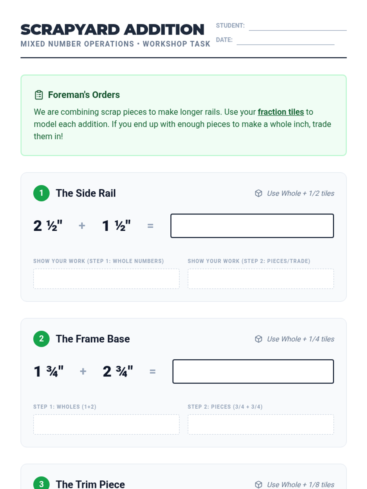 A math sequence for 12th-grade students in special education, focusing on practical fraction mastery through measurement, construction, and home maintenance scenarios. Students use manipulatives like fraction tiles and rulers to build conceptual understanding and operational fluency.