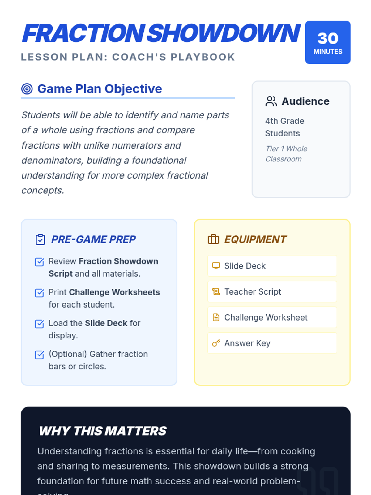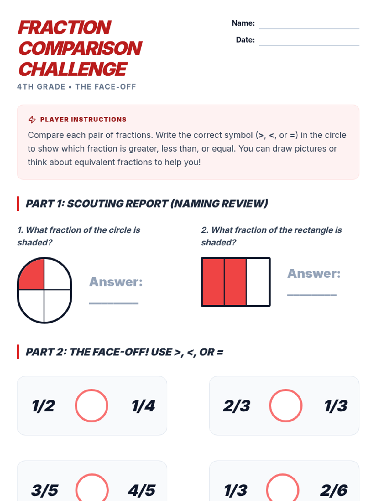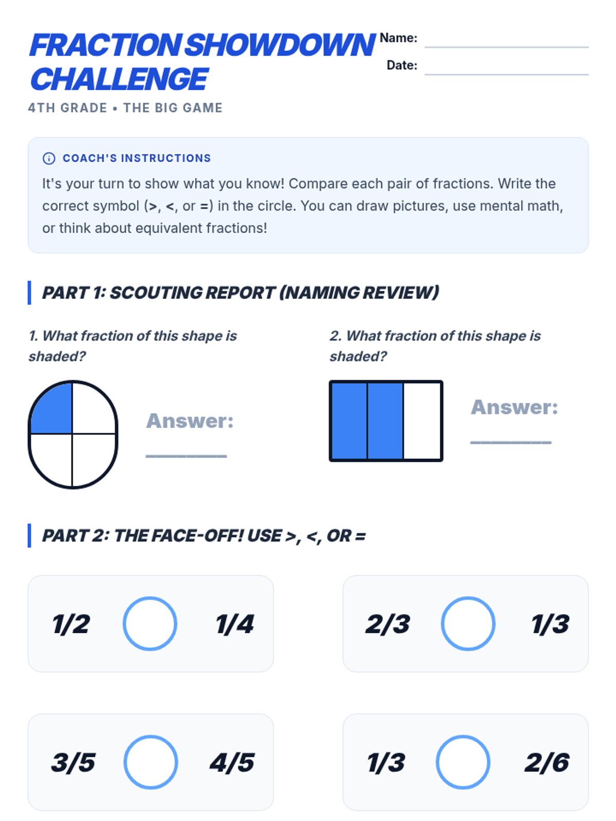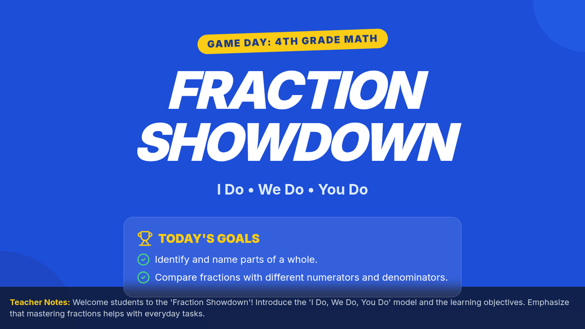 A comprehensive two-part sequence for 4th-grade students to master naming and comparing fractions with unlike denominators through modeling, guided practice, and high-energy showdown activities.