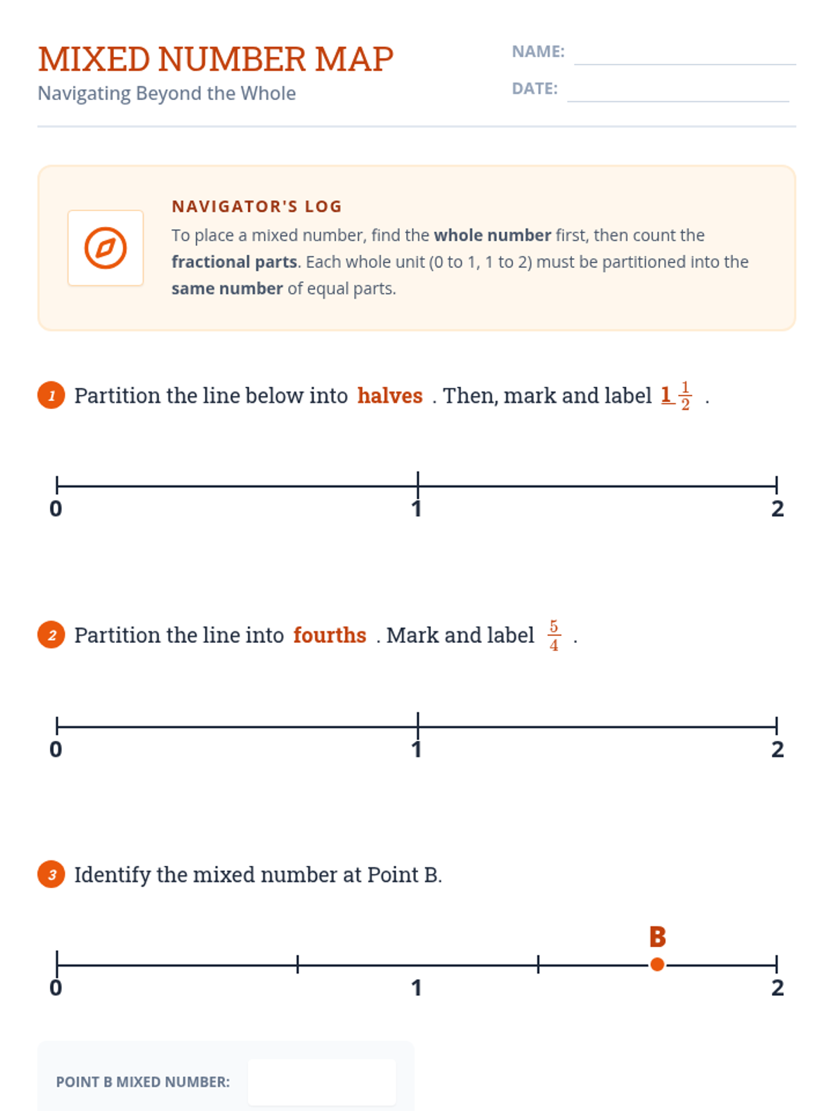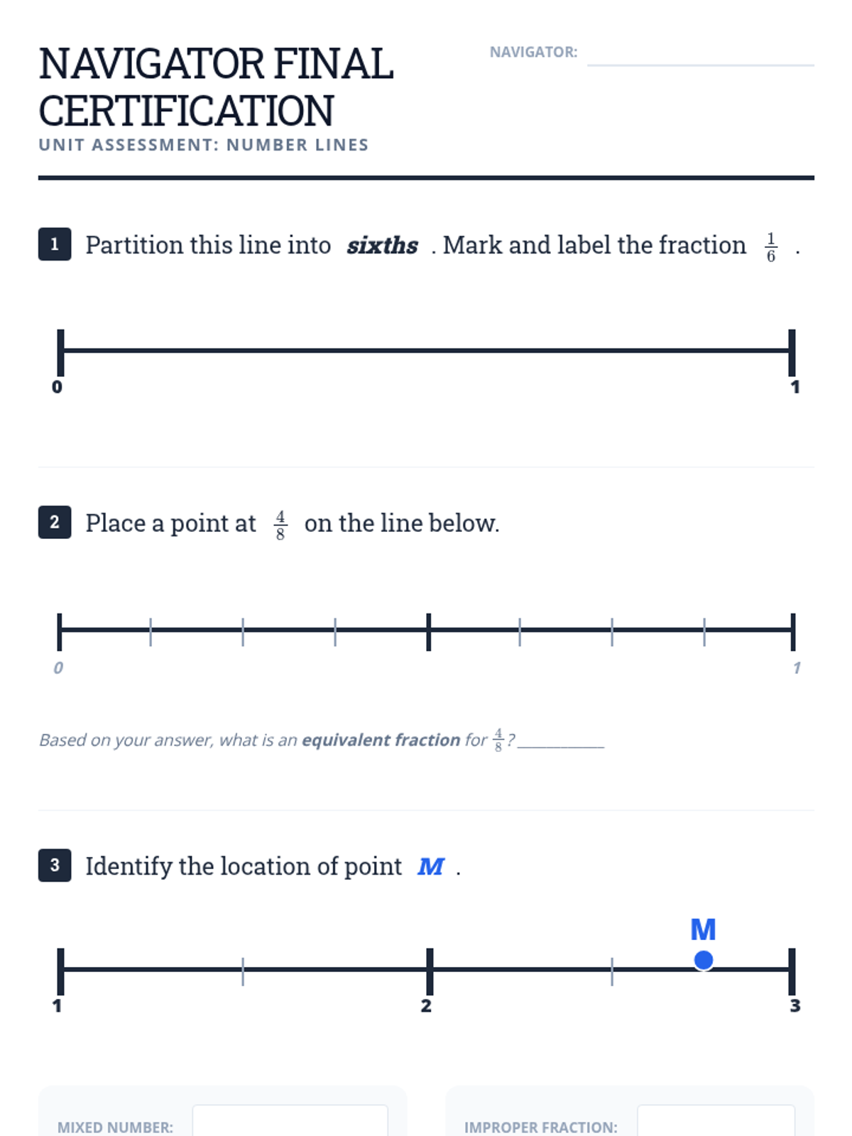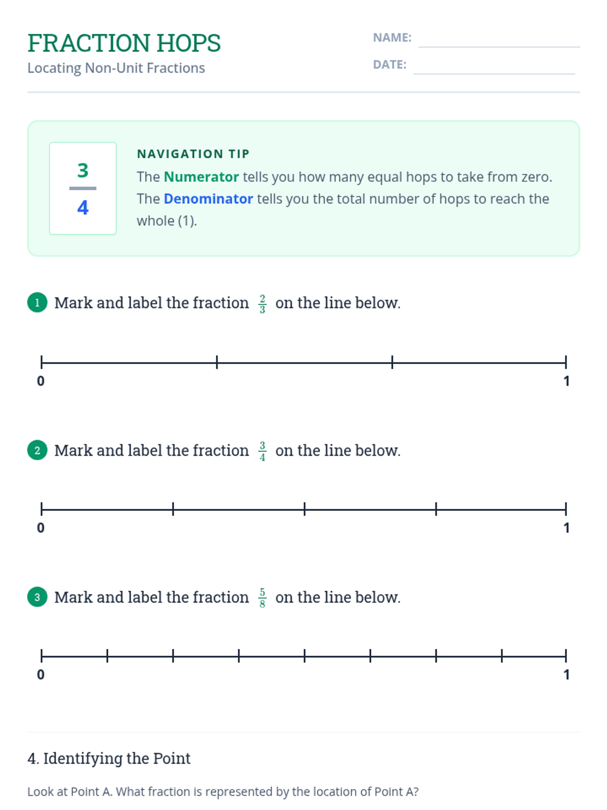 A comprehensive 5-lesson unit for 4th graders to master representing fractions on number lines, from unit fractions between 0 and 1 to mixed numbers and equivalent fractions. Students move from concrete partitioning to abstract estimation using benchmarks.