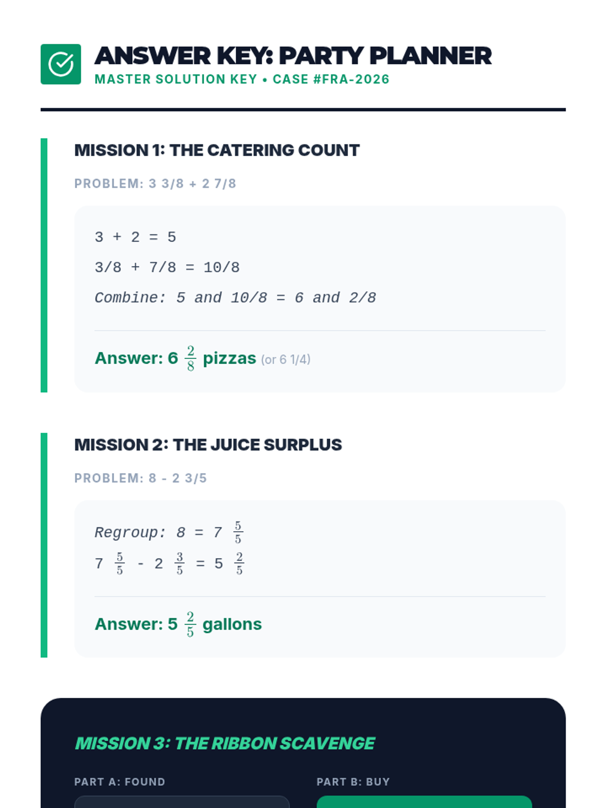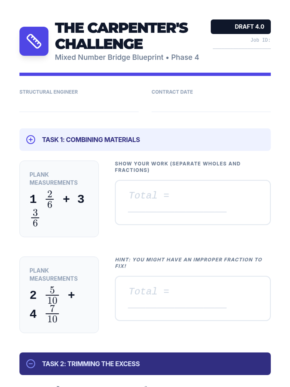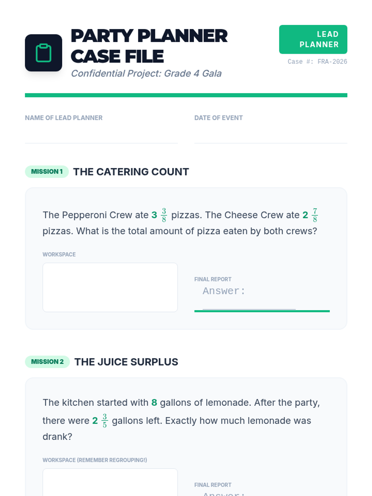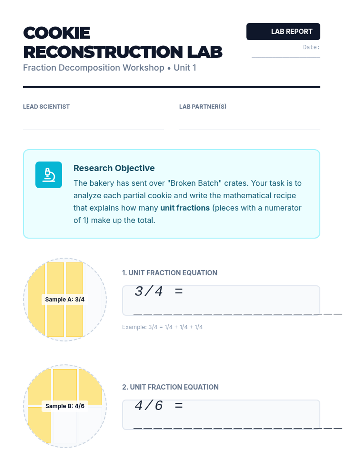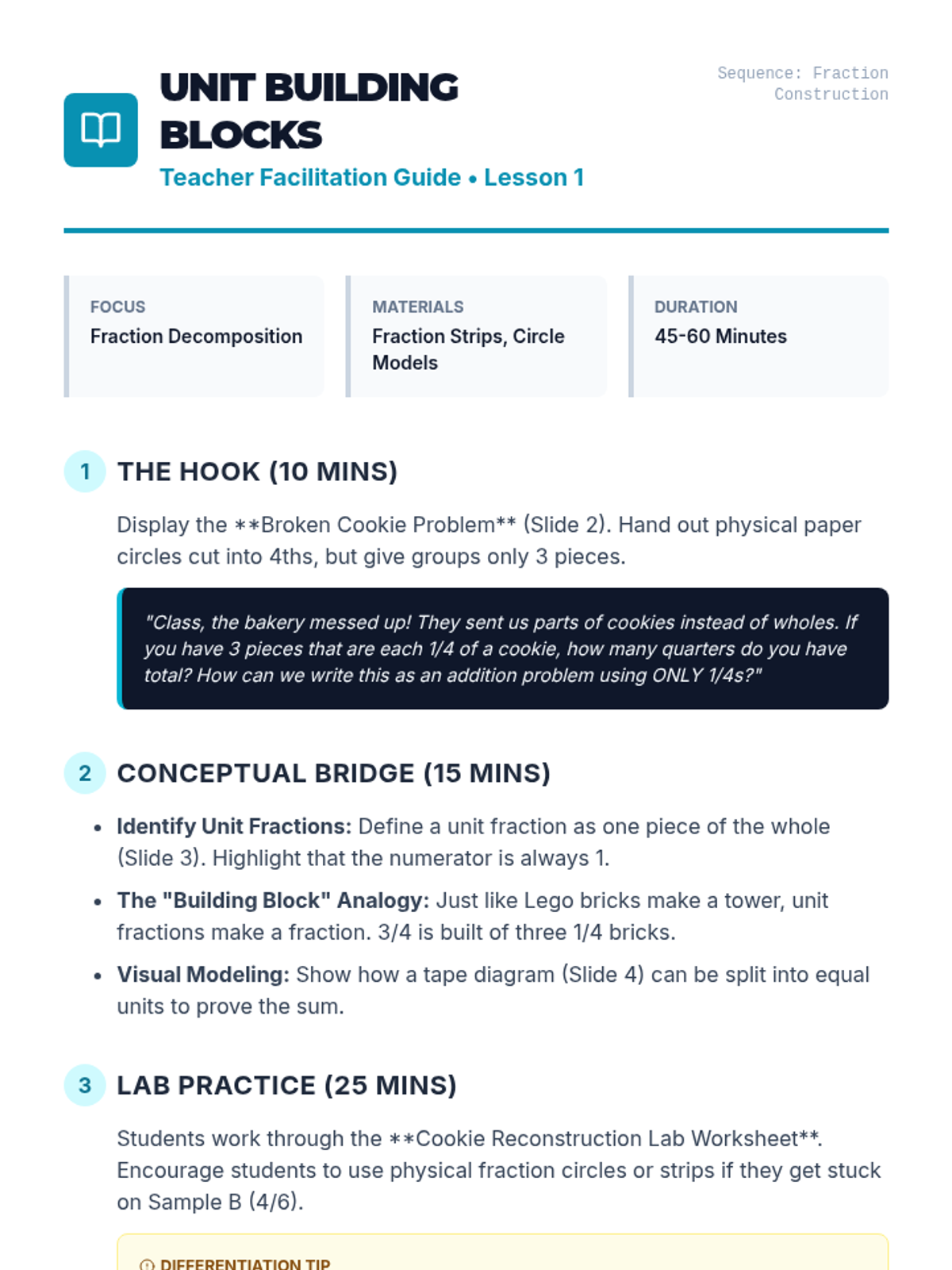 A comprehensive workshop-style sequence for 4th graders to master adding and subtracting fractions with like denominators, moving from concrete decomposition to abstract mixed number operations. Students use visual models and real-world scenarios to build fluency and conceptual understanding.