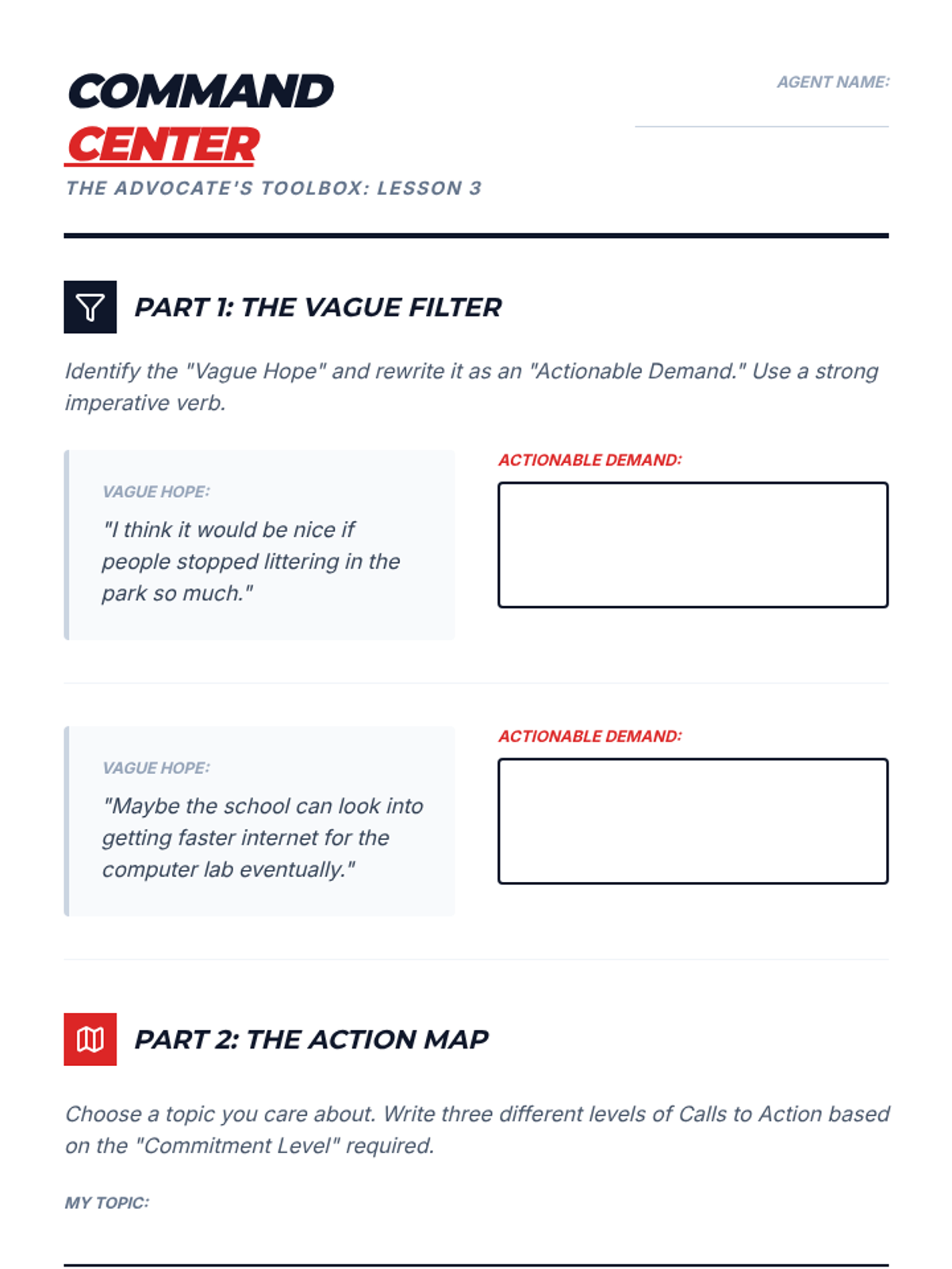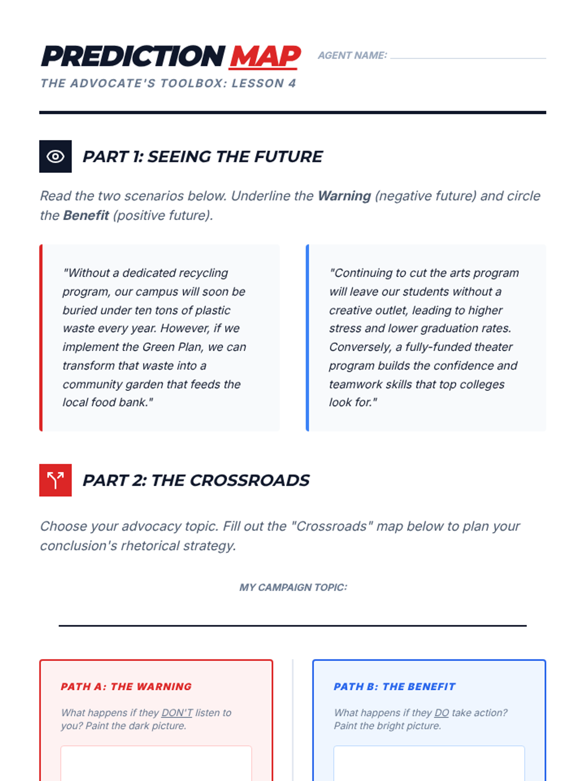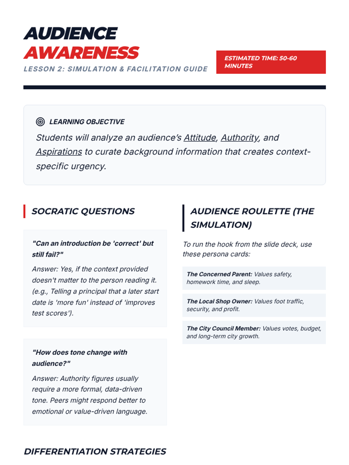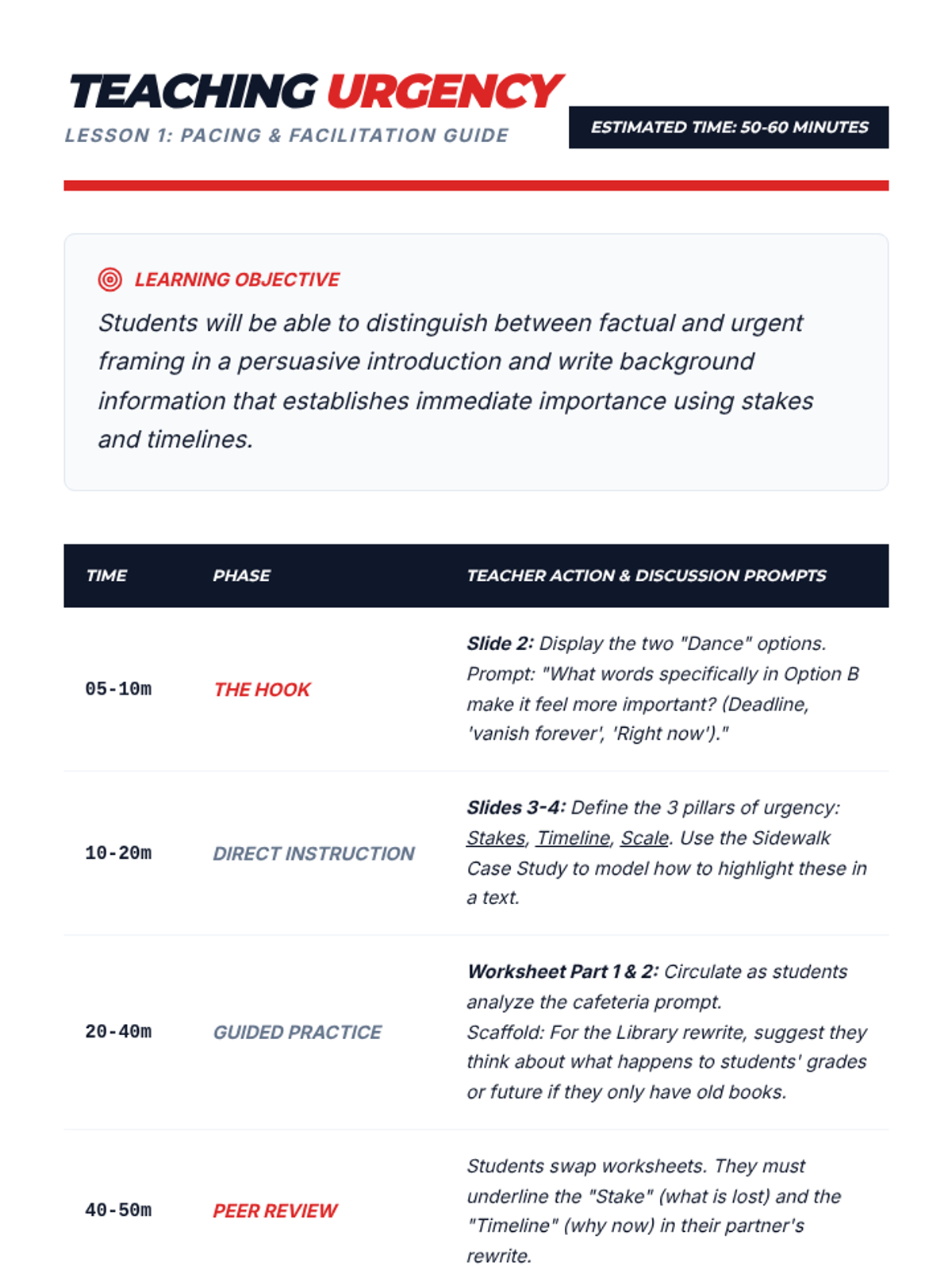 A 7th-grade ELA sequence focused on persuasive writing, specifically mastering high-impact introductions that establish urgency and conclusions that demand action. Students progress through a series of lessons leading to a simulated advocacy campaign.