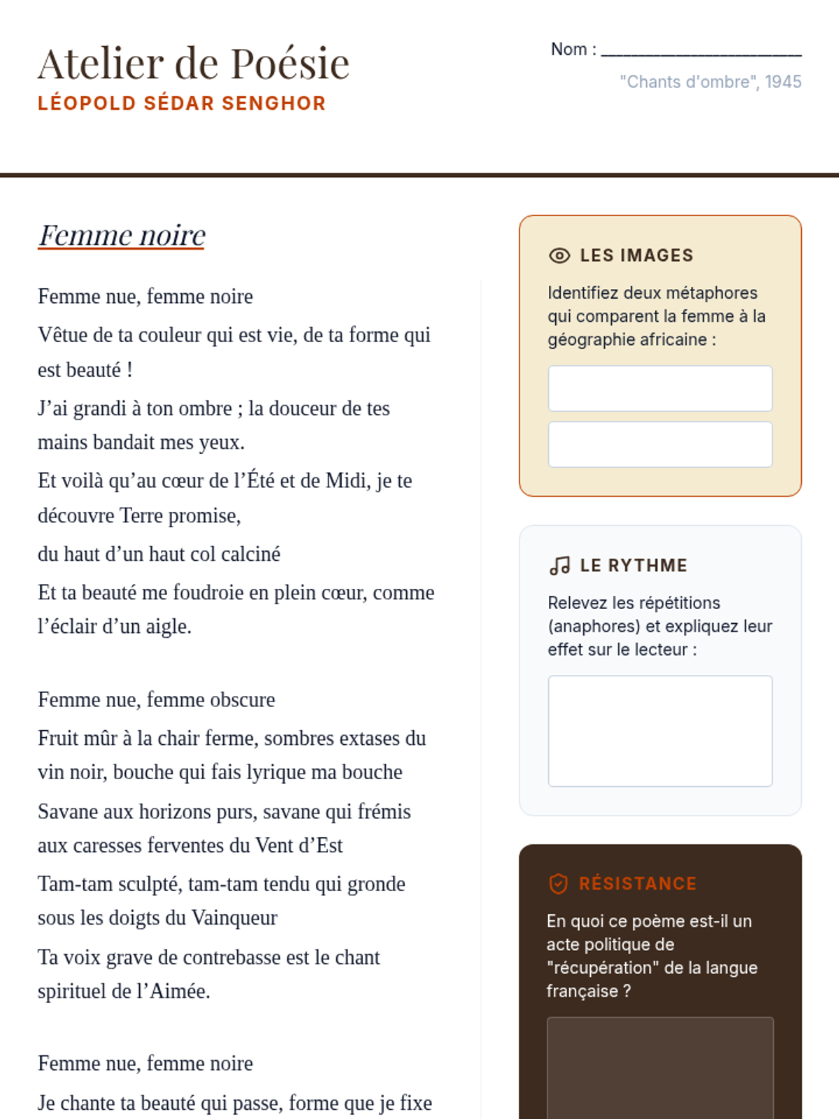 This advanced French sequence explores West African literary identity through the Négritude movement and post-colonial literature. Students analyze how authors like Senghor and Laye repurposed the French language to assert cultural independence, moving from the celebration of African heritage to critical examinations of post-independence tensions.