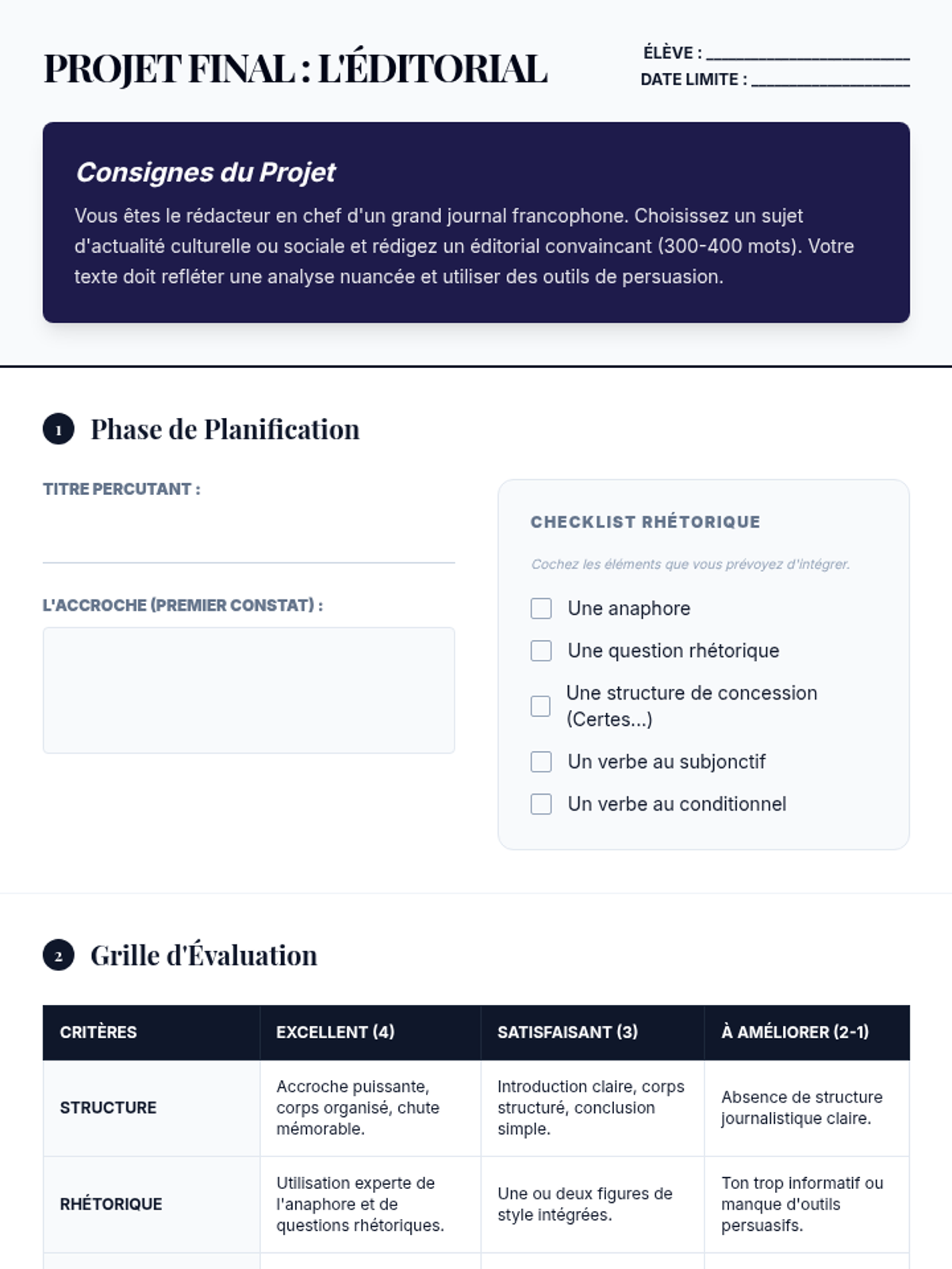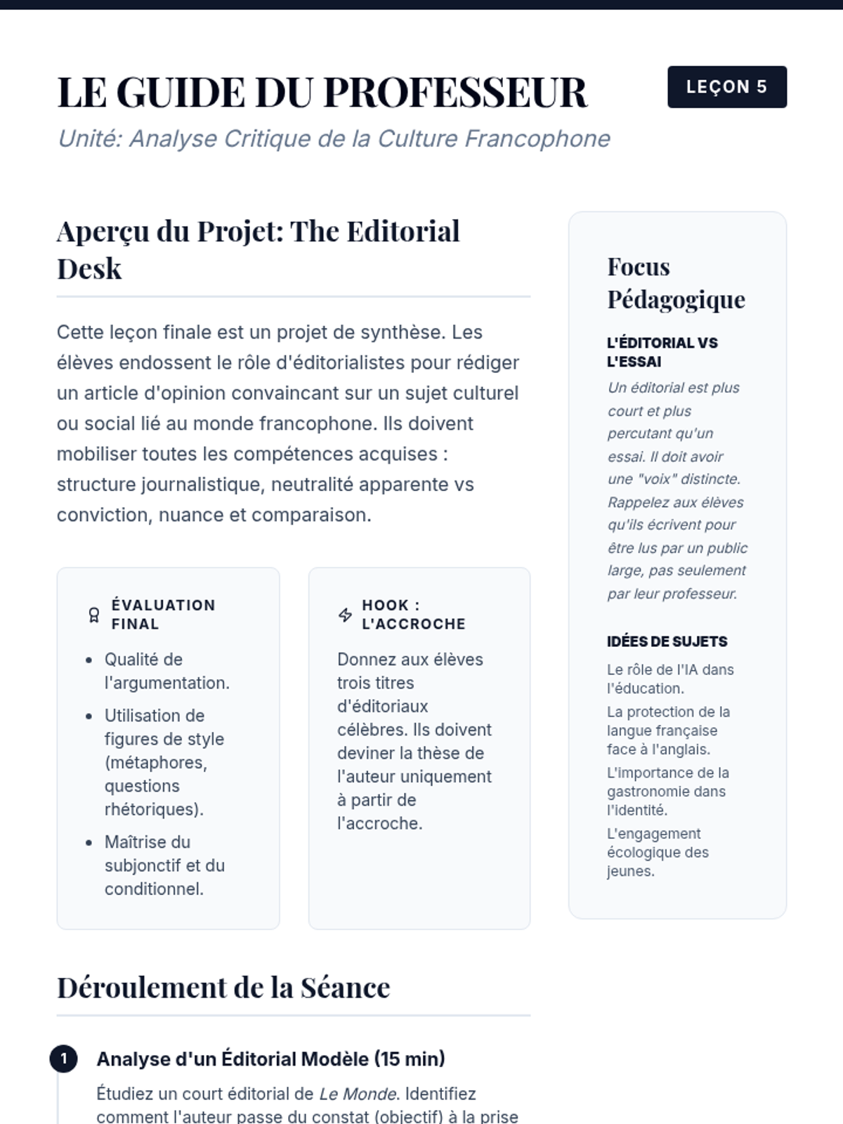 A high-level intermediate French writing unit focused on media literacy, cultural synthesis, and persuasive writing. Students analyze journalistic styles from the Francophone world to develop their own critical voices in French.