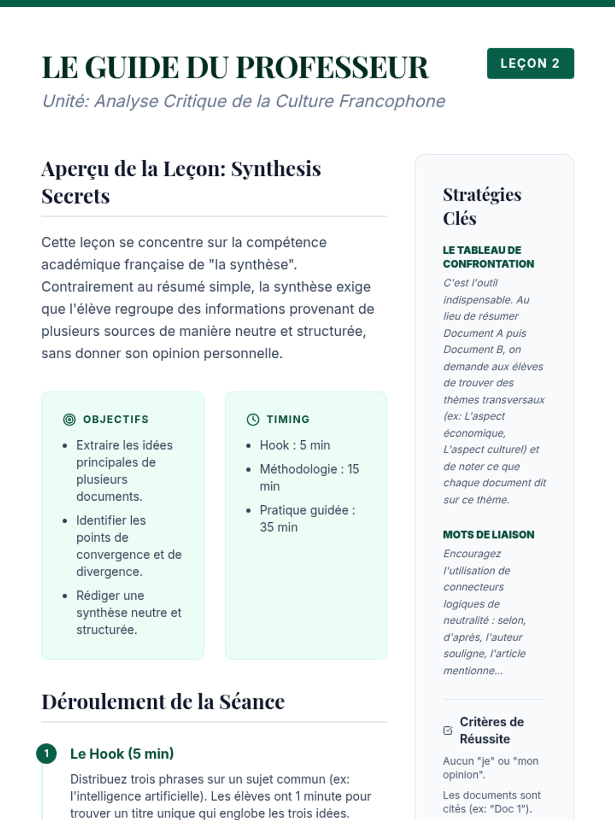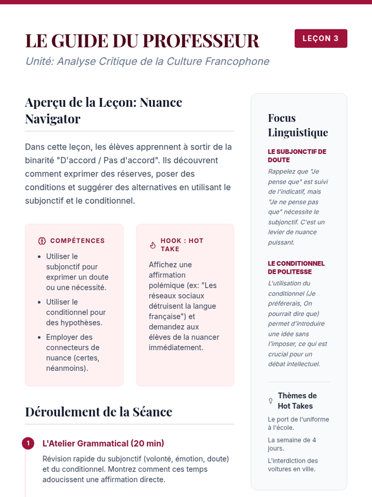 This sequence immerses graduate students in the landscape of contemporary French journalism, focusing on current events and social debates. Students move from identifying the structural components of news articles to analyzing complex opinion pieces and synthesizing multiple perspectives on sensitive topics like secularism.