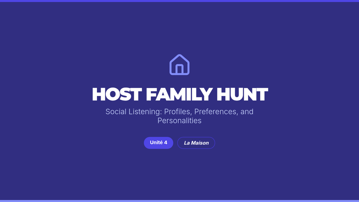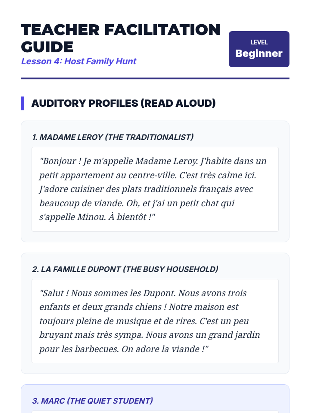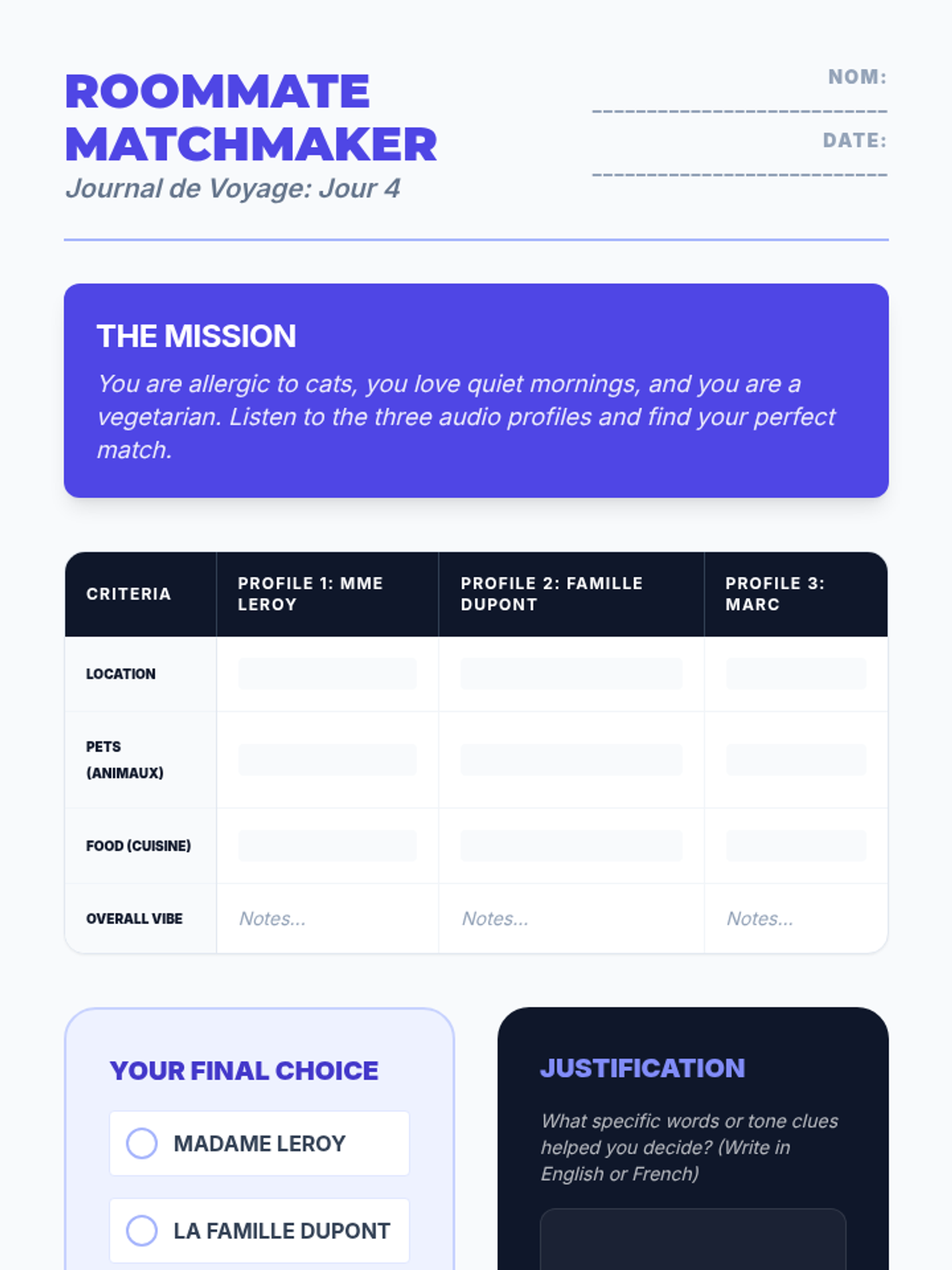 A beginner French listening sequence where students act as social observers, analyzing registers, personal details, family structures, and preferences through auditory scripts.