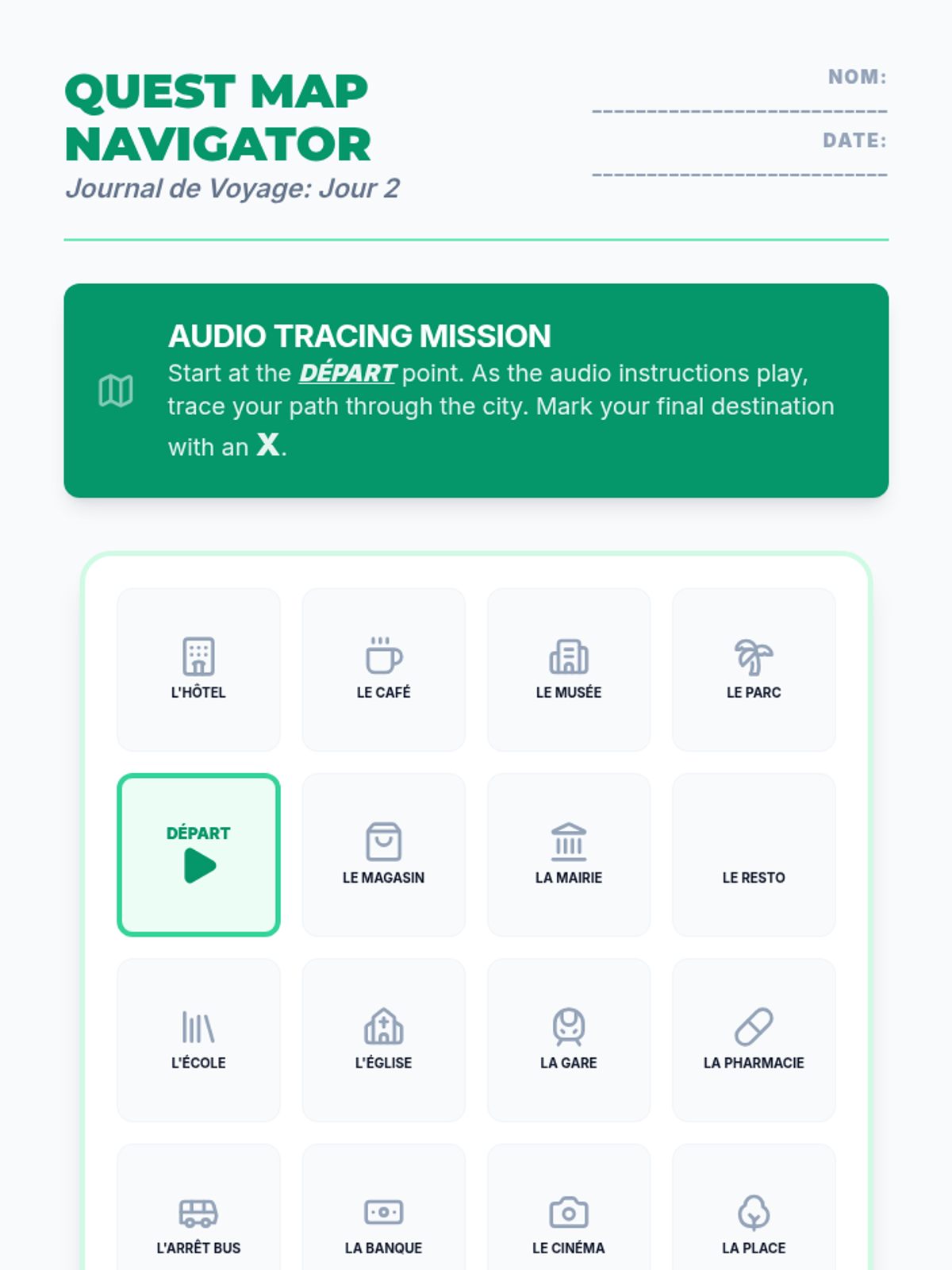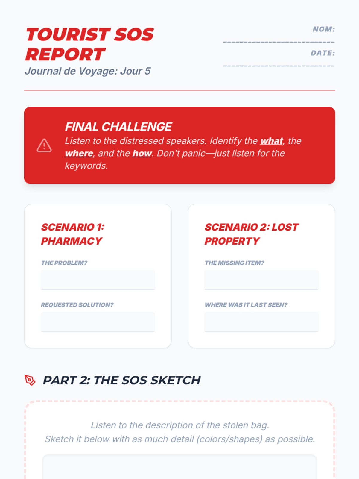 A high-stakes travel simulation building French listening proficiency in logistics: numbers, time, prices, and directions. Students navigate virtual 'survival' scenarios where accurate information processing is the key to a successful journey.