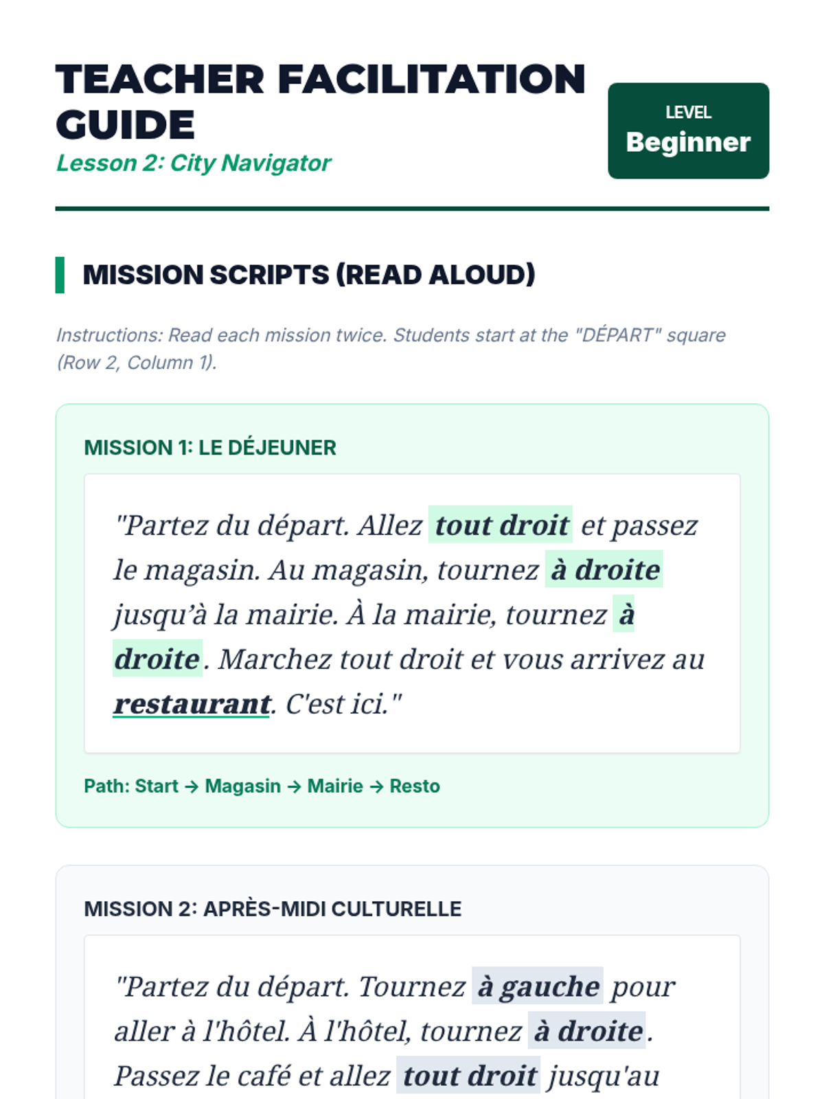 An inquiry-based French listening sequence for beginners focusing on functional navigation of public spaces in Francophone cities. Students learn to filter essential information from ambient noise in transport, weather, street directions, retail, and emergency contexts.