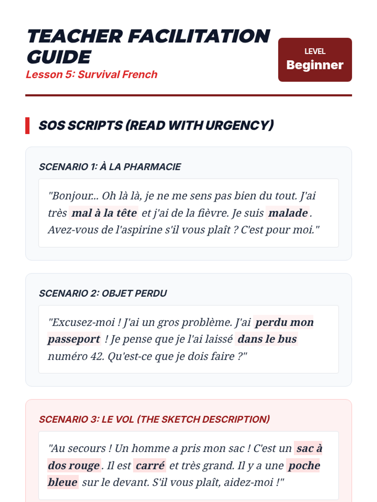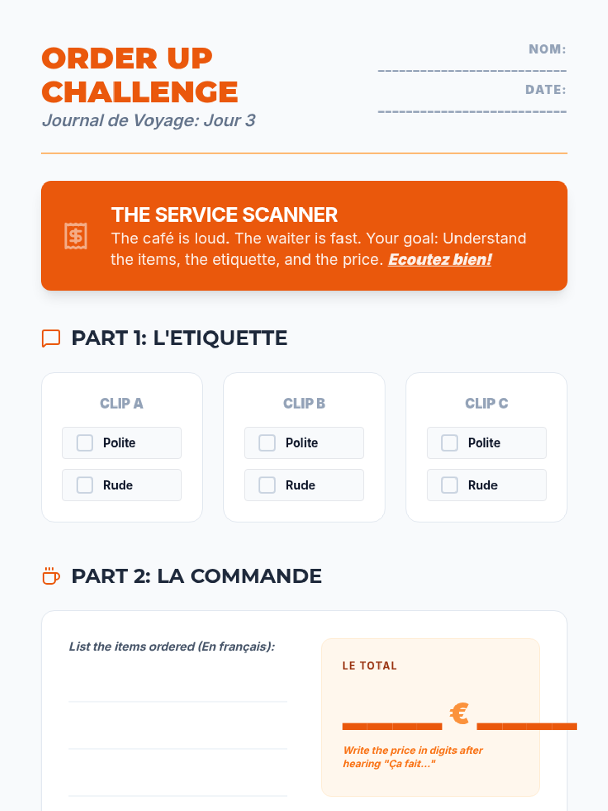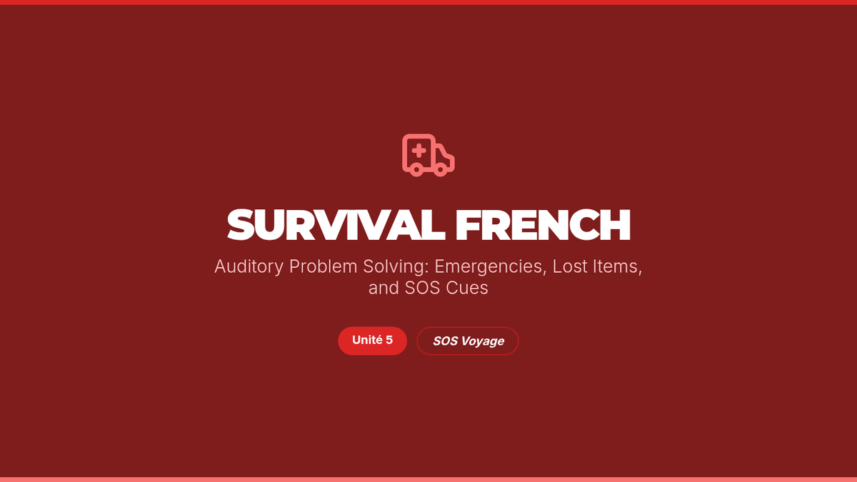 A five-day auditory immersion for high school seniors to master the essential listening skills required for navigating a French-speaking city, from airport announcements to social interactions and emergency responses.