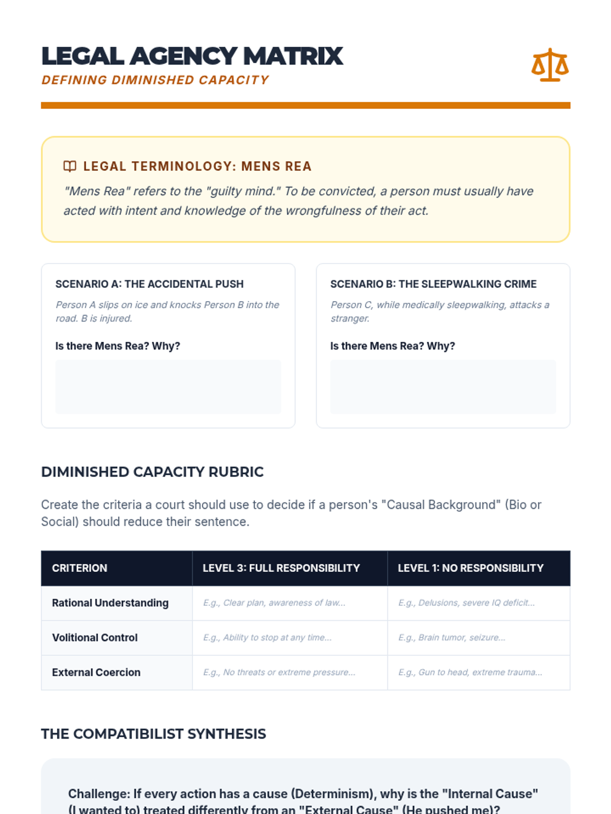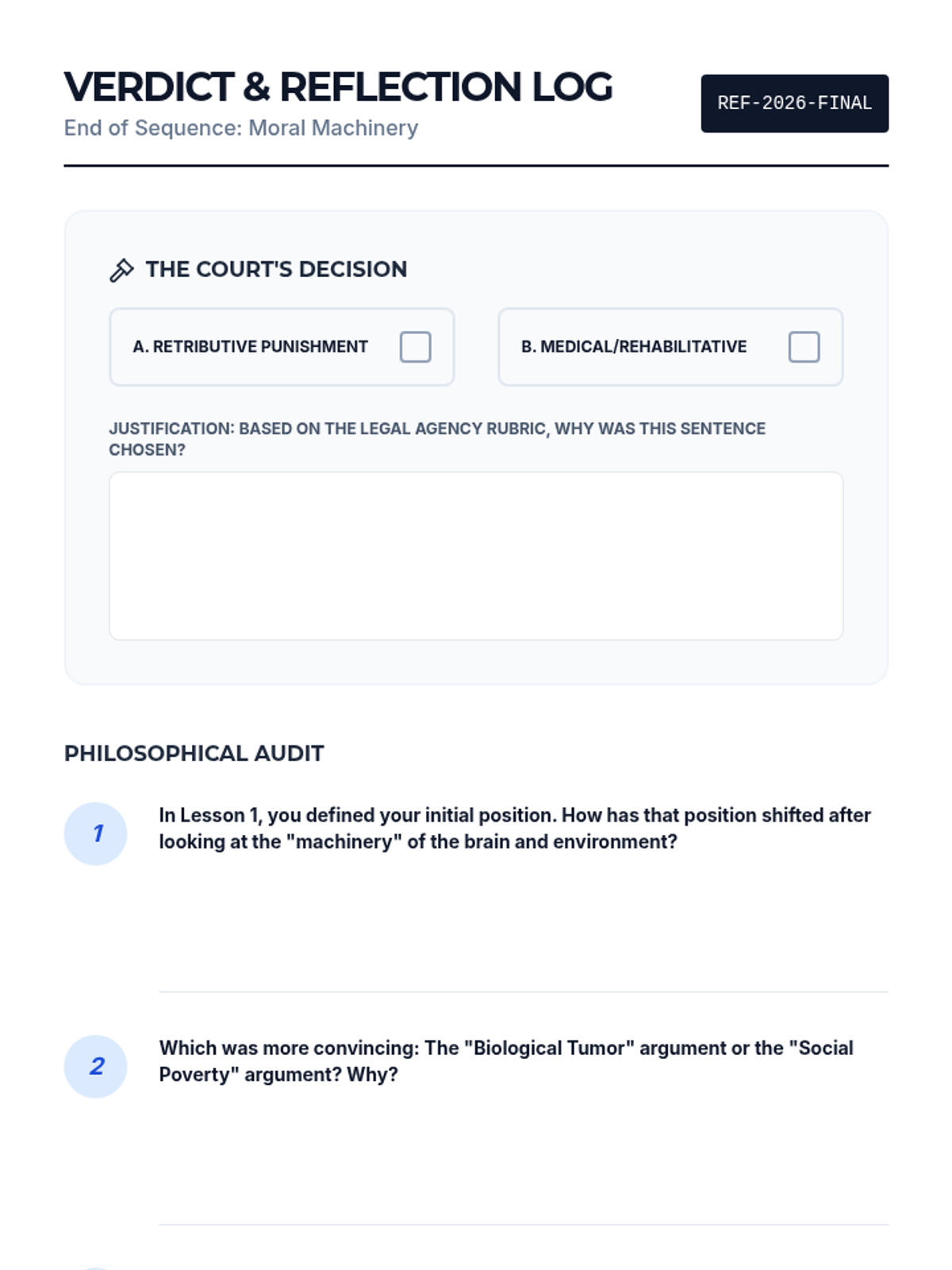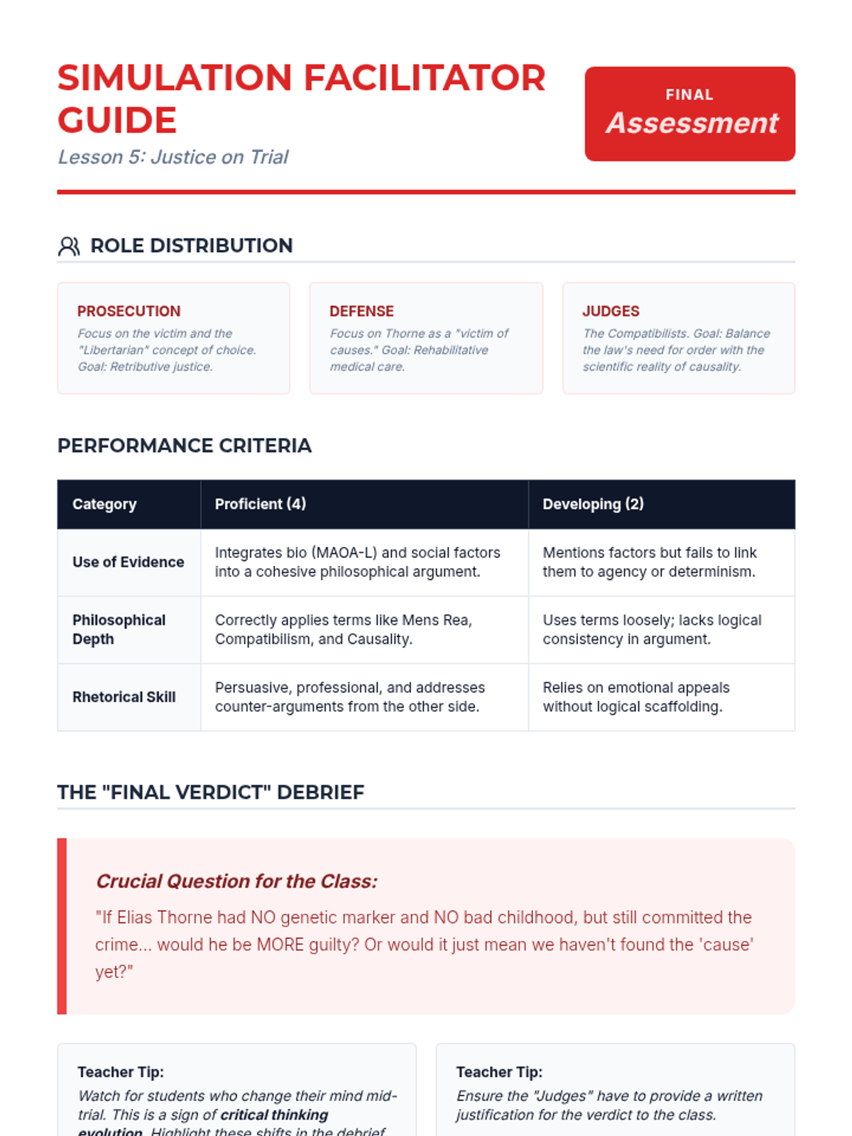 A comprehensive 12th-grade philosophy and ethics sequence exploring the tension between free will and determinism, culminating in a legal sentencing simulation. Students analyze metaphysical, biological, and sociological arguments to determine the extent of human agency and moral responsibility.