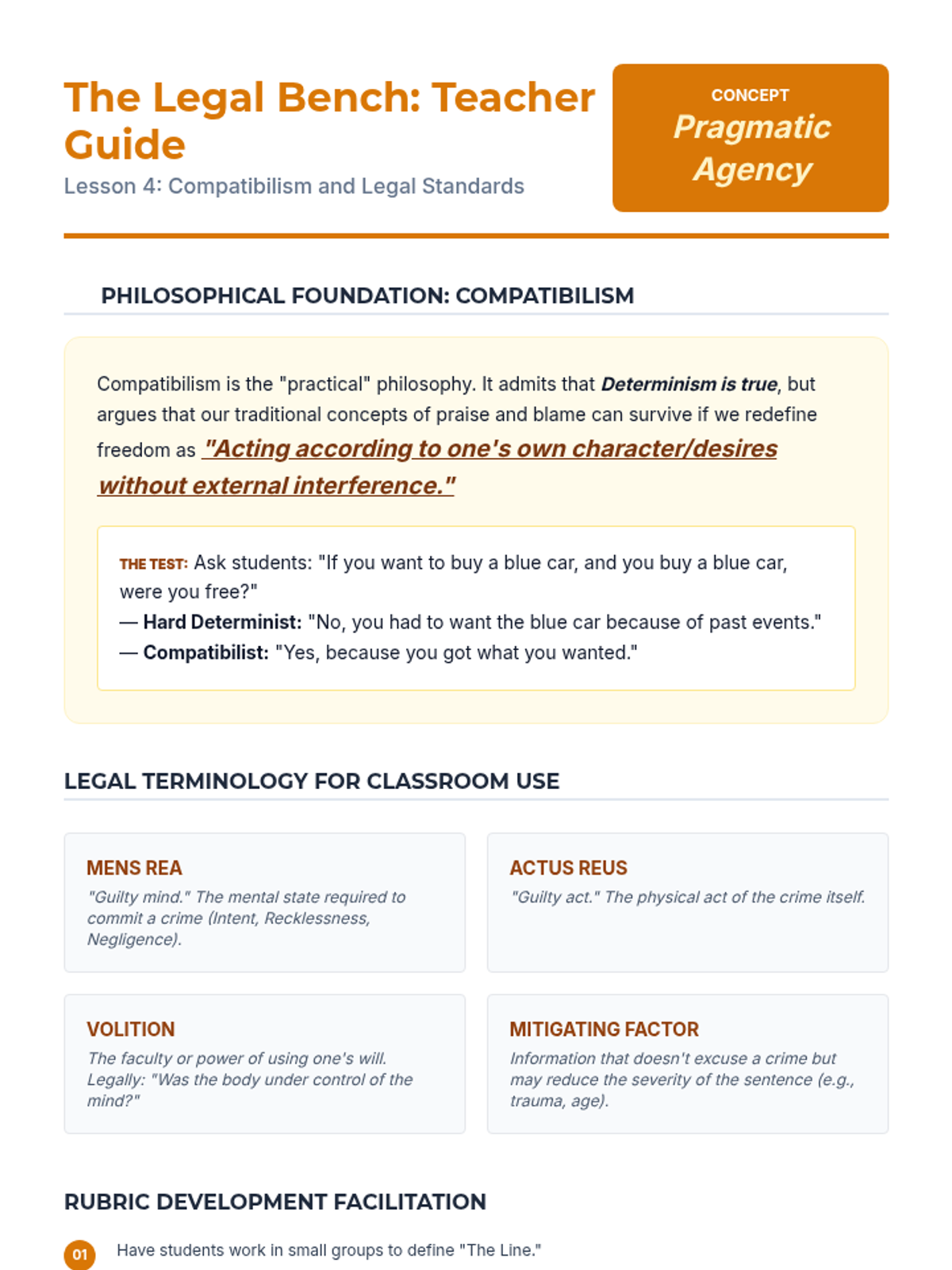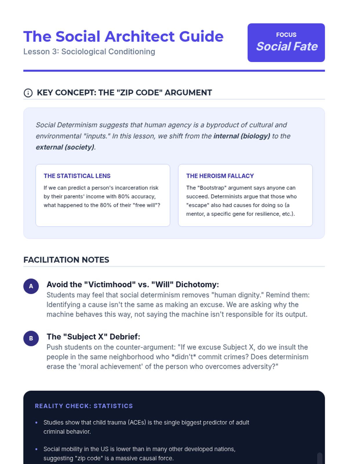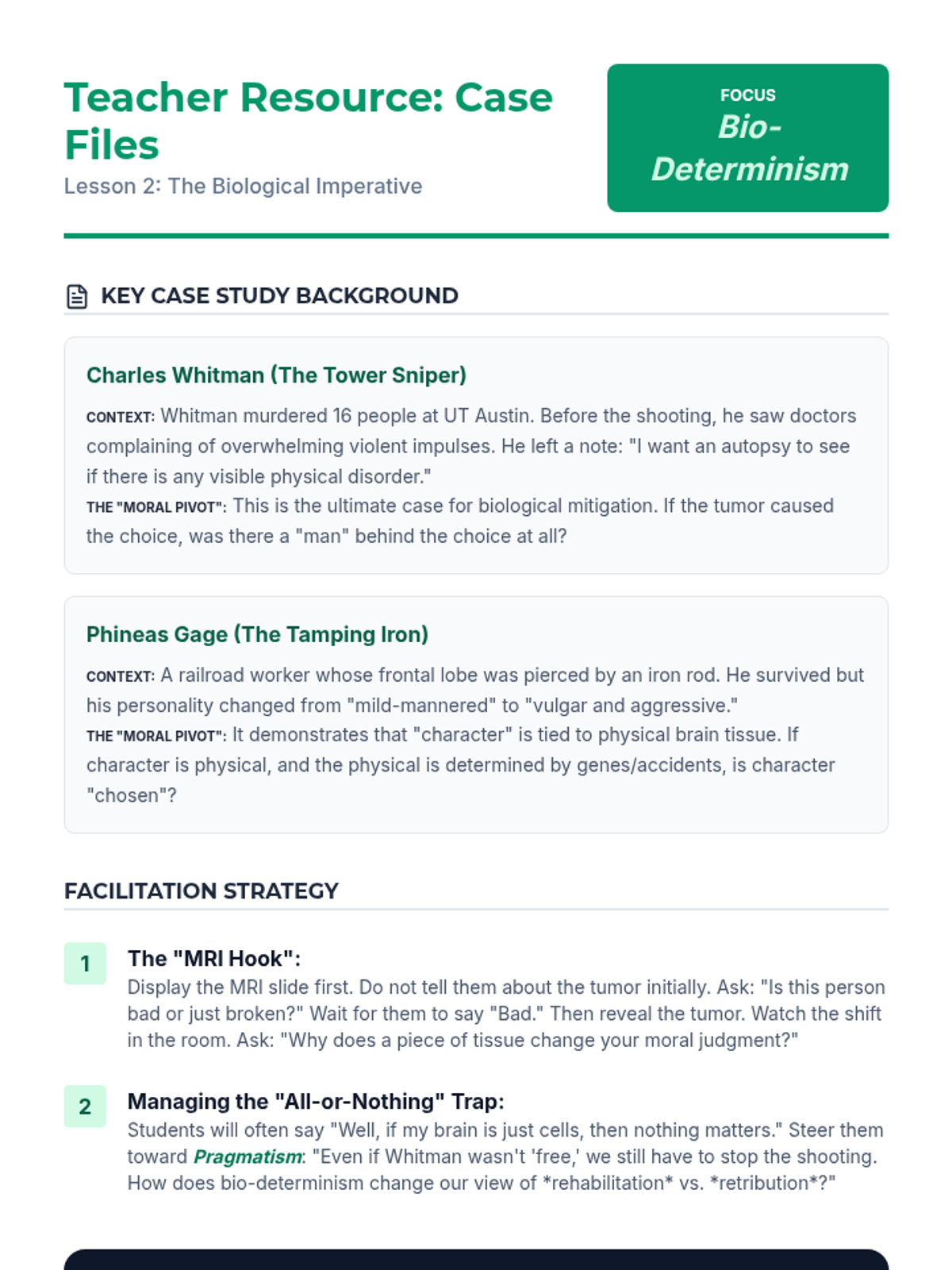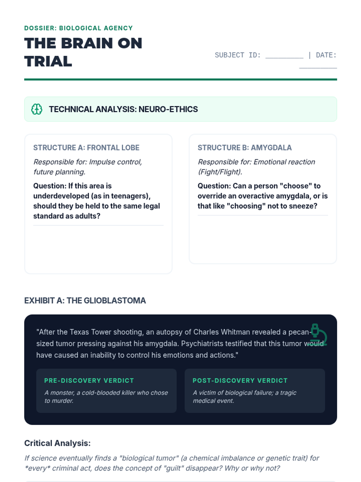 A comprehensive 12th-grade philosophy and ethics sequence exploring the tension between free will and determinism, culminating in a legal sentencing simulation. Students analyze metaphysical, biological, and sociological arguments to determine the extent of human agency and moral responsibility.