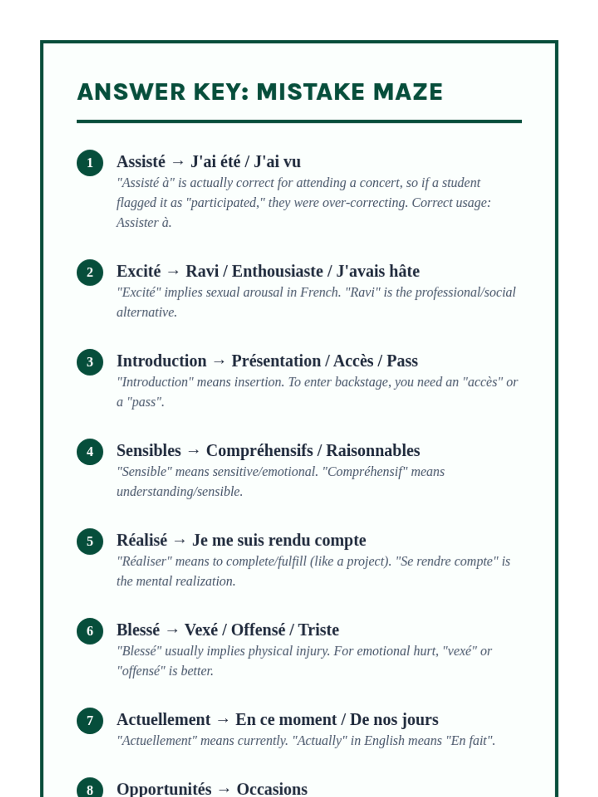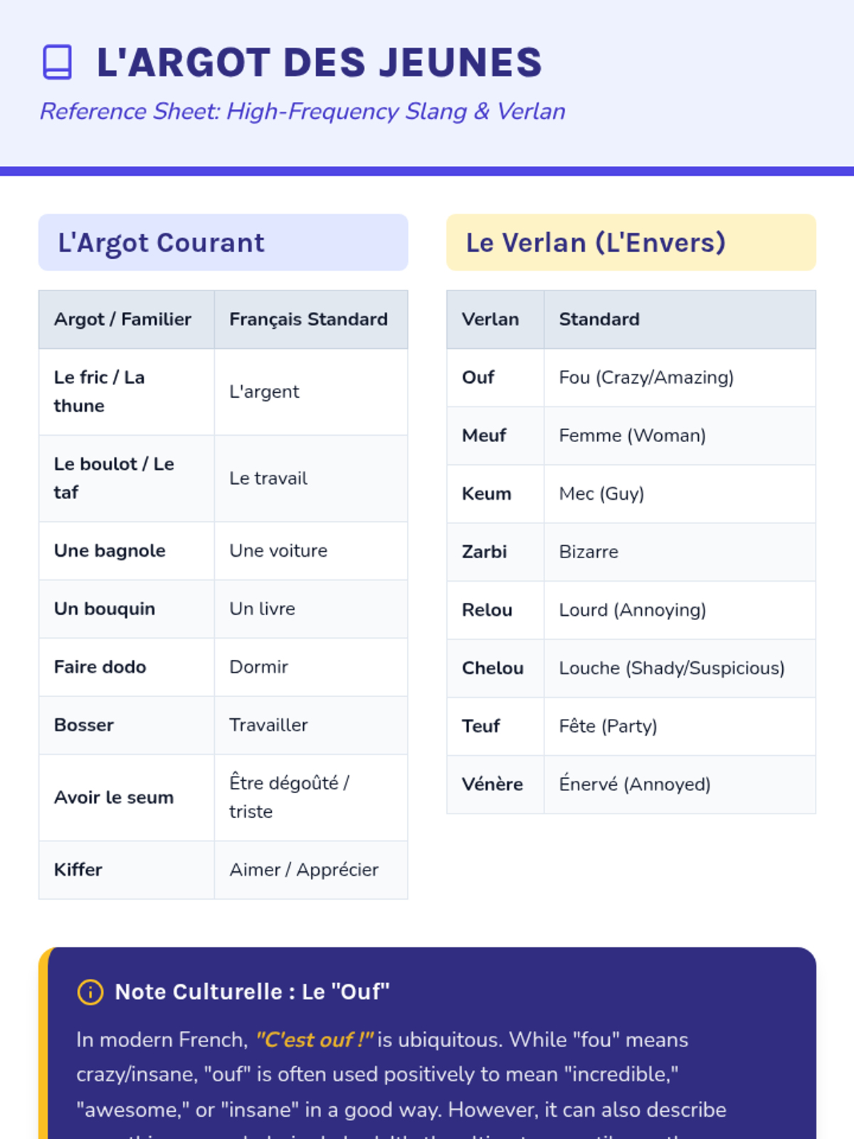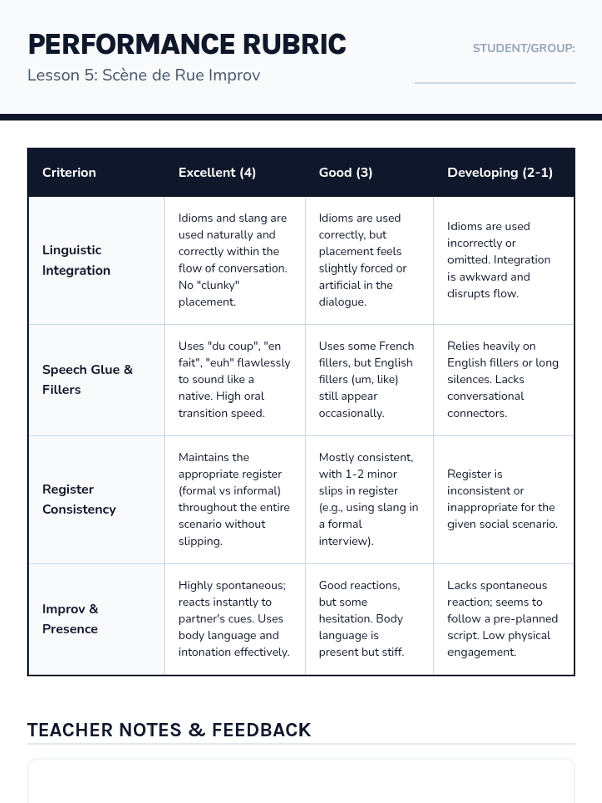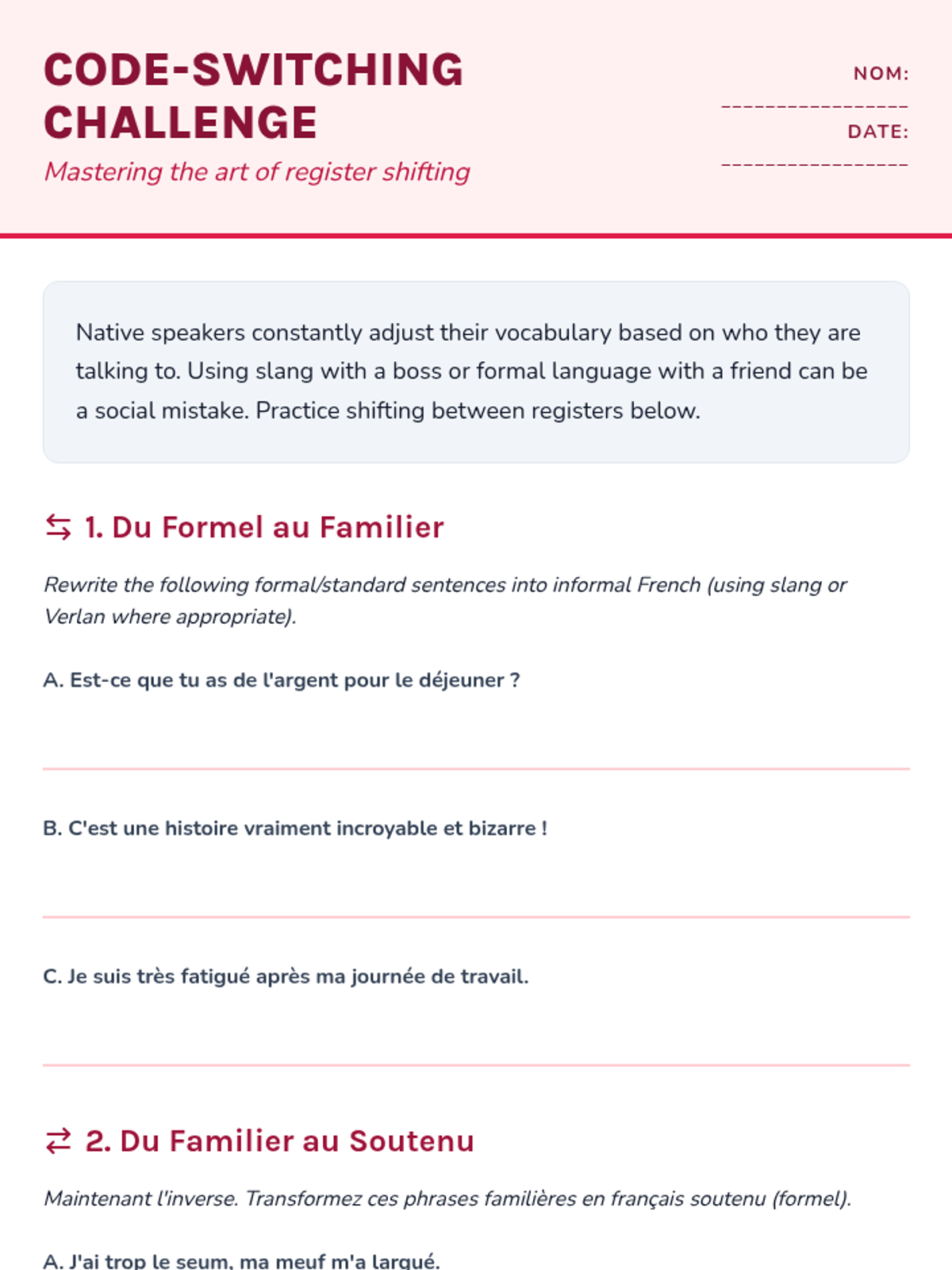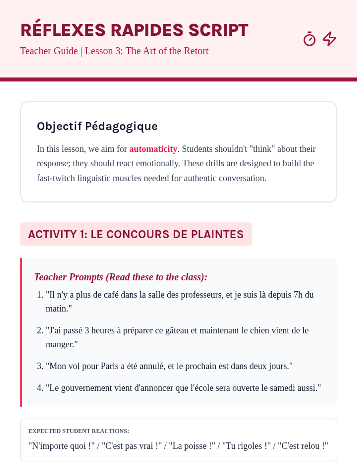 This advanced French sequence transforms students from 'textbook speakers' into natural conversationalists by mastering the idioms, slang, and cultural metaphors that define native speech. Through game-based activities, students explore register shifting, rapid-fire retorts, and the nuances of 'faux amis' to build authentic fluency.
