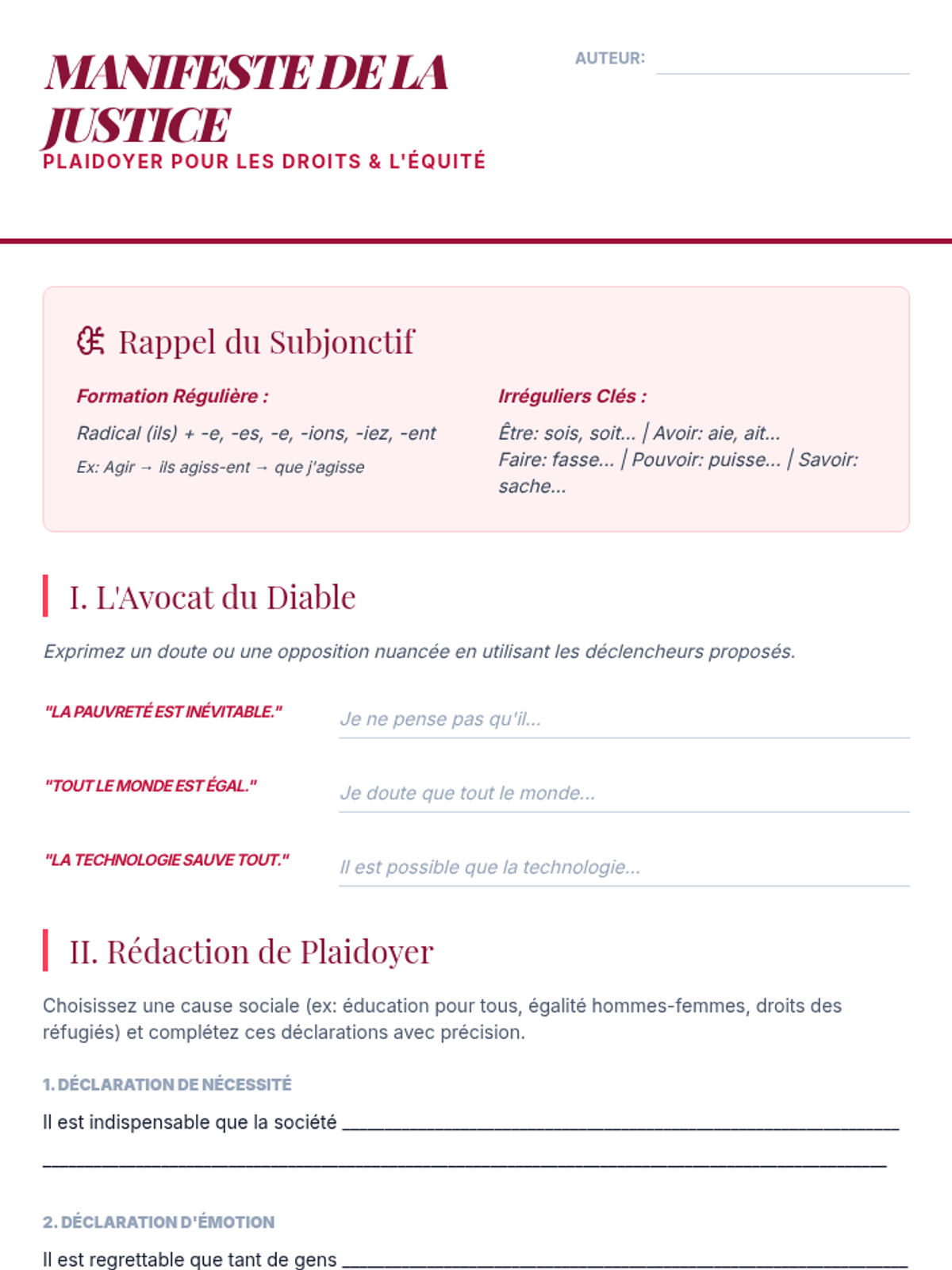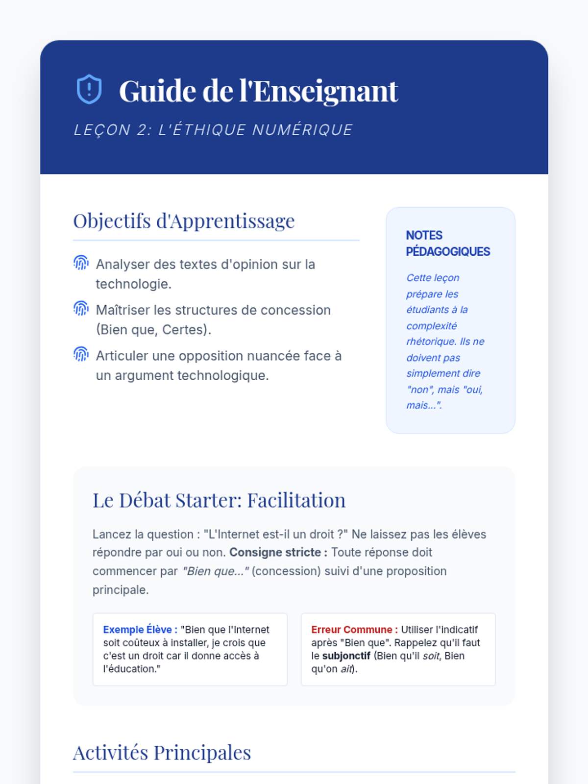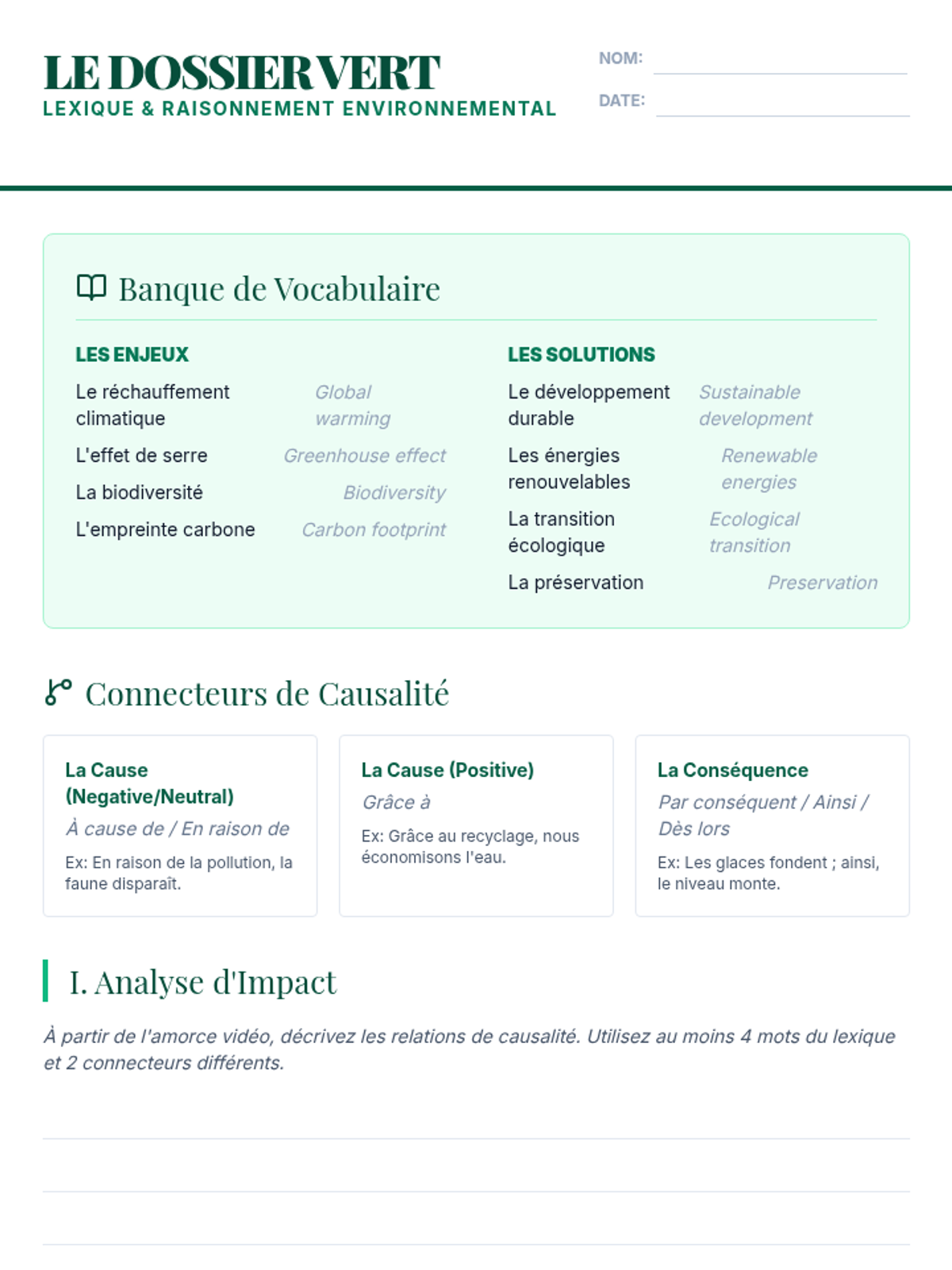 This intermediate French sequence empowers 11th-grade students to articulate complex arguments on pressing global issues. By mastering thematic vocabulary (environment, technology, social justice) and sophisticated rhetorical connectors, students transition from simple descriptions to nuanced persuasion, culminating in a formal structured debate.