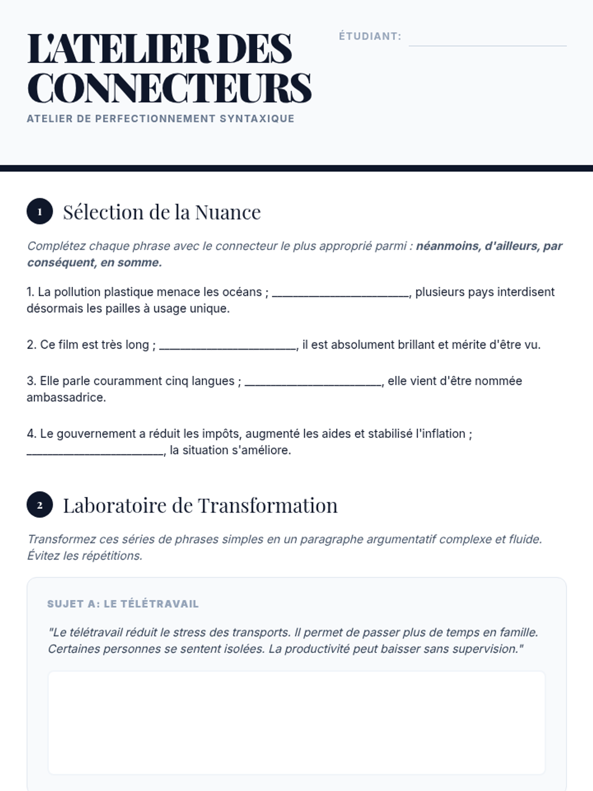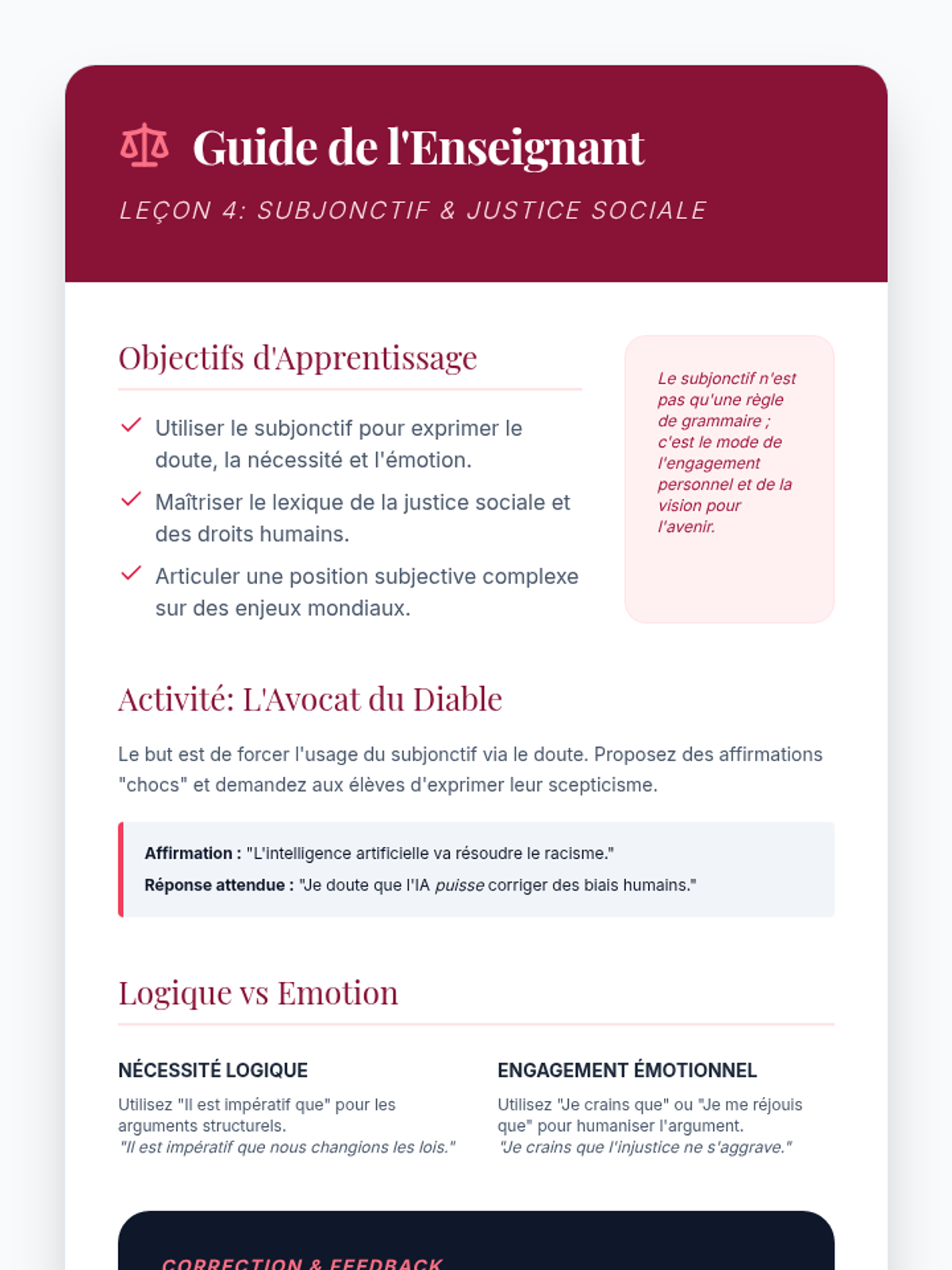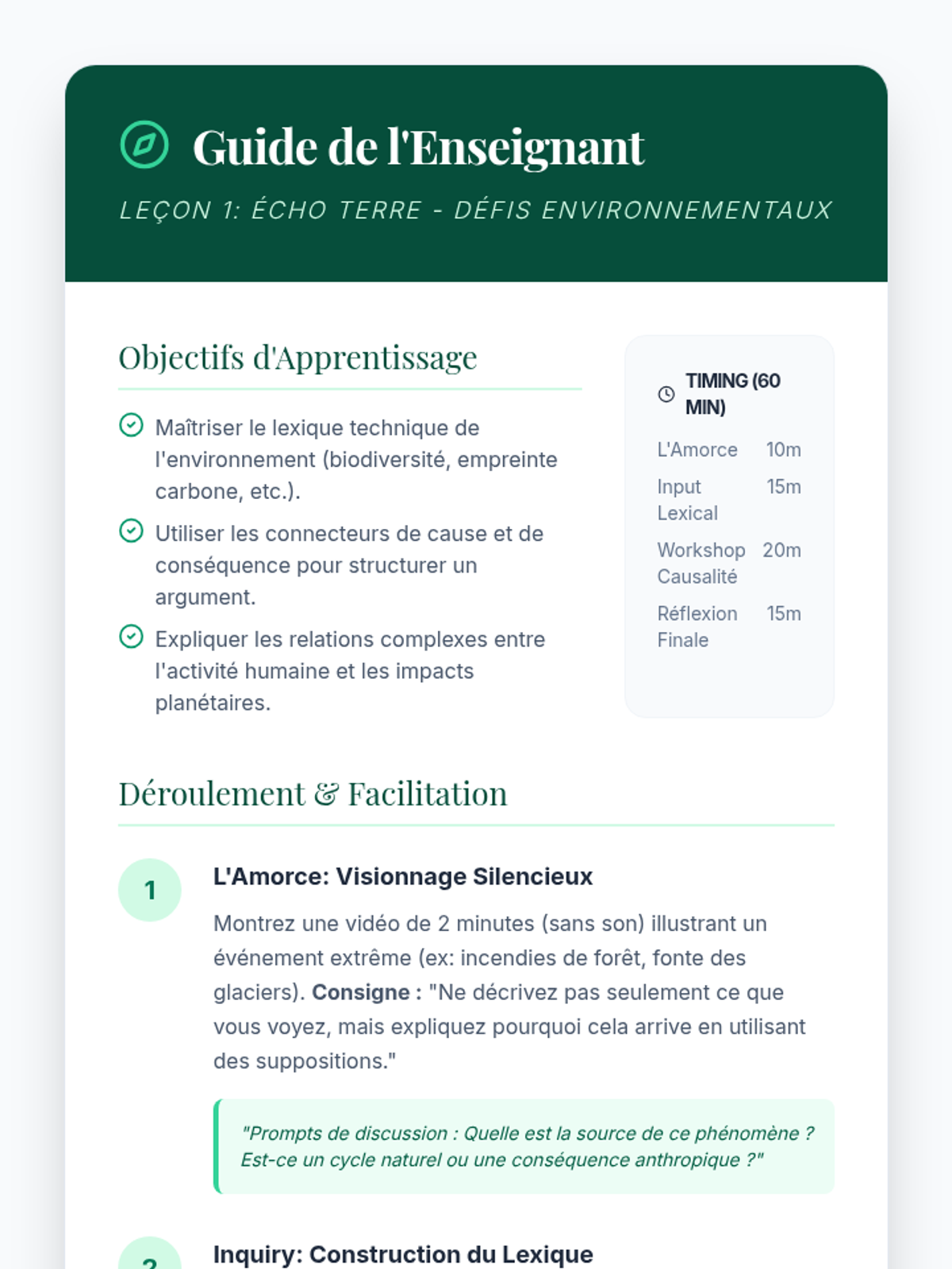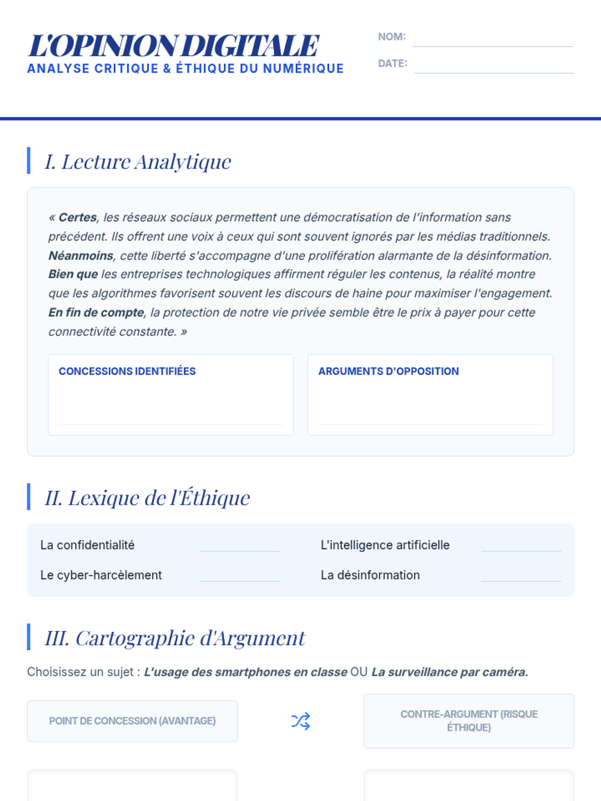 This intermediate French sequence empowers 11th-grade students to articulate complex arguments on pressing global issues. By mastering thematic vocabulary (environment, technology, social justice) and sophisticated rhetorical connectors, students transition from simple descriptions to nuanced persuasion, culminating in a formal structured debate.