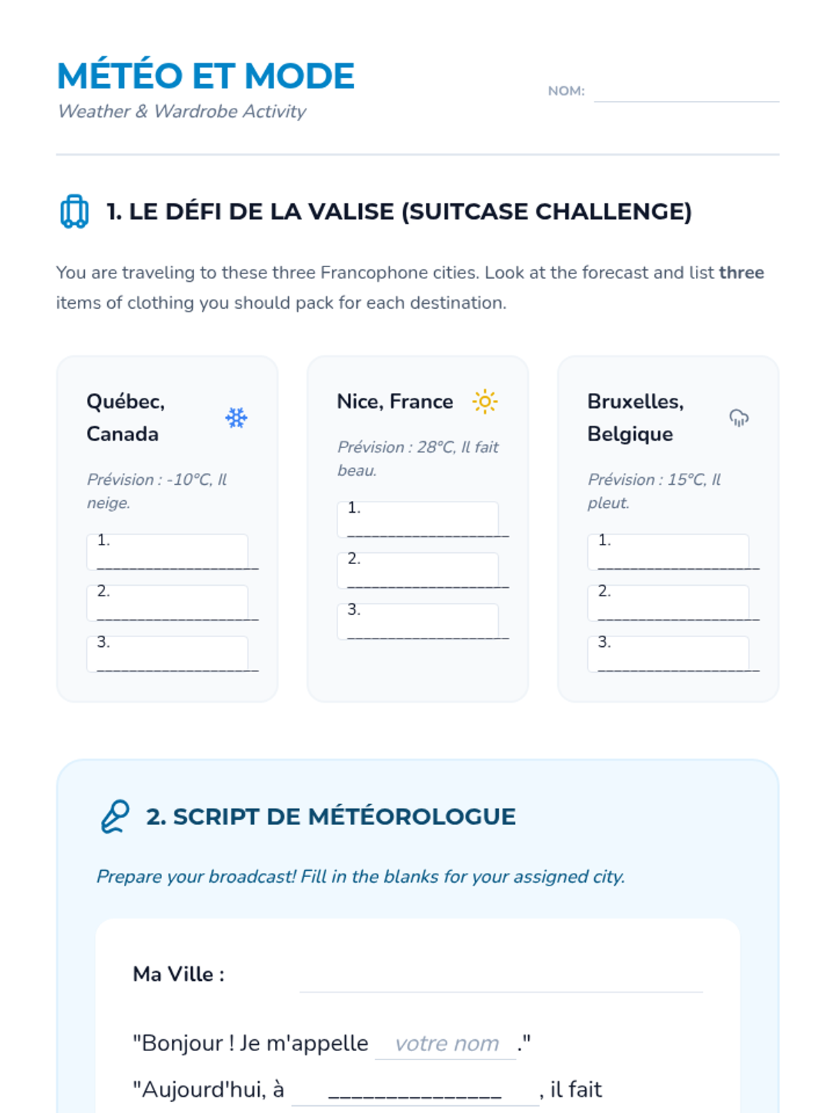 An immersive intermediate French sequence where students navigate travel scenarios in Paris, Dakar, and Montreal, mastering future, past, and conditional tenses through simulated real-world interactions.