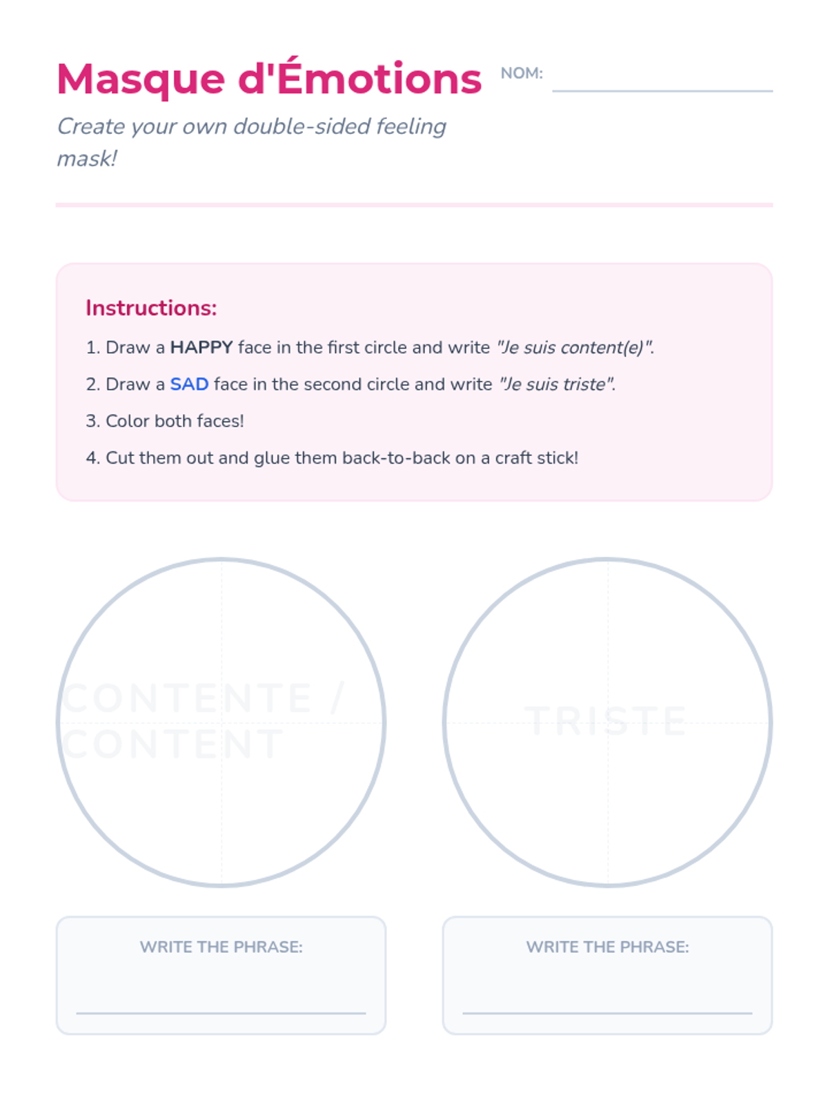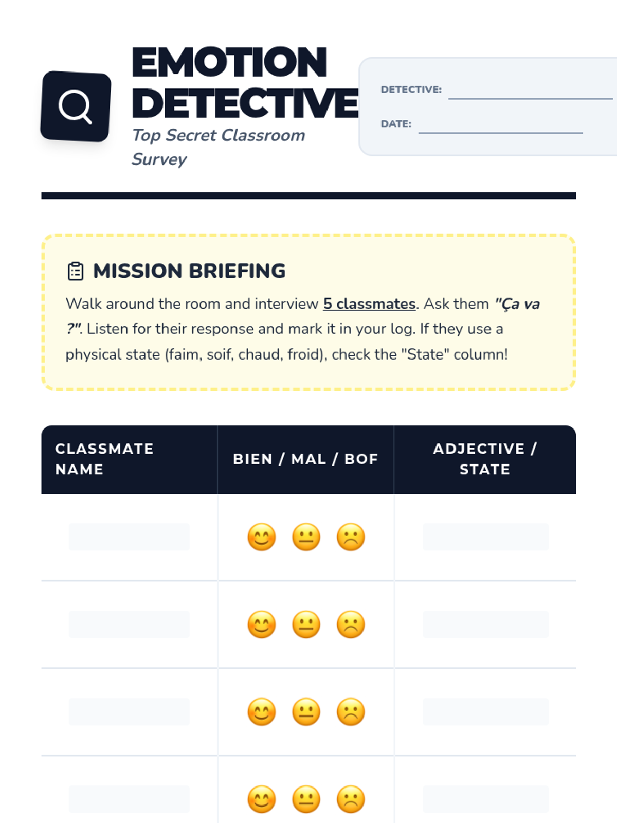This sequence introduces 3rd-grade students to basic French communication centered on emotions and physical states. Students progress from simple greetings to expressing specific needs and sensations, culminating in a class-wide survey project.