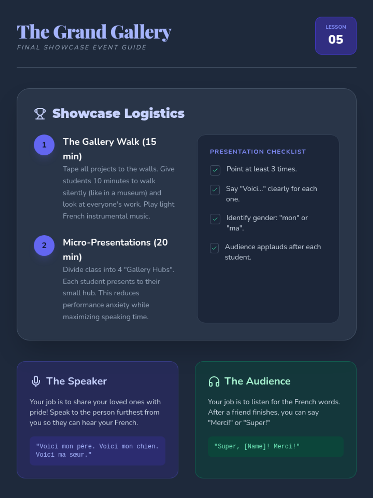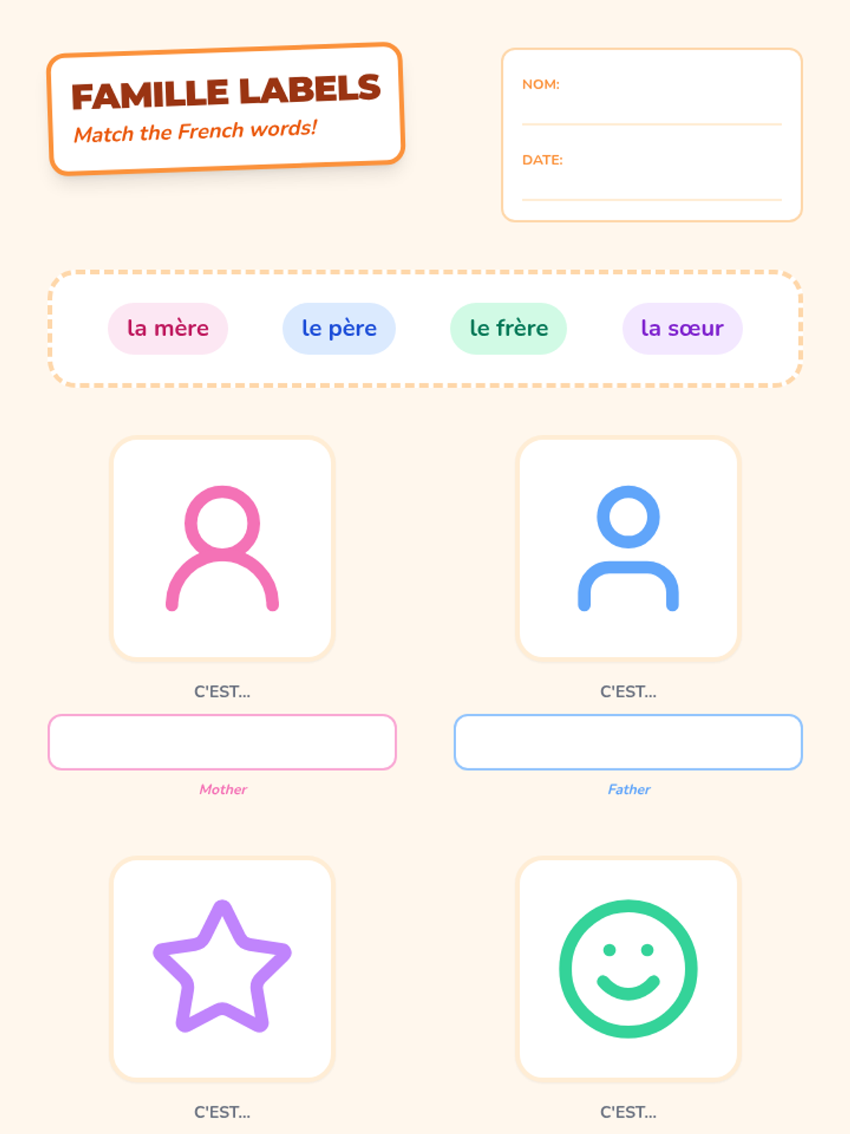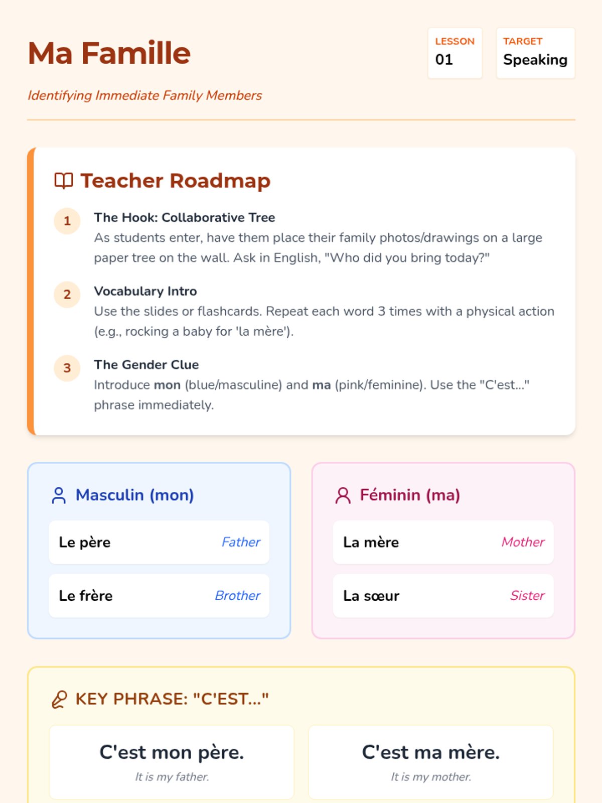 A 5-lesson introductory French sequence for 2nd graders focused on vocabulary for family members and pets, culminating in a 'Circle of Loved Ones' presentation project. Students learn to use 'mon/ma' and 'Voici' through interactive games, songs, and creative work.
