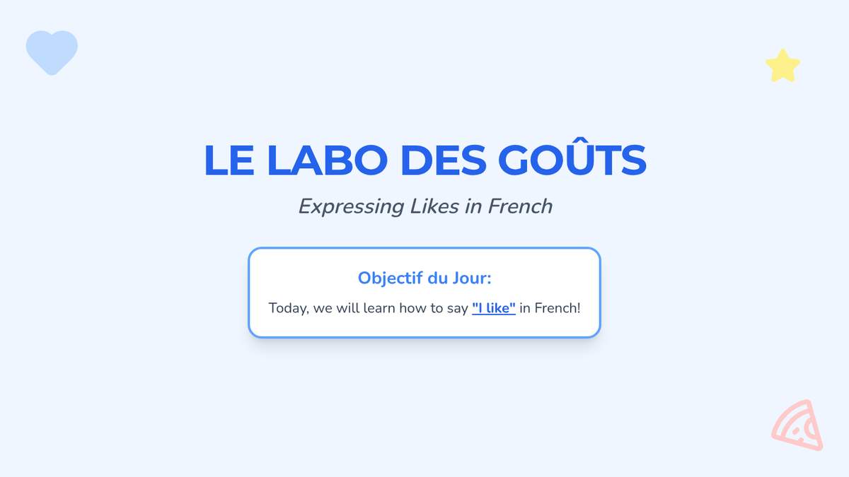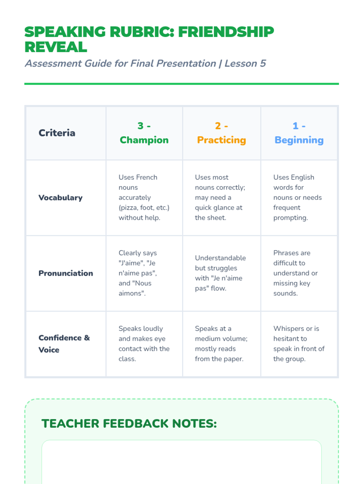 A beginner French speaking sequence for 3rd graders focused on expressing personal preferences using 'J'aime' and 'Je n'aime pas'. Students progress from simple statements to interactive surveys and comparing interests with peers.