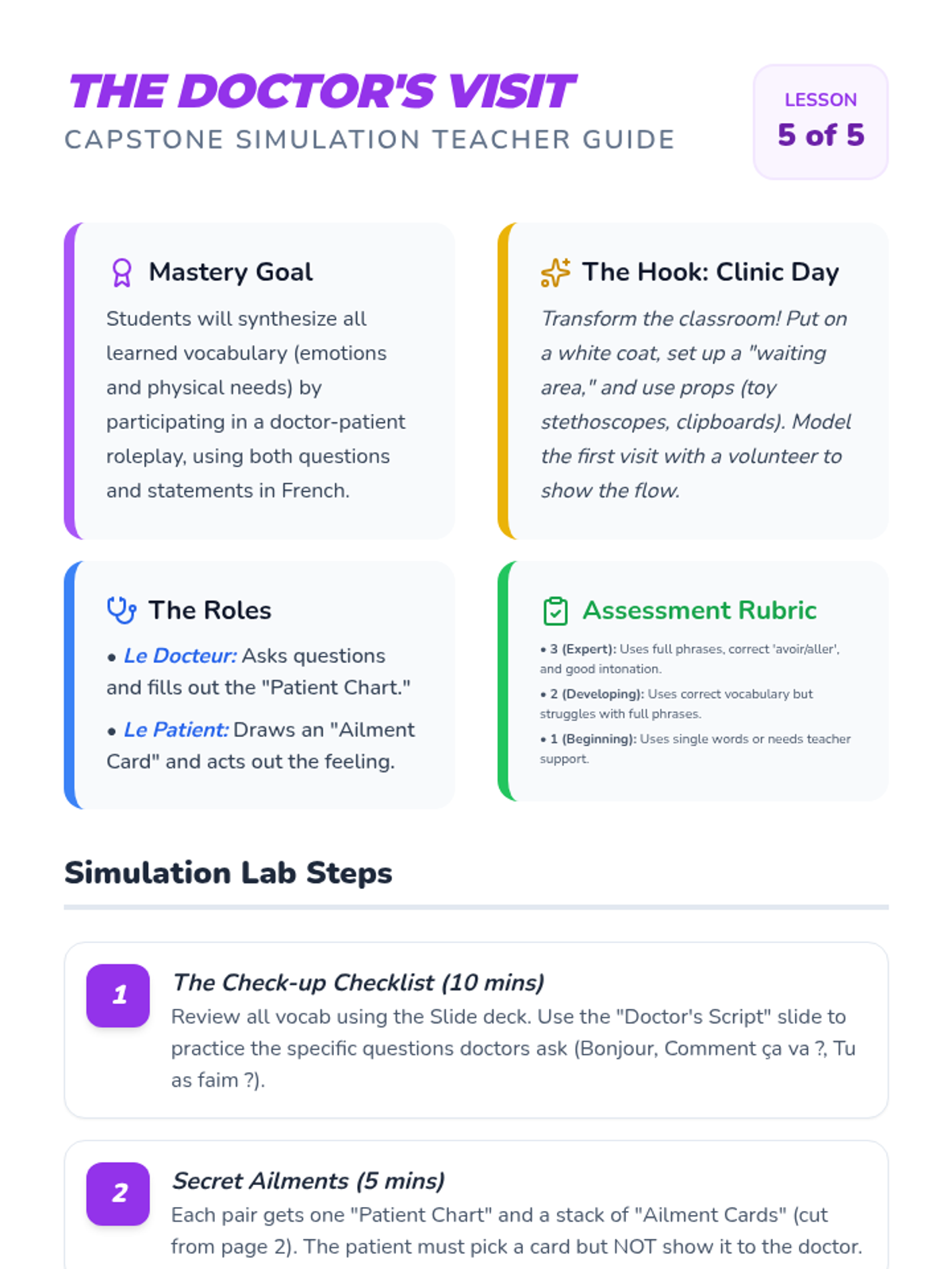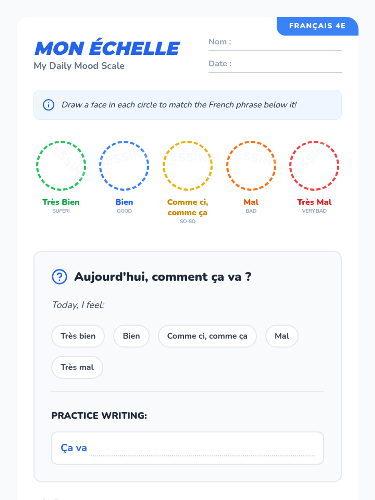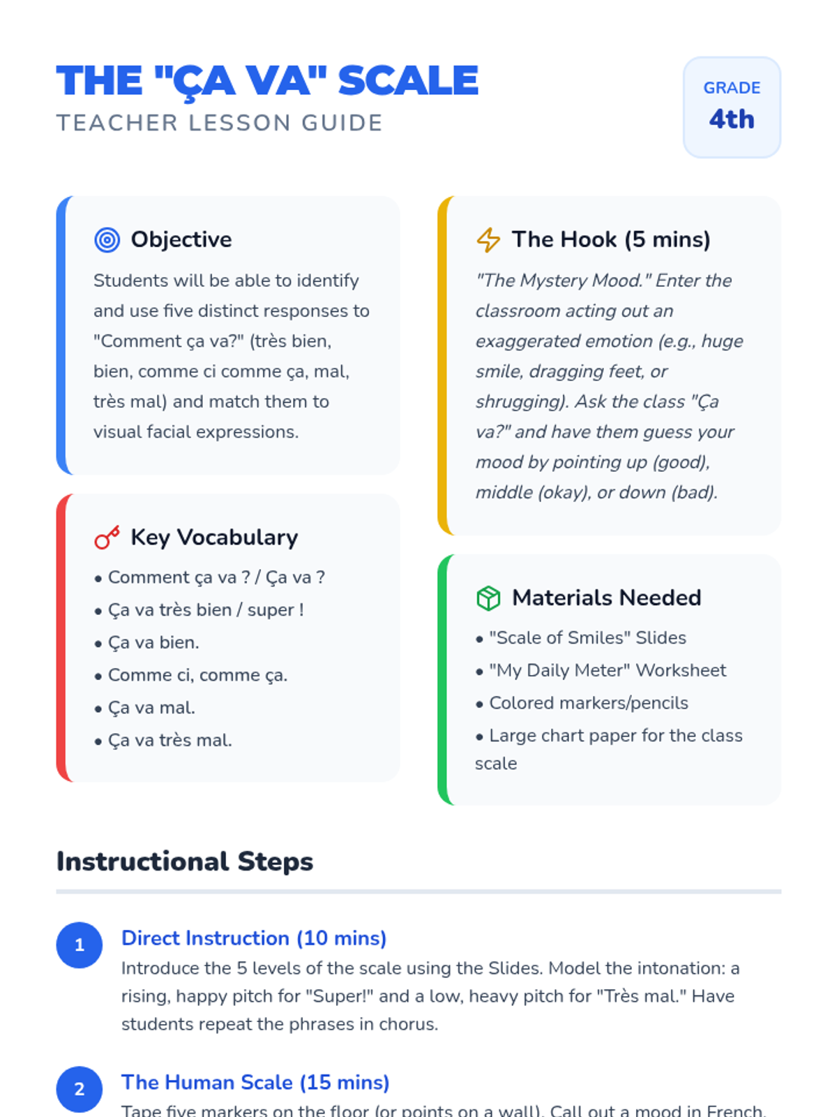 A 5-lesson sequence for 4th-grade French students focused on expressing emotions and physical needs. Students learn to use 'aller' and 'avoir' expressions through interactive simulations and role-playing.