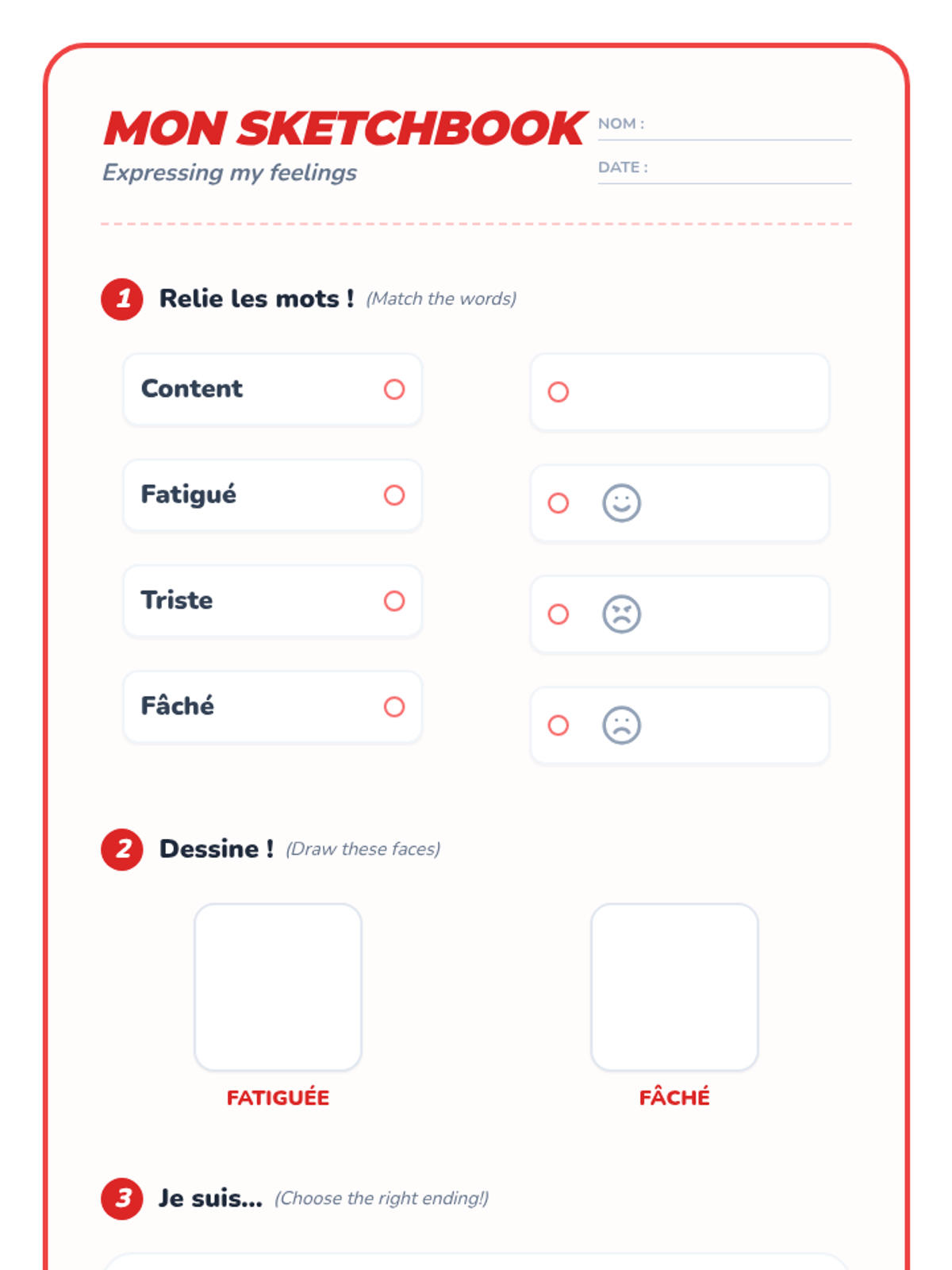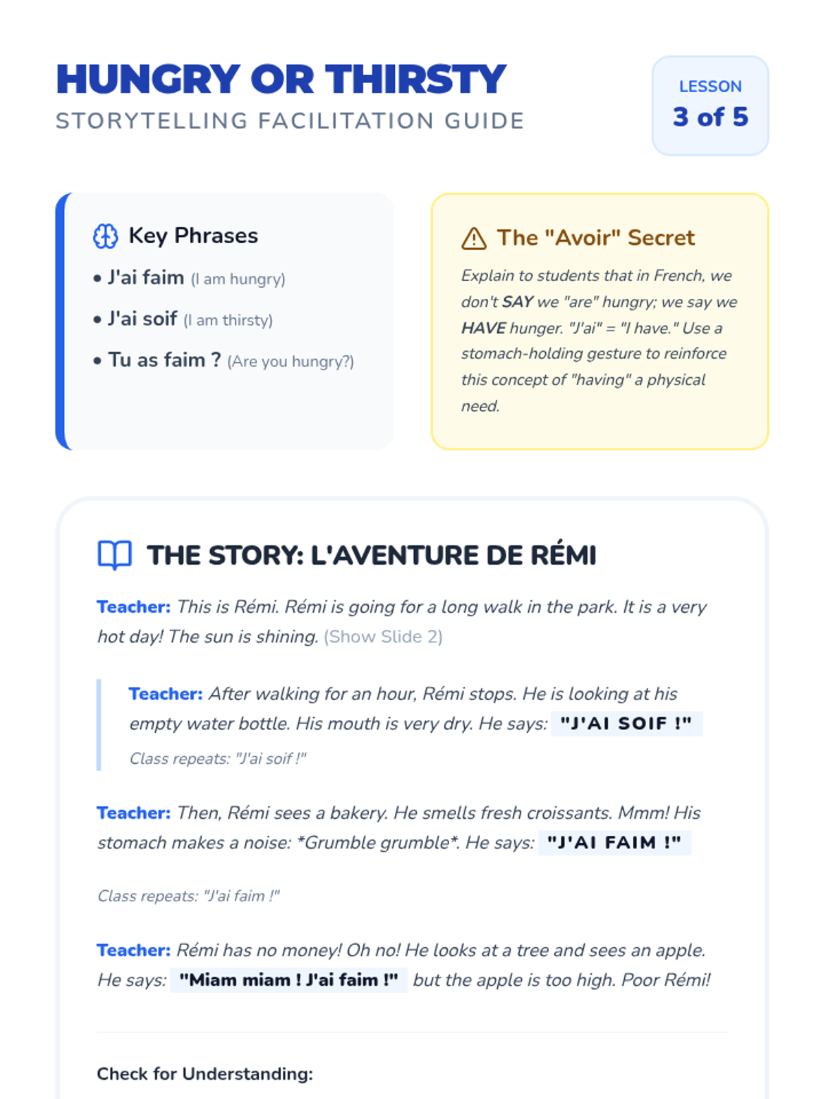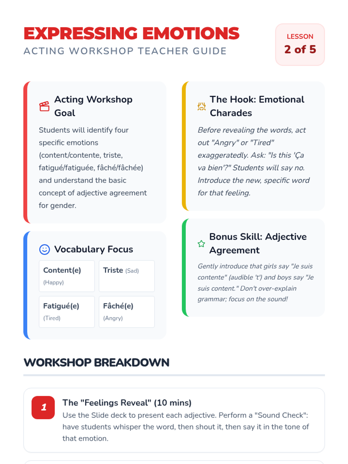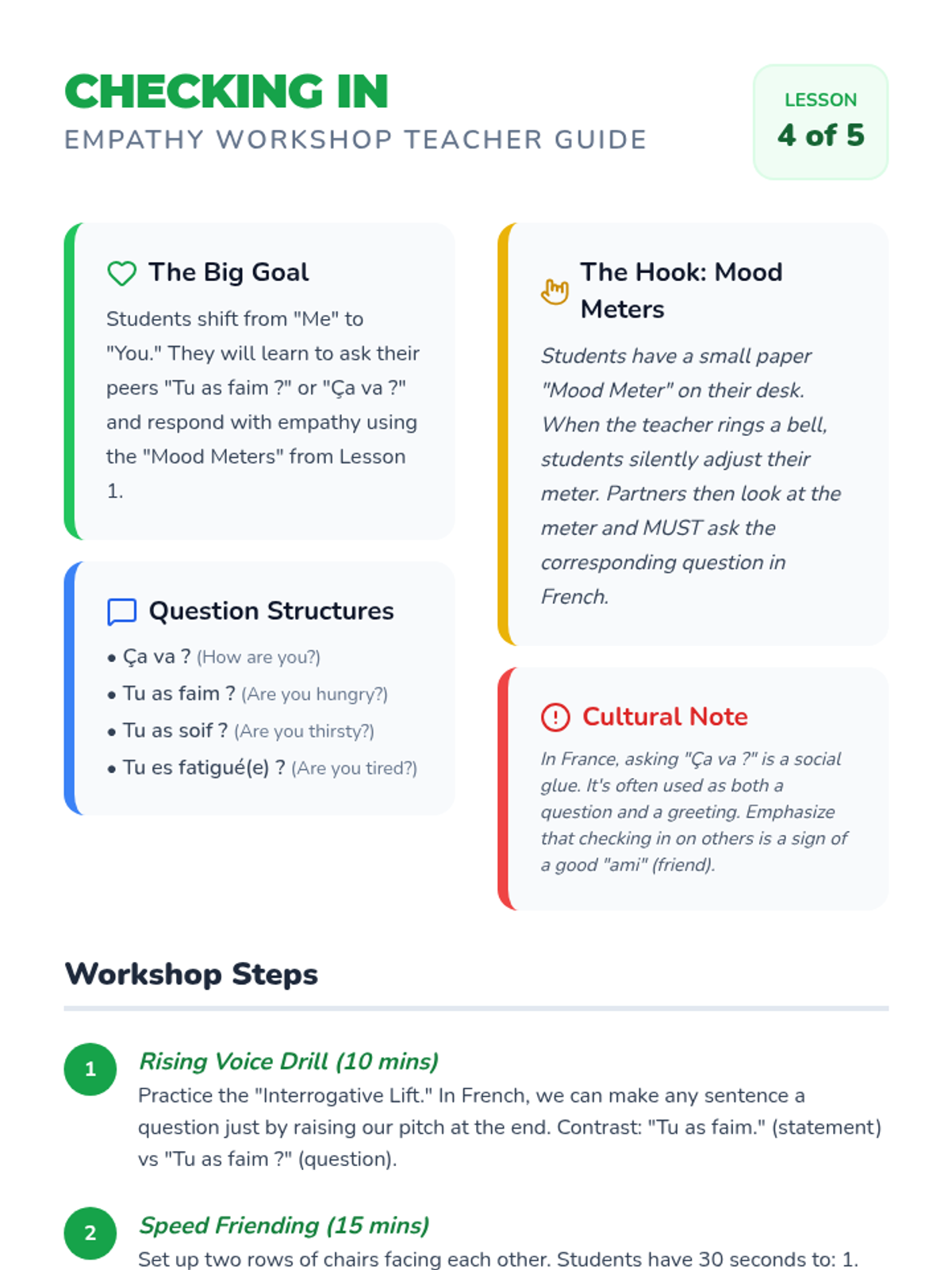 A 5-lesson sequence for 4th-grade French students focused on expressing emotions and physical needs. Students learn to use 'aller' and 'avoir' expressions through interactive simulations and role-playing.
