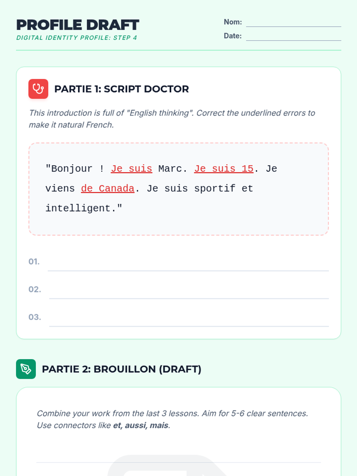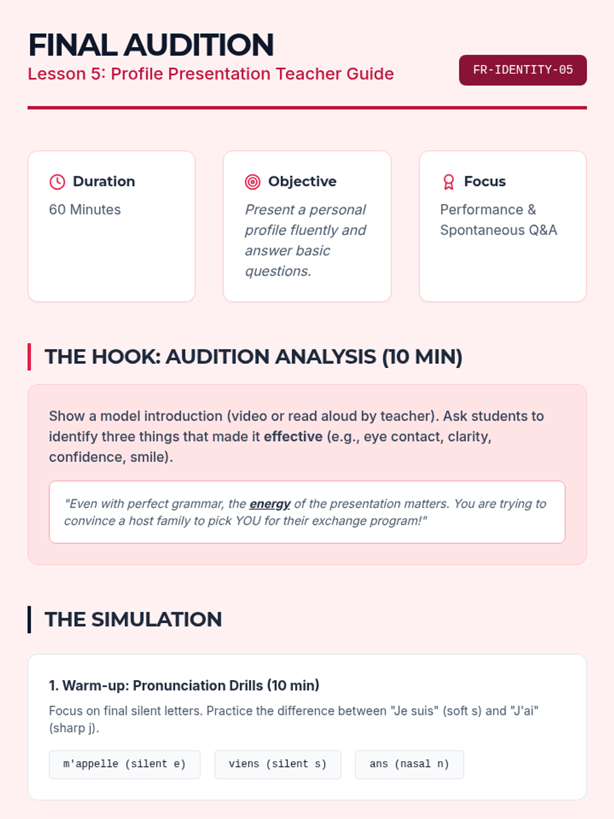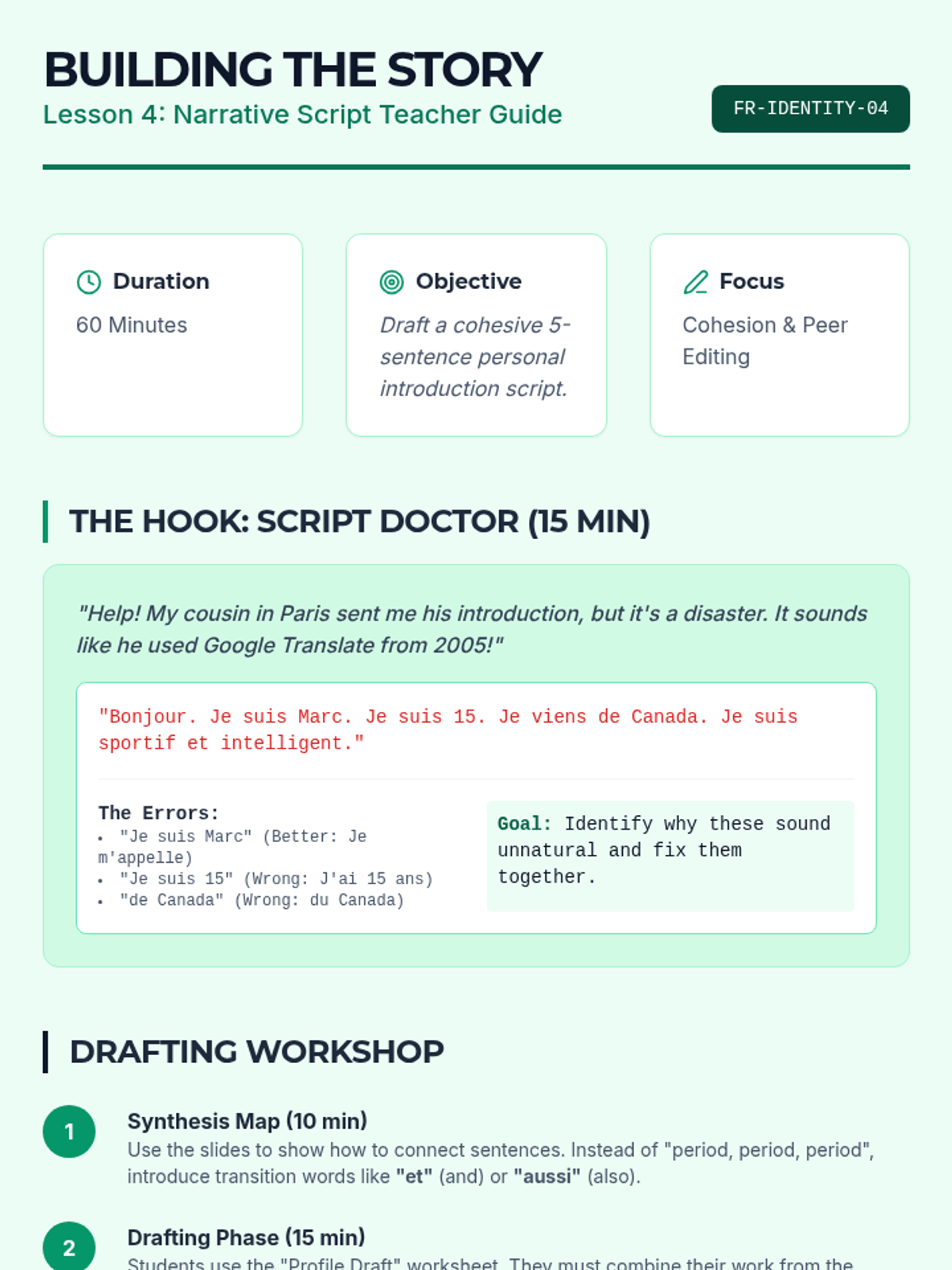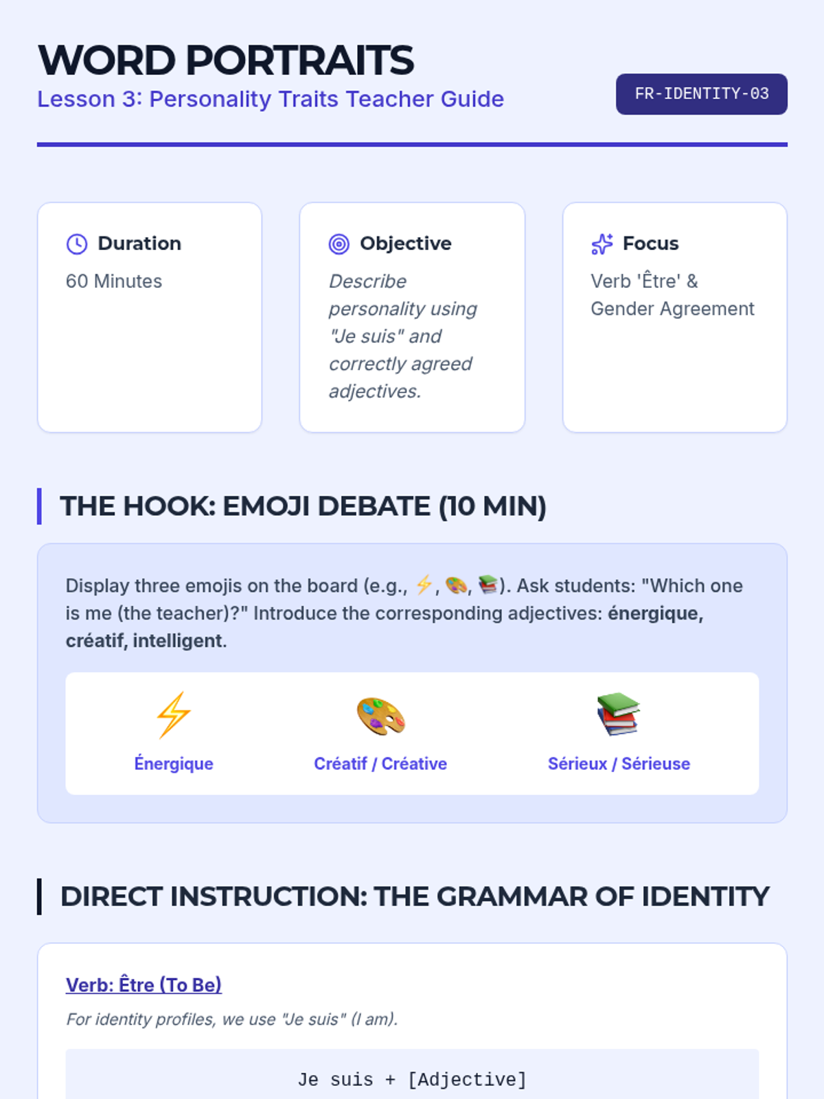 Students move from generic greetings to constructing a personal identity in French through a project-based approach. The sequence culminates in a 'Digital Identity Profile' suitable for a student exchange program, focusing on essential grammar like 'être' and 'avoir' in context.