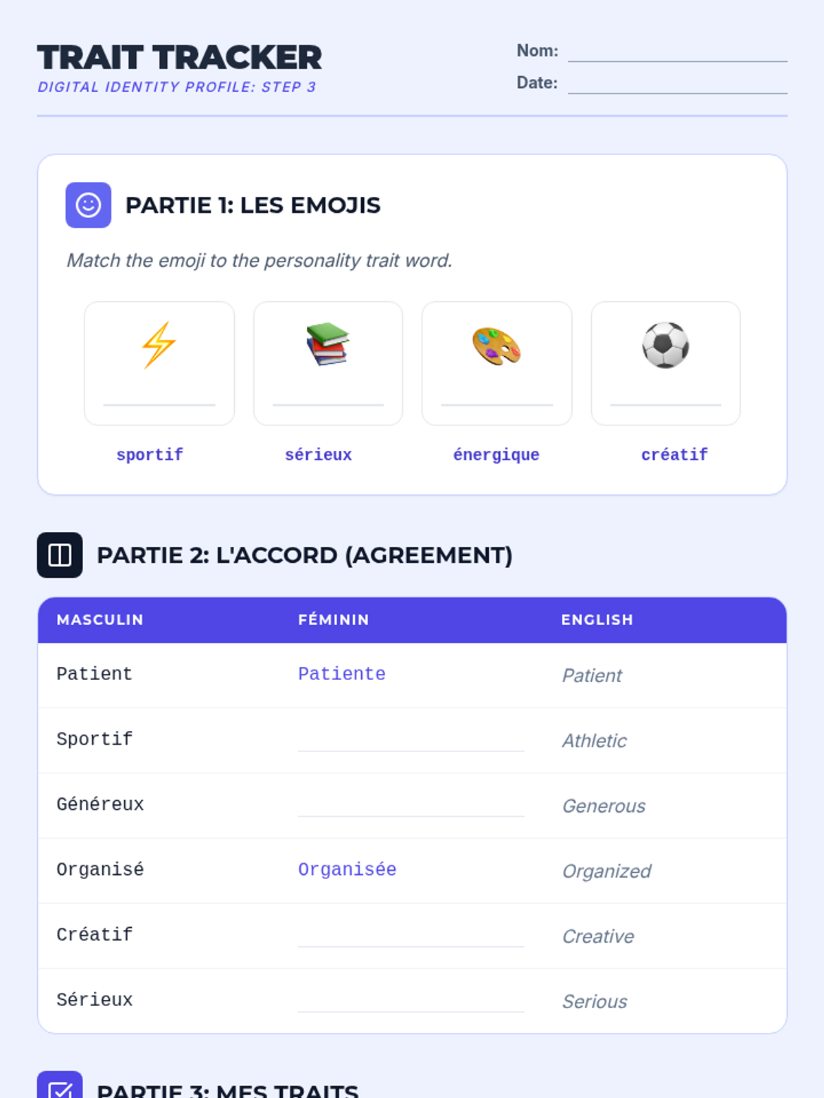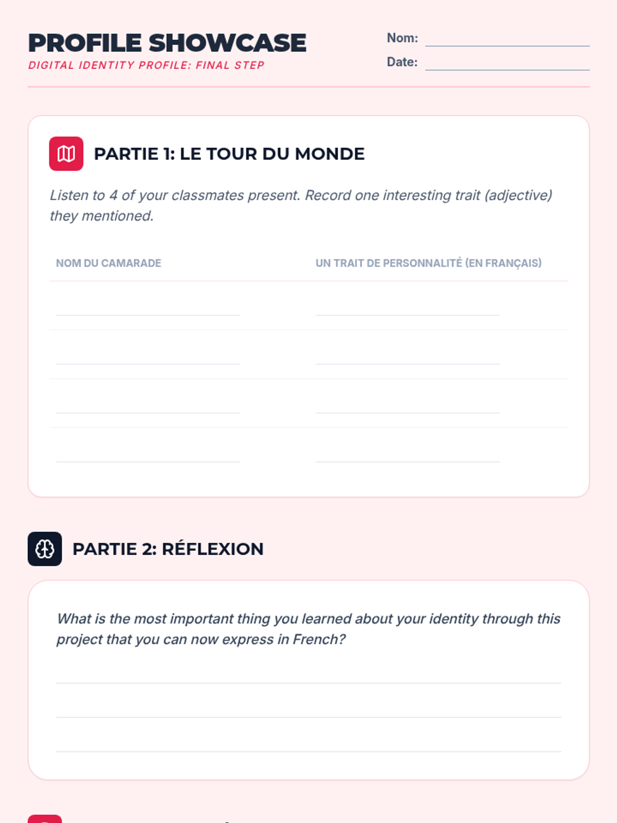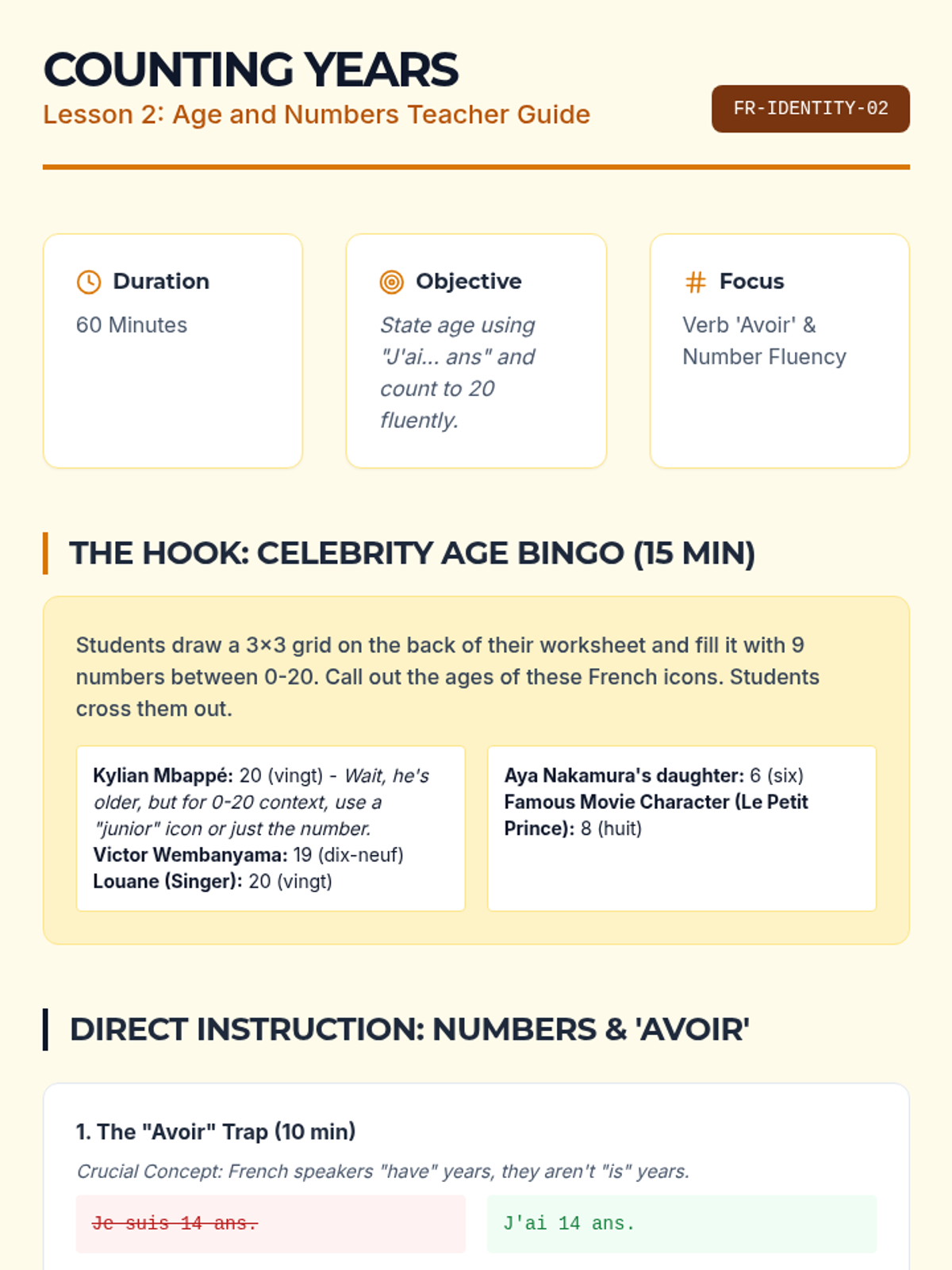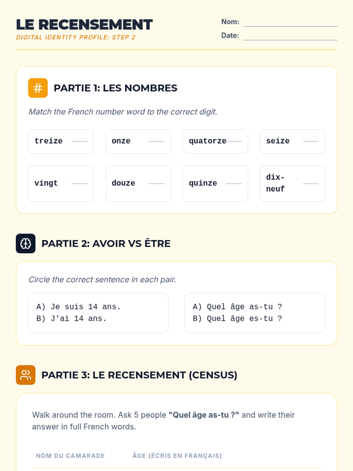 Students move from generic greetings to constructing a personal identity in French through a project-based approach. The sequence culminates in a 'Digital Identity Profile' suitable for a student exchange program, focusing on essential grammar like 'être' and 'avoir' in context.