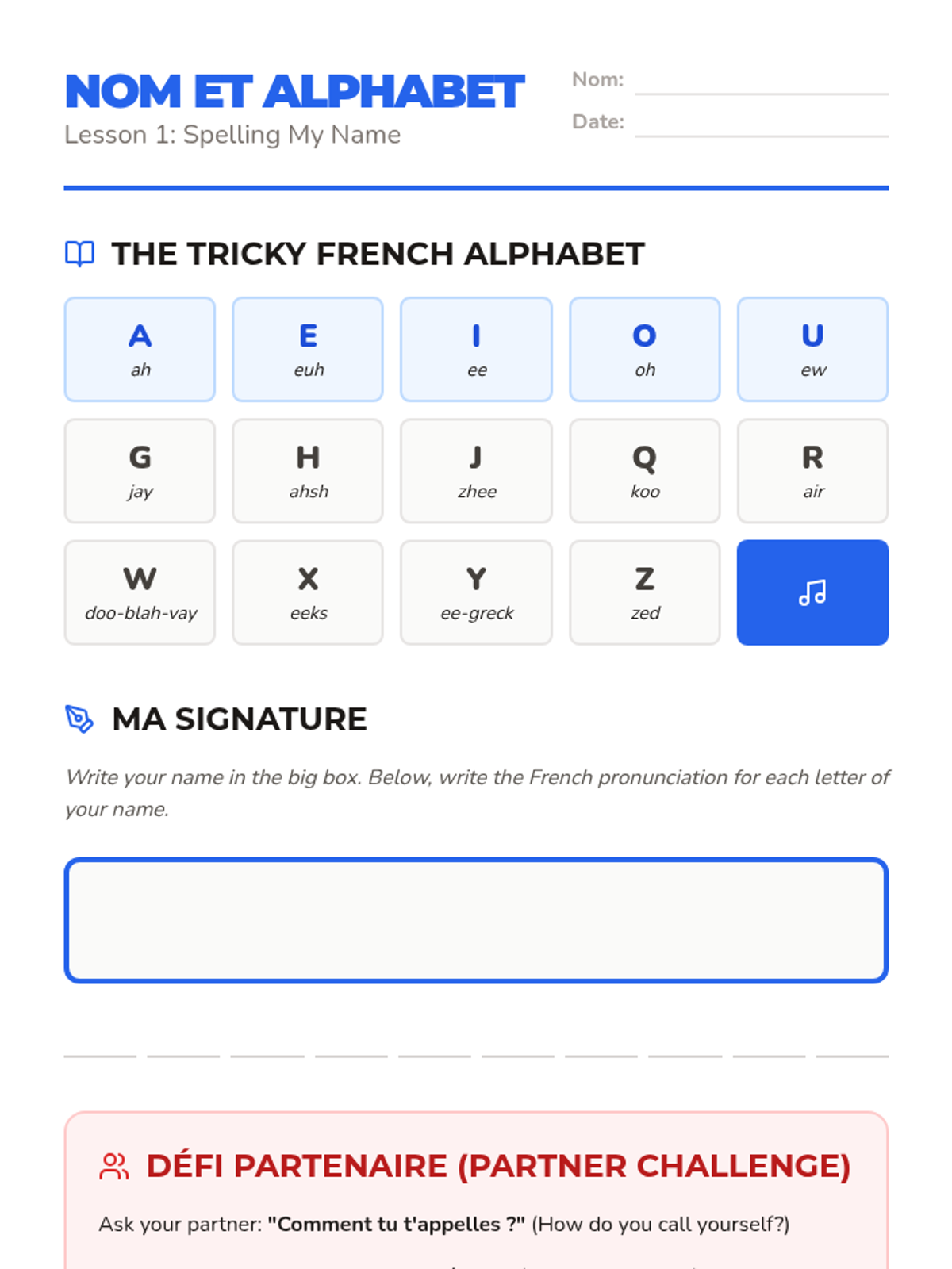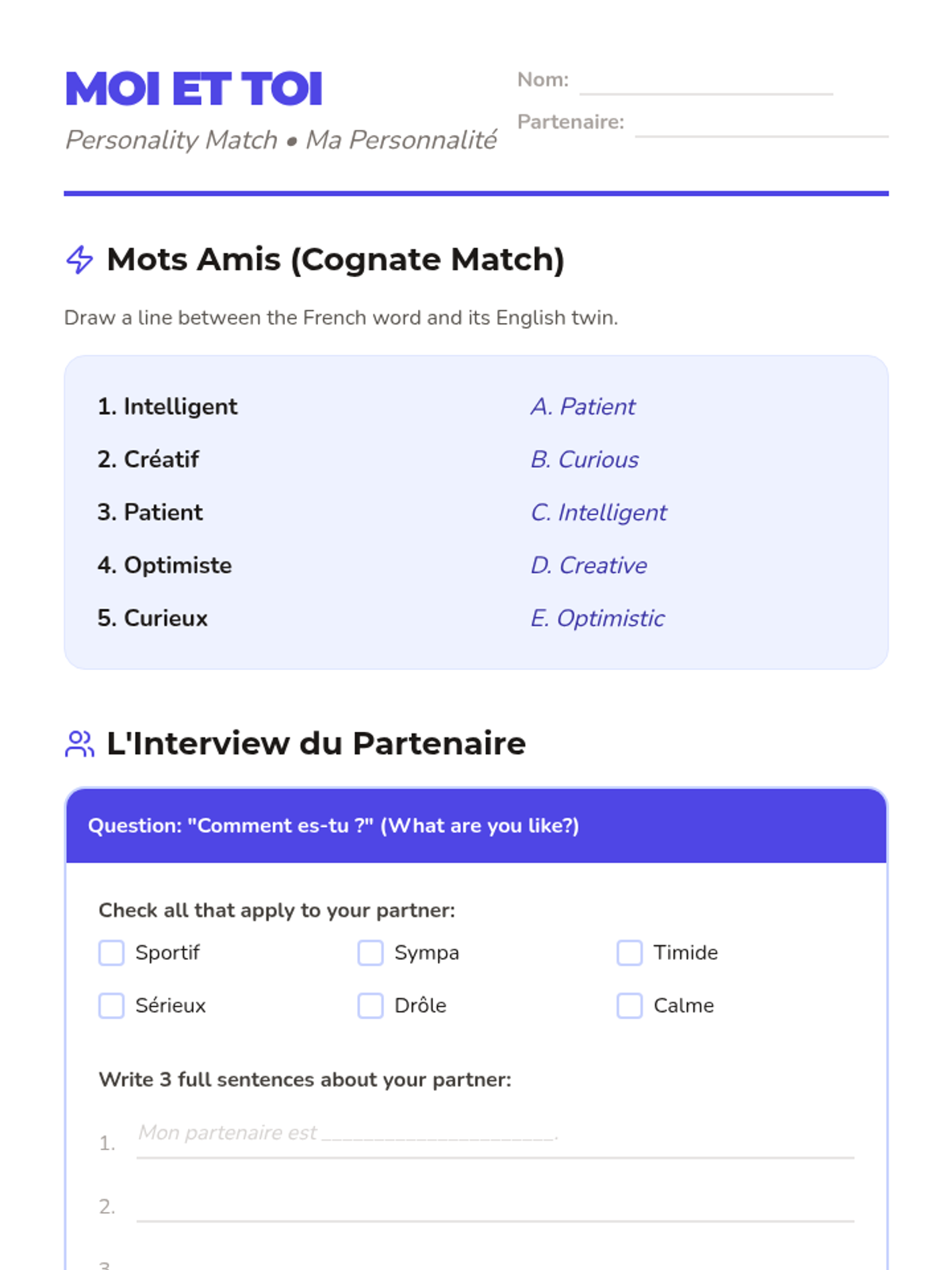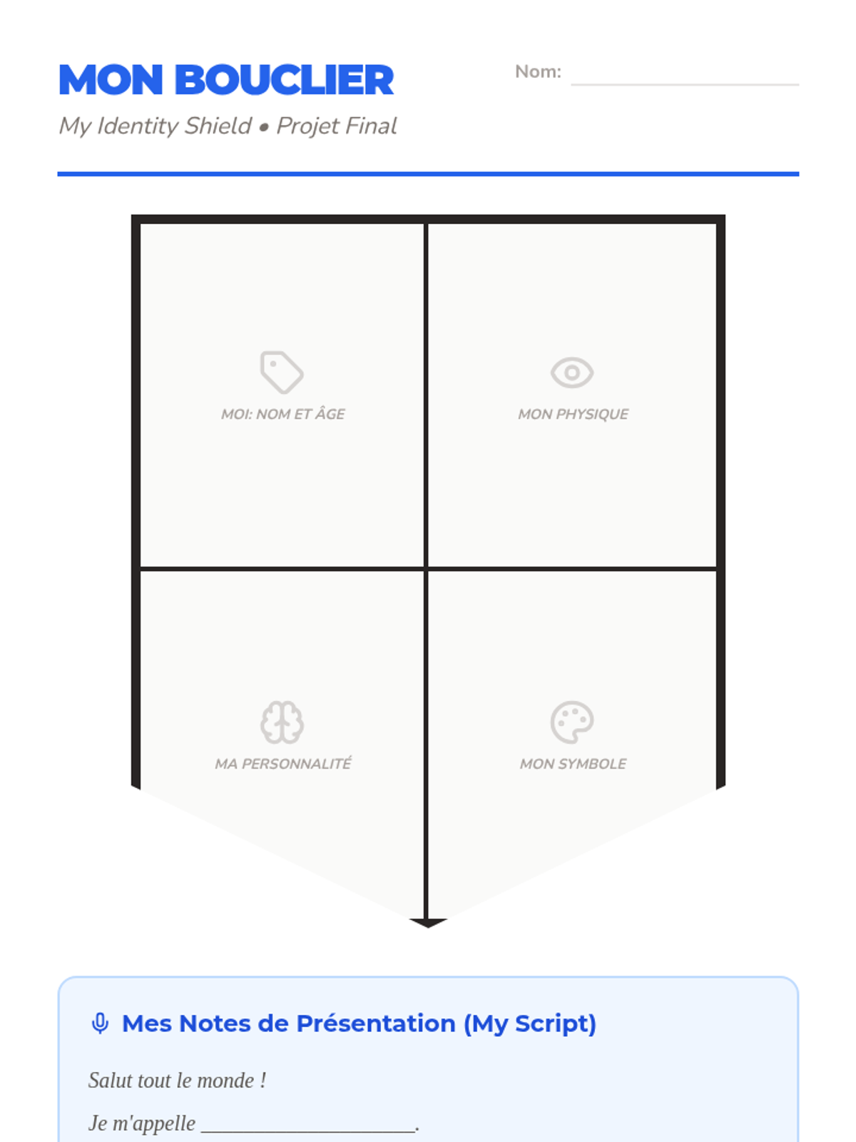 A 5-lesson French sequence for 5th graders focusing on self-expression, identity, and personal traits. Students learn to introduce themselves, state their age, and describe their physical and personality characteristics through creative projects.
