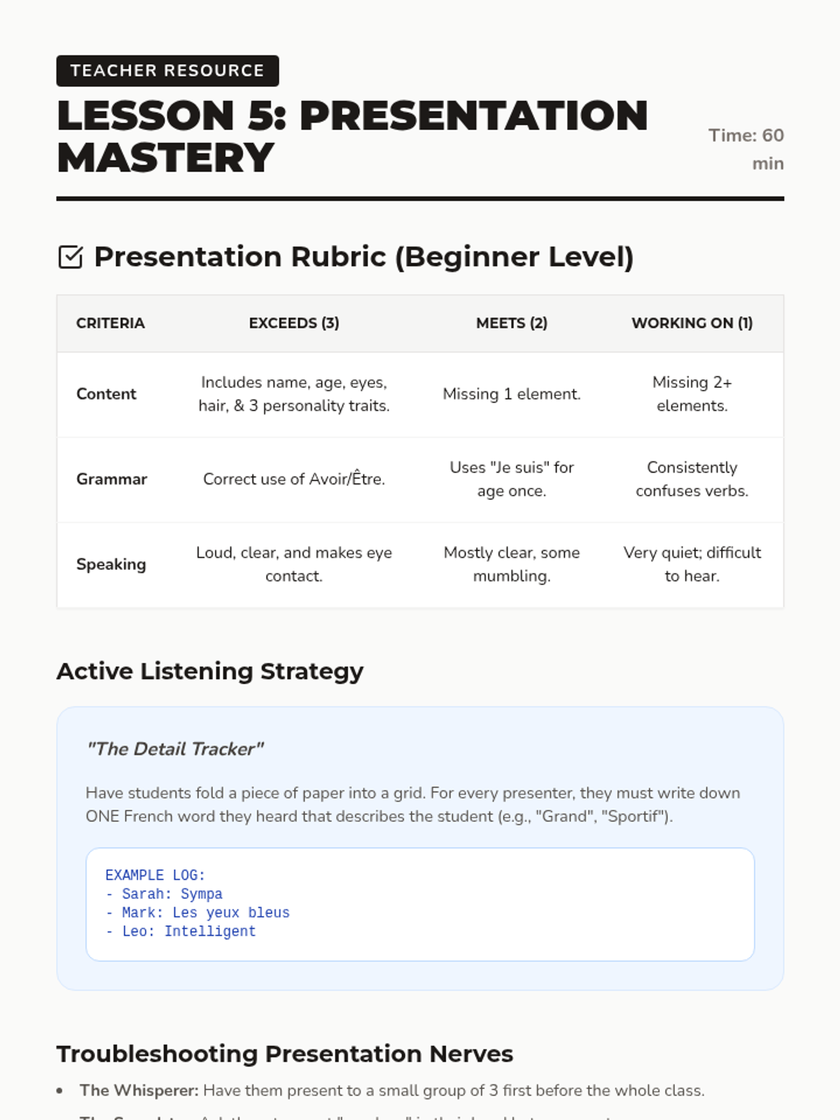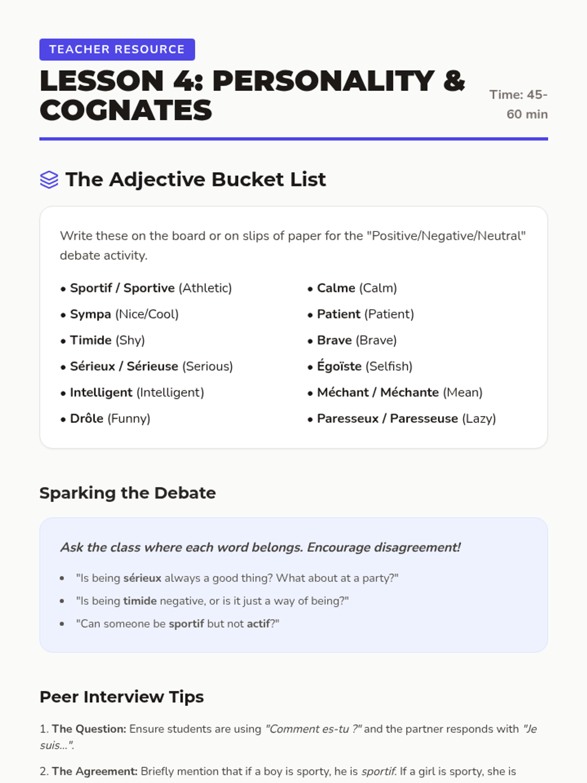 Students move beyond simple introductions to expressing personal identity, preferences, and traits using the verbs 'être' and 'aimer'. The project-based learning arc culminates in the creation of a 'Star Student' poster where students present who they are in French.