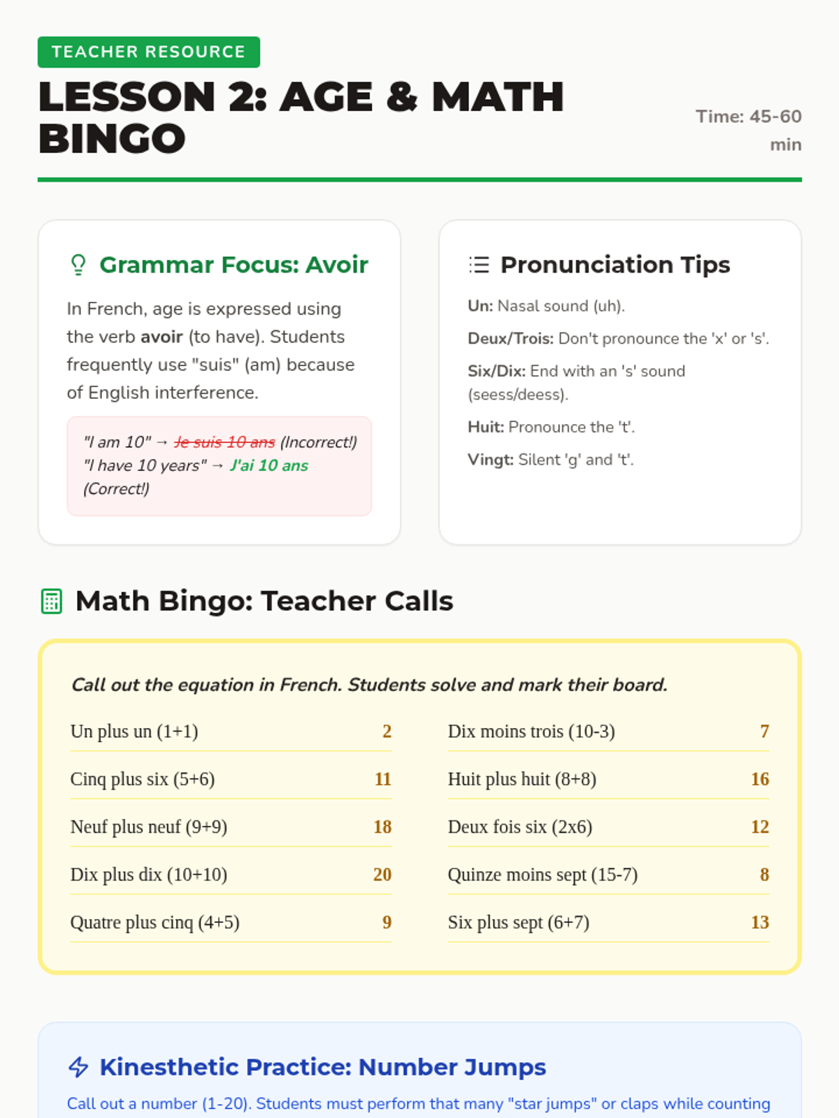 A lively exploration of Spanish numbers 0-31, focusing on expressing age and birthdays. Students move from rote memorization to real-world data collection and peer interviews to build a class birthday calendar.