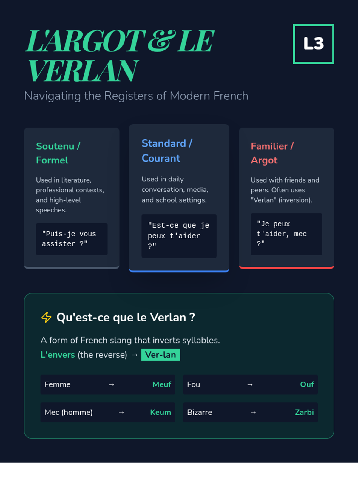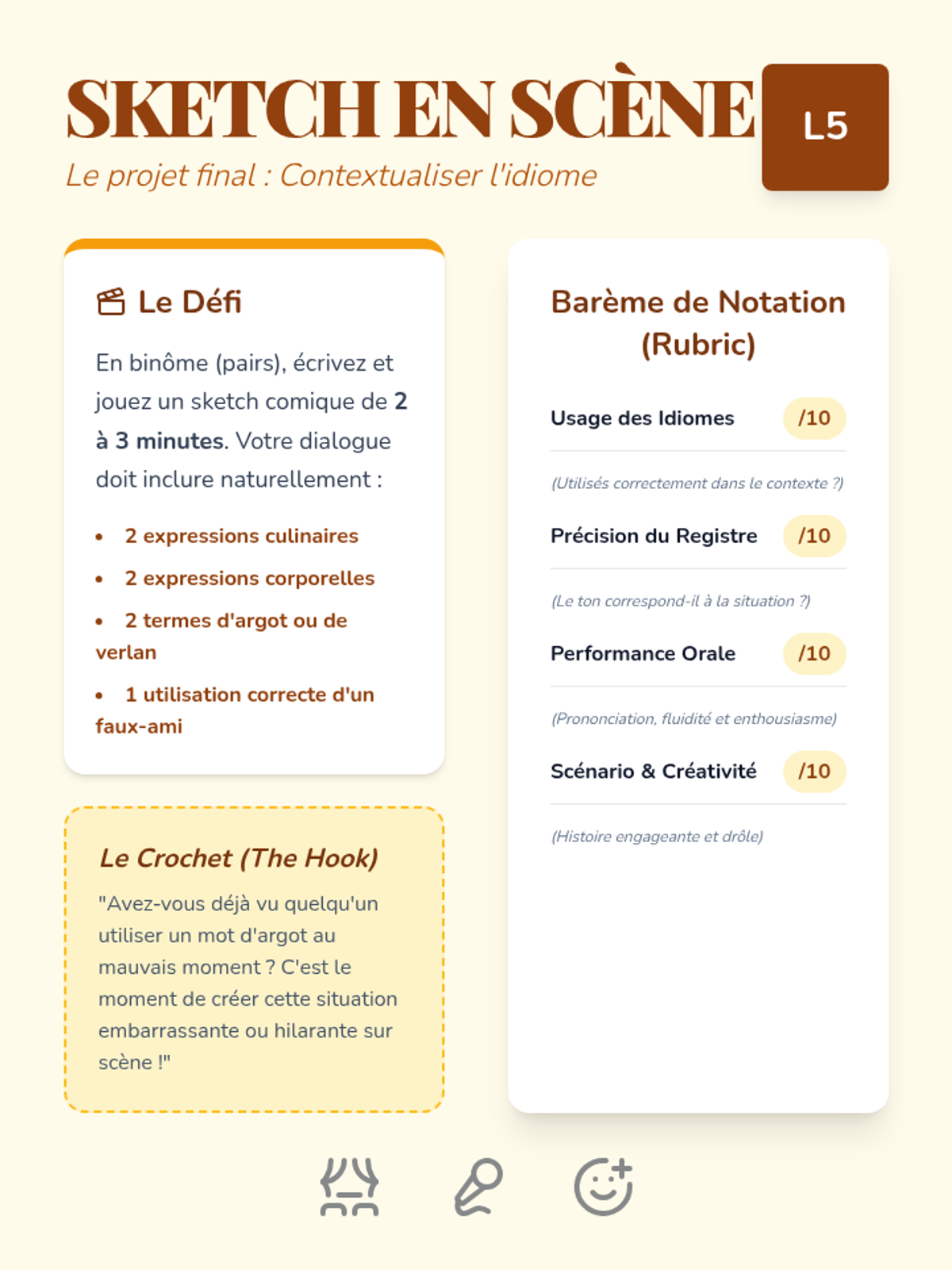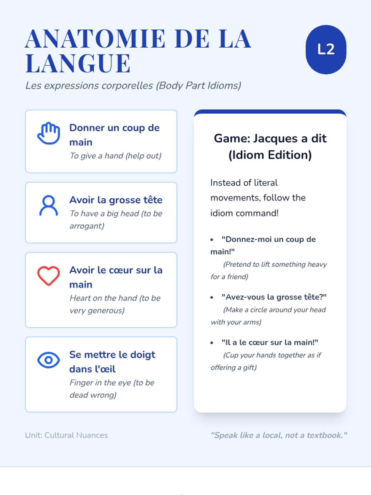 A 10th-grade intermediate French sequence exploring idiomatic expressions, culinary metaphors, somatic idioms, registers (argot/verlan), and false friends to bridge the gap between textbook learning and authentic cultural speech.