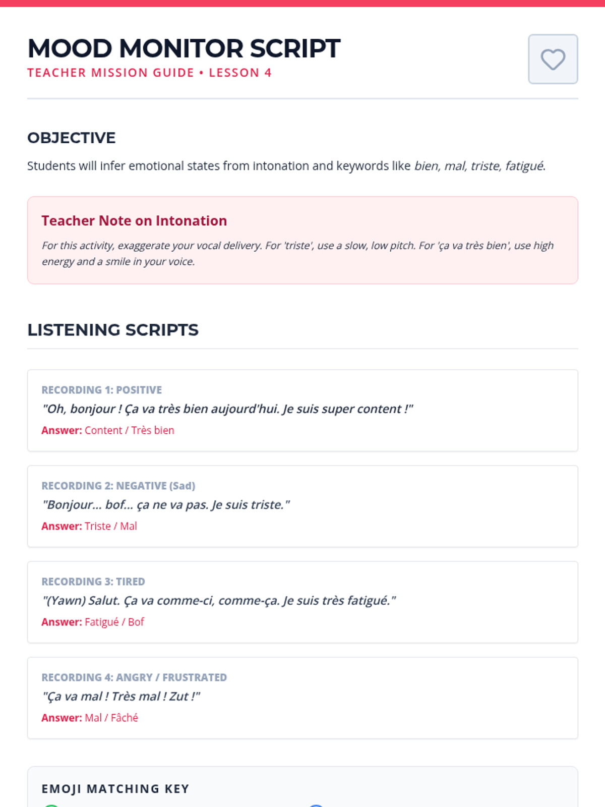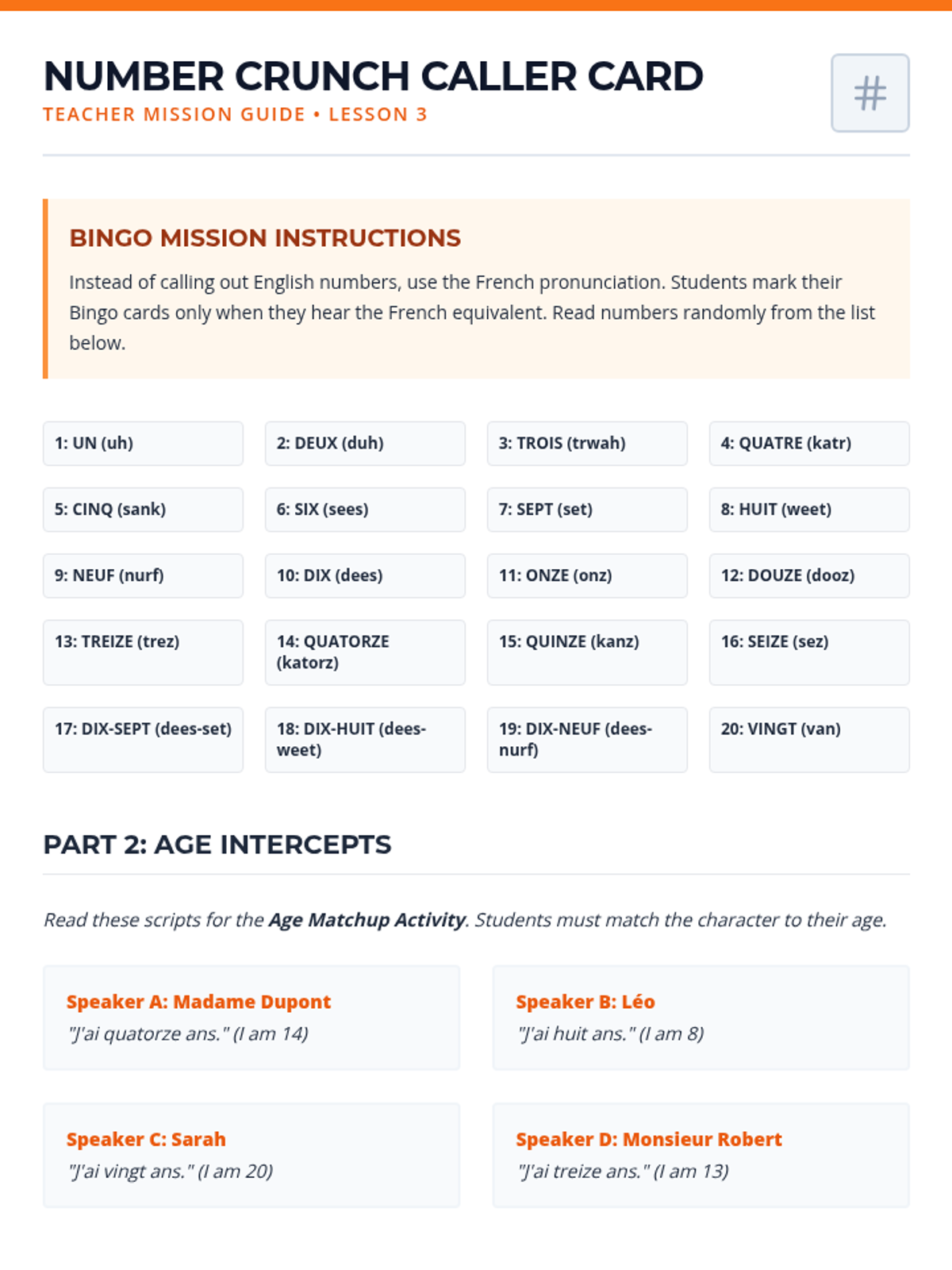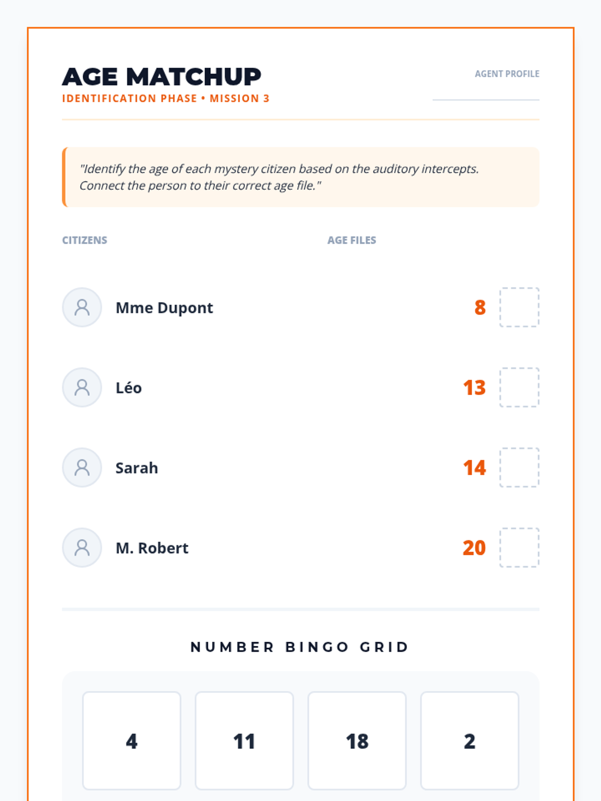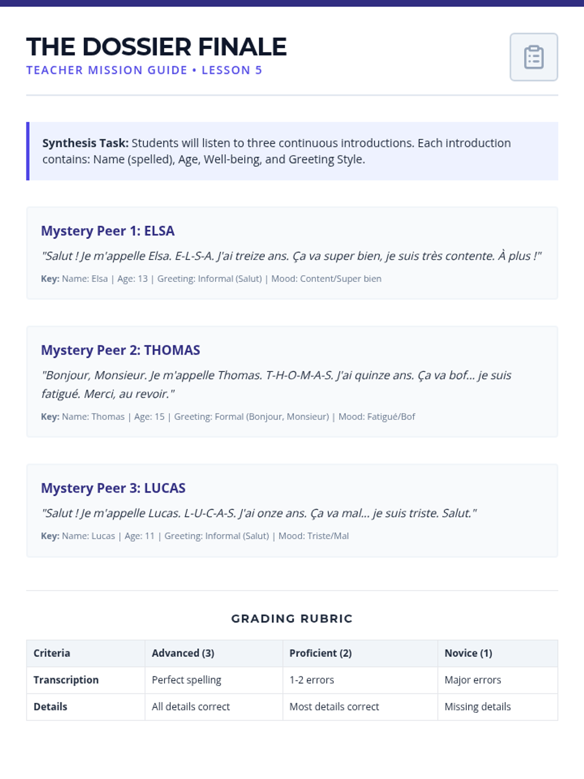 A 5-lesson unit for 6th-grade French students focusing on auditory comprehension of greetings, alphabet, numbers, and personal identity using a 'Language Detectives' theme. Students progress from isolating sounds to synthesizing full personal profiles from audio input.