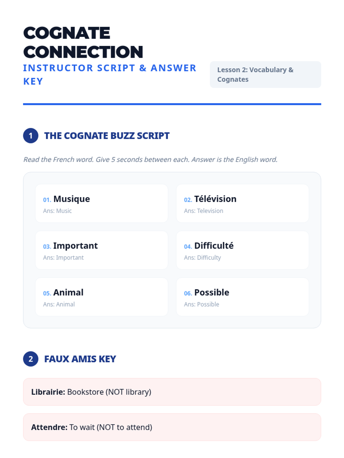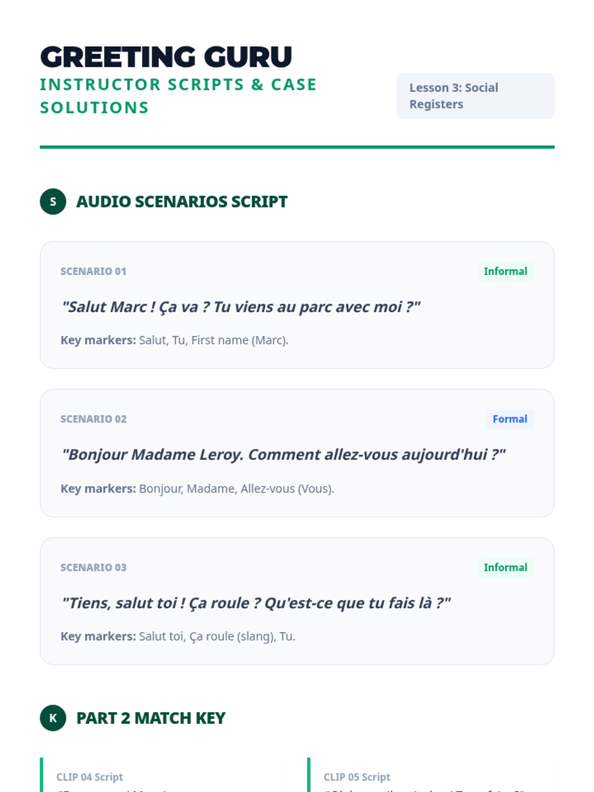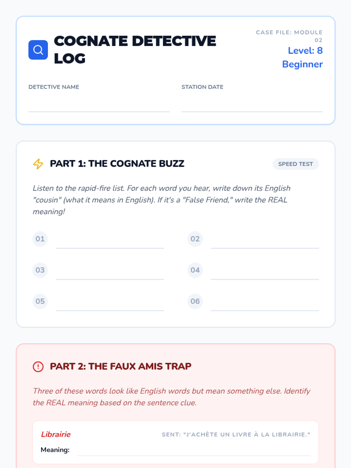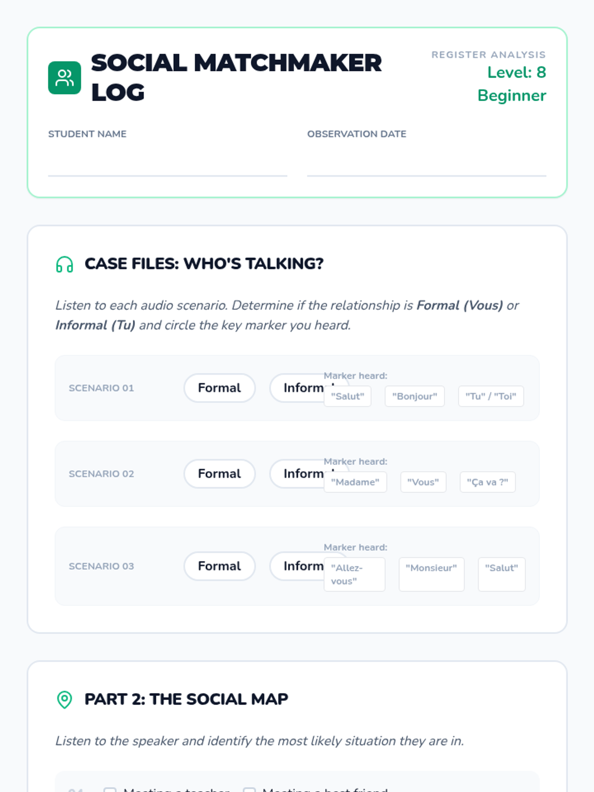 This sequence introduces 8th-grade students to the foundational auditory skills required for French proficiency. Students progress from isolating specific phonemes and nasals to recognizing cognates, distinguishing formal and informal registers, and finally comprehending full personal introductions.