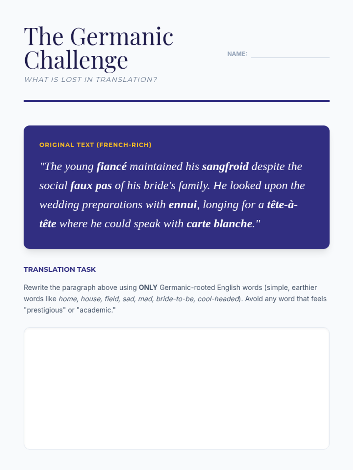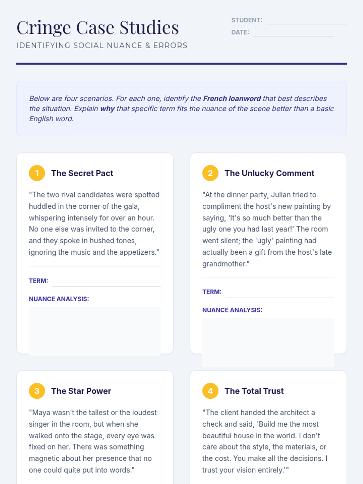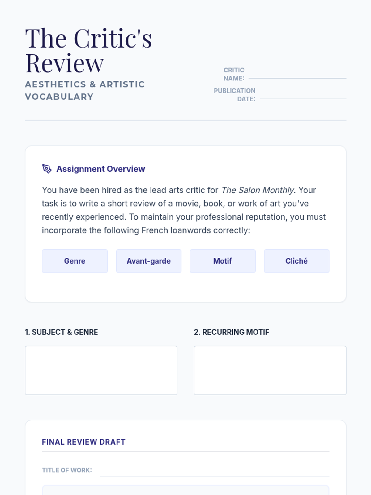 This 10th-grade ELA sequence explores the profound influence of French loanwords on the English language, focusing on how these terms convey specific nuances of tone, social status, and artistic criticism. Students progress from historical etymological roots to sophisticated literary analysis and creative application.
