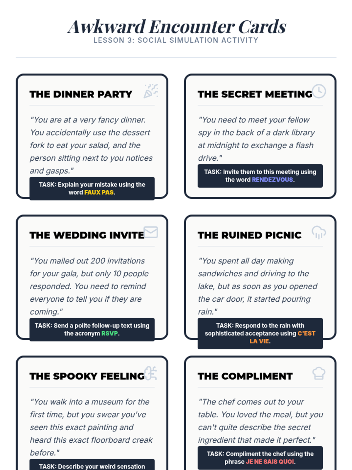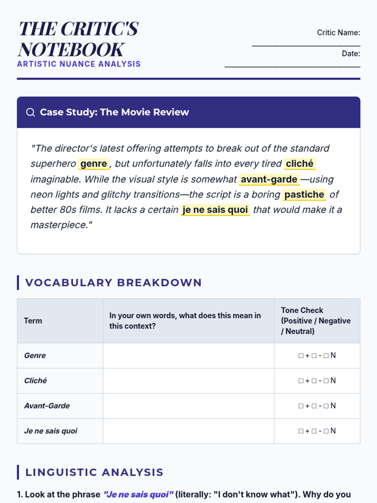 This sequence explores the heavy influence of the French language on English, specifically regarding words that describe tone, art, social etiquette, and nuance. Students will investigate why English speakers often revert to French loanwords to capture specific feelings or concepts that English lacks single words for (le mot juste). The learning journey moves from historical context to literary analysis, helping students appreciate connotation and cultural prestige in language.