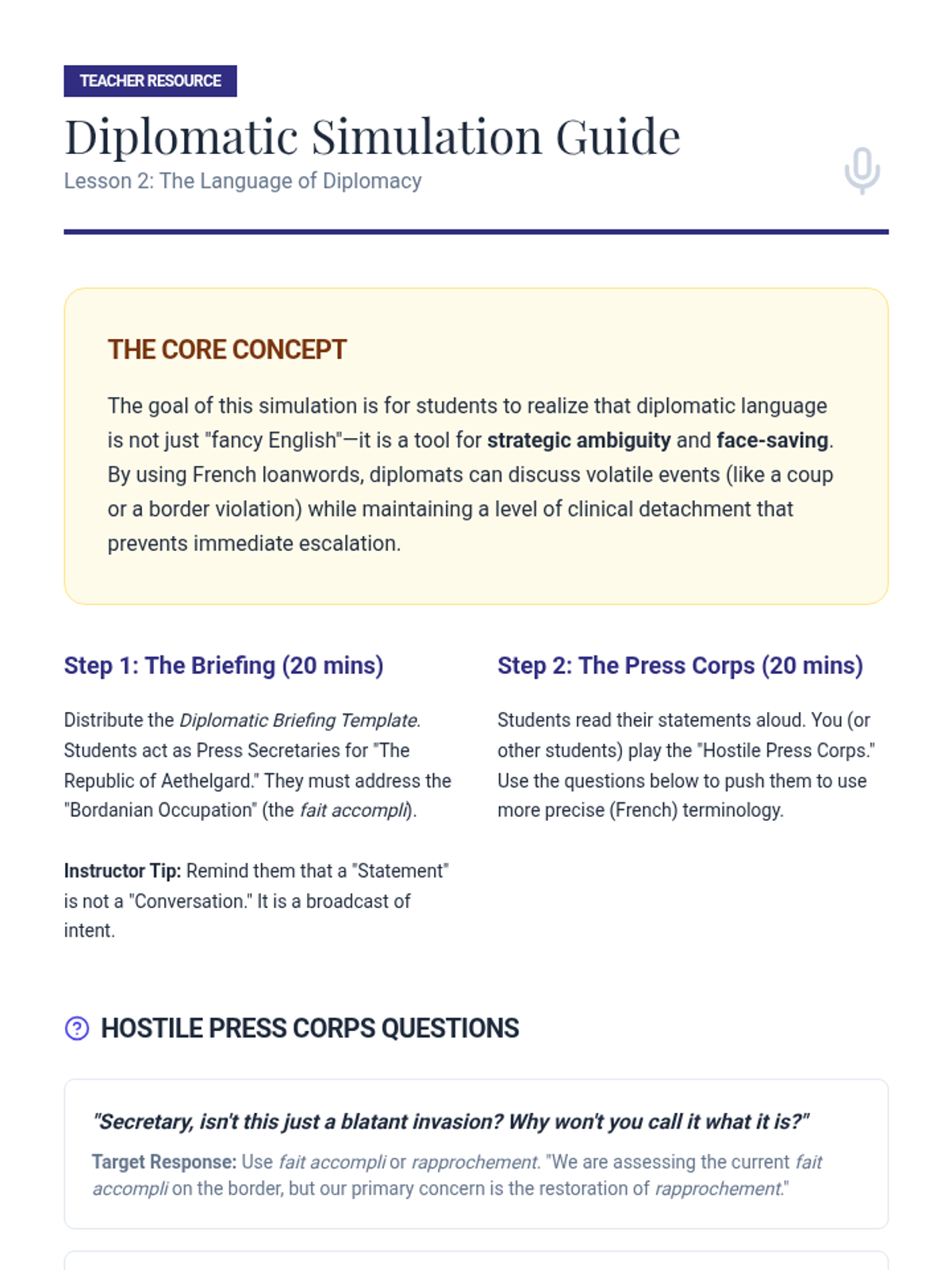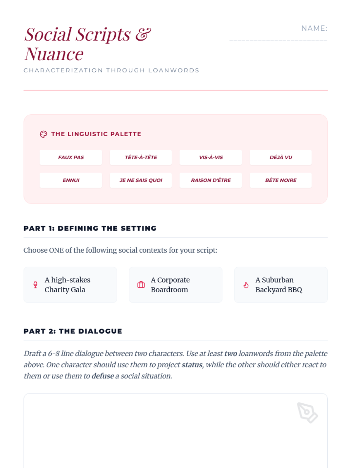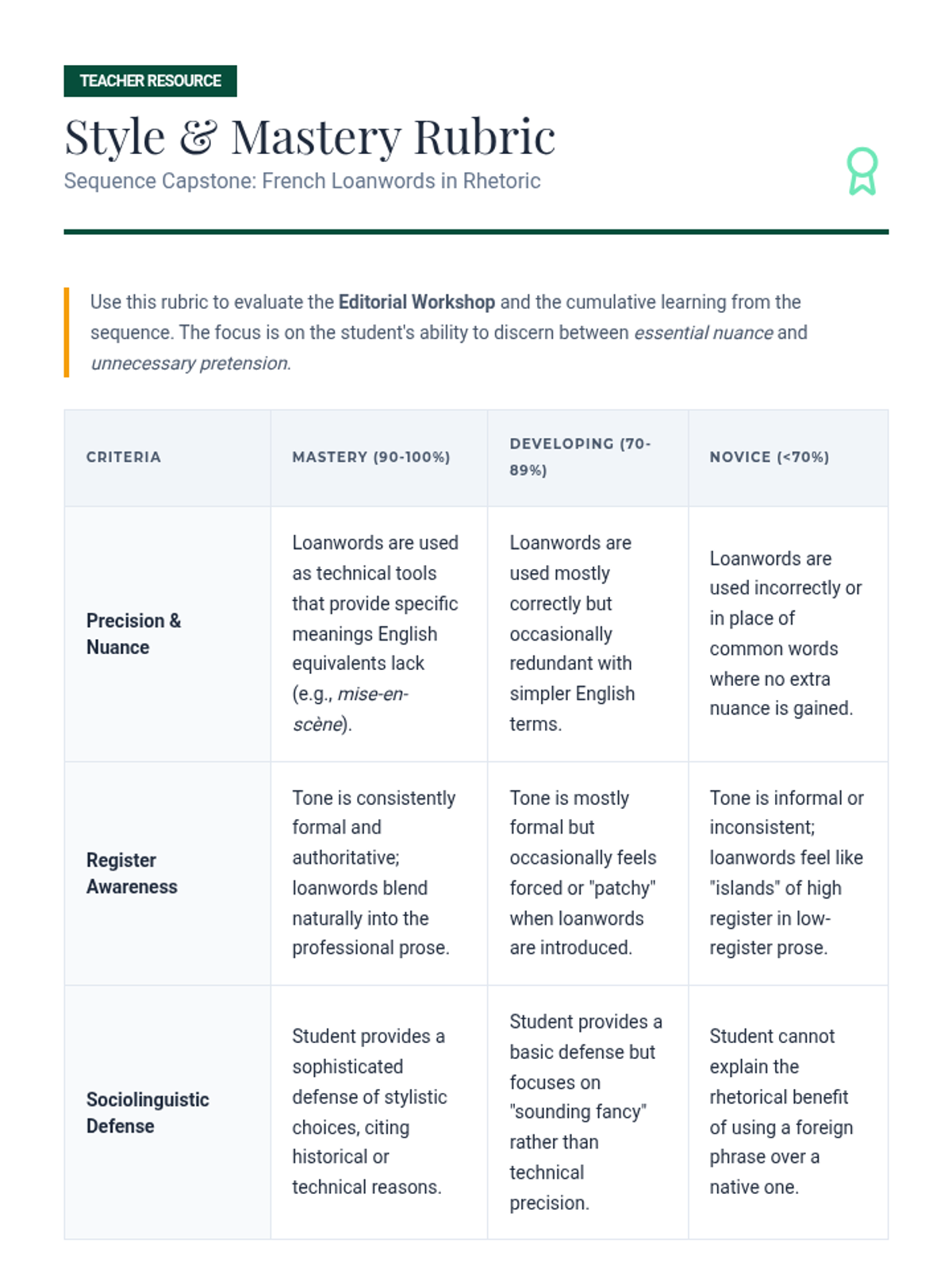 A comprehensive sequence for undergraduate students exploring the sociolinguistic, political, and artistic influence of French loanwords in English, focusing on rhetoric, prestige, and stylistic precision.
