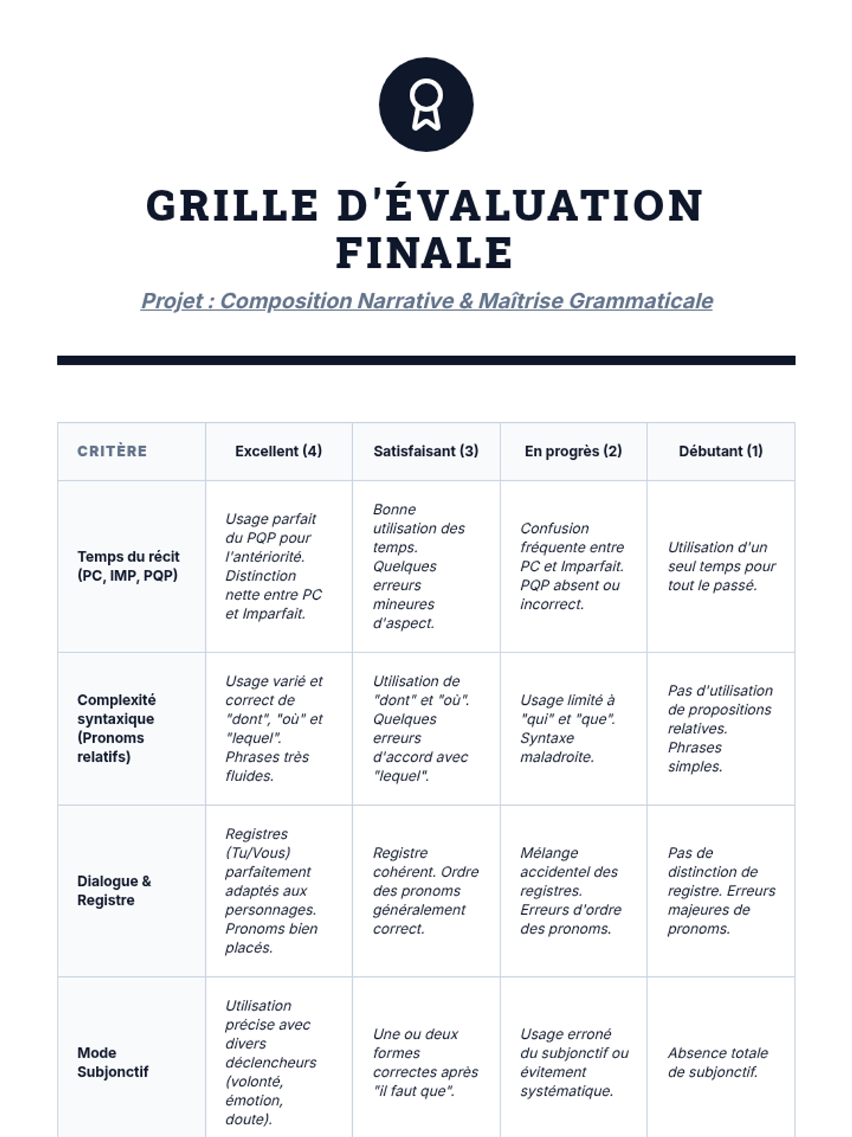 A culminating French sequence where students master advanced grammar through narrative storytelling. Students integrate complex tenses, moods, and syntax to draft, edit, and present original short stories.