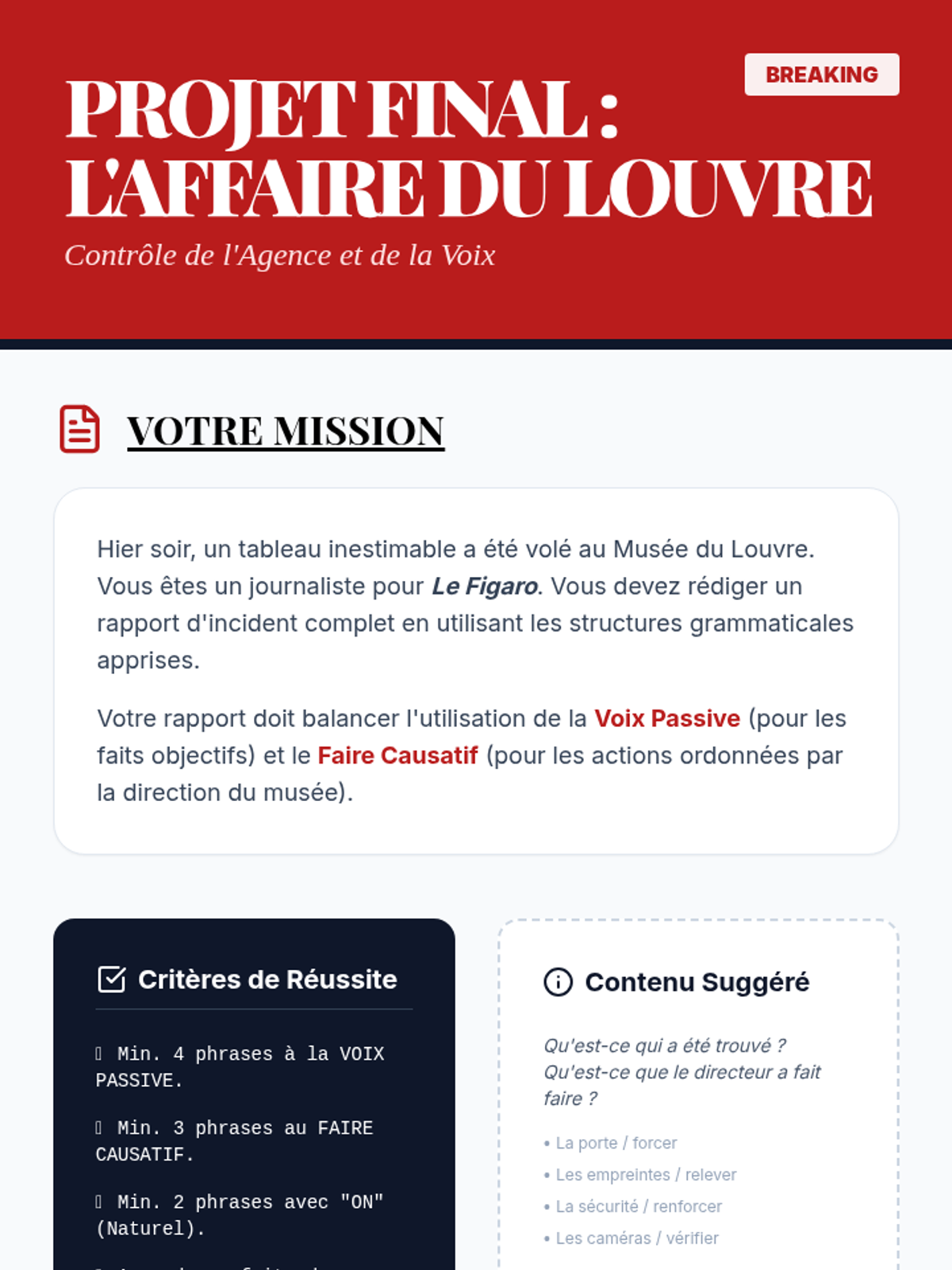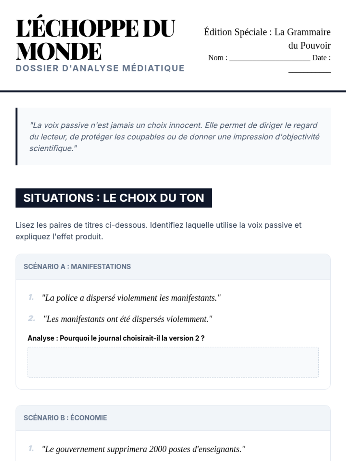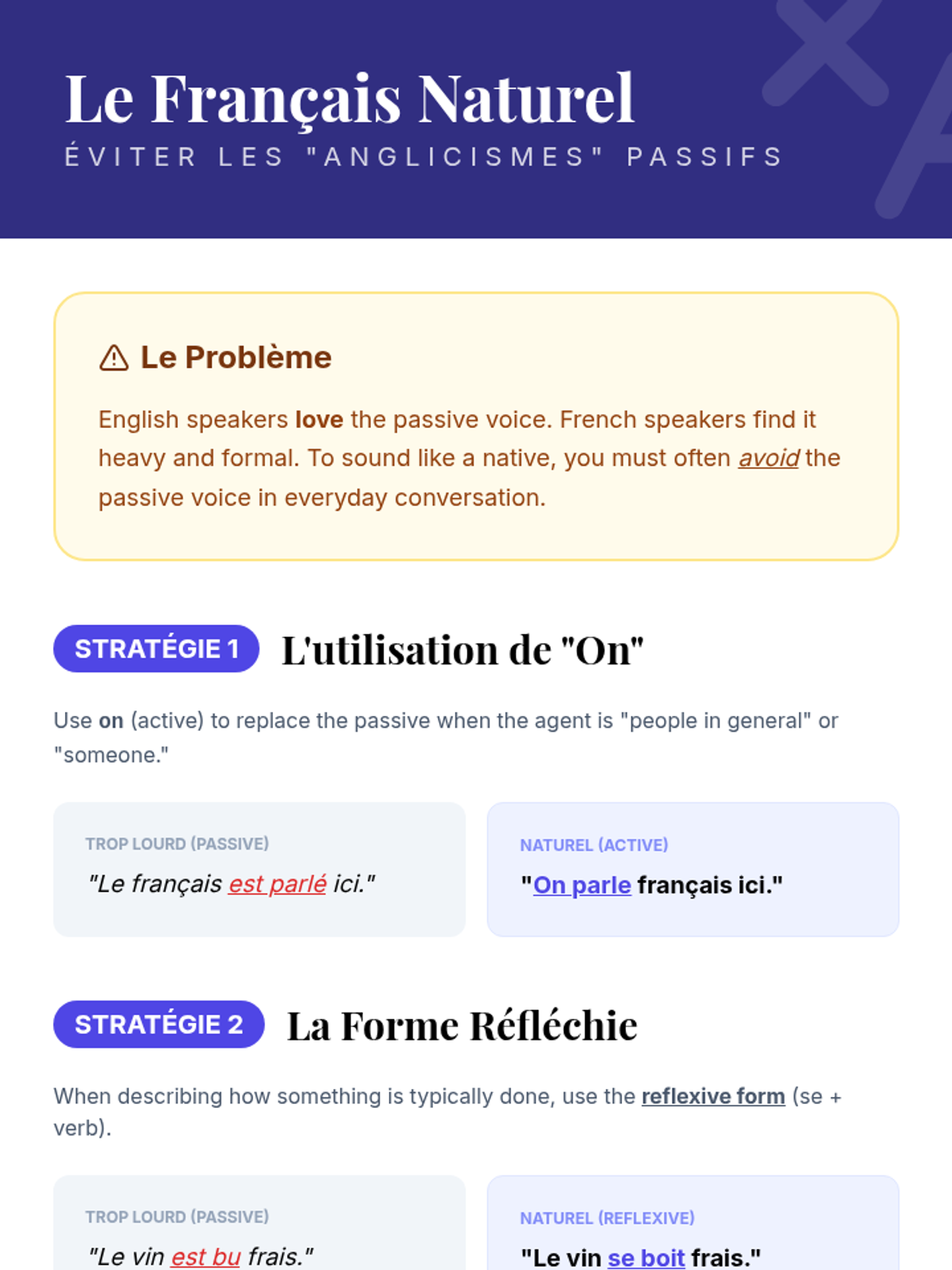 An advanced French grammar sequence focusing on the nuances of agency through the passive voice and the causative 'faire'. Students move from mechanical transformation to stylistic analysis in journalism and natural phrasing using 'on'.