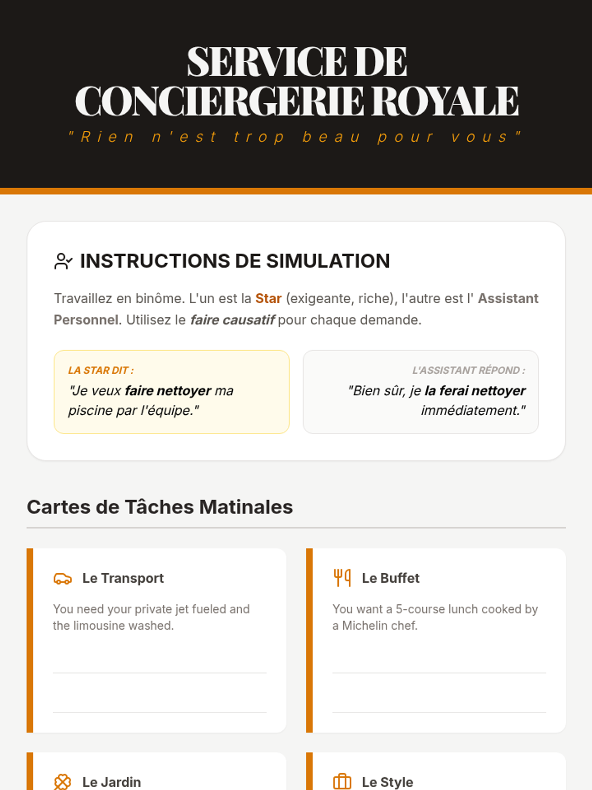 A 3-session English sequence for CAP Cuisine/Restaurant students returning from their internship, focusing on describing roles and daily tasks in a professional kitchen or dining room.