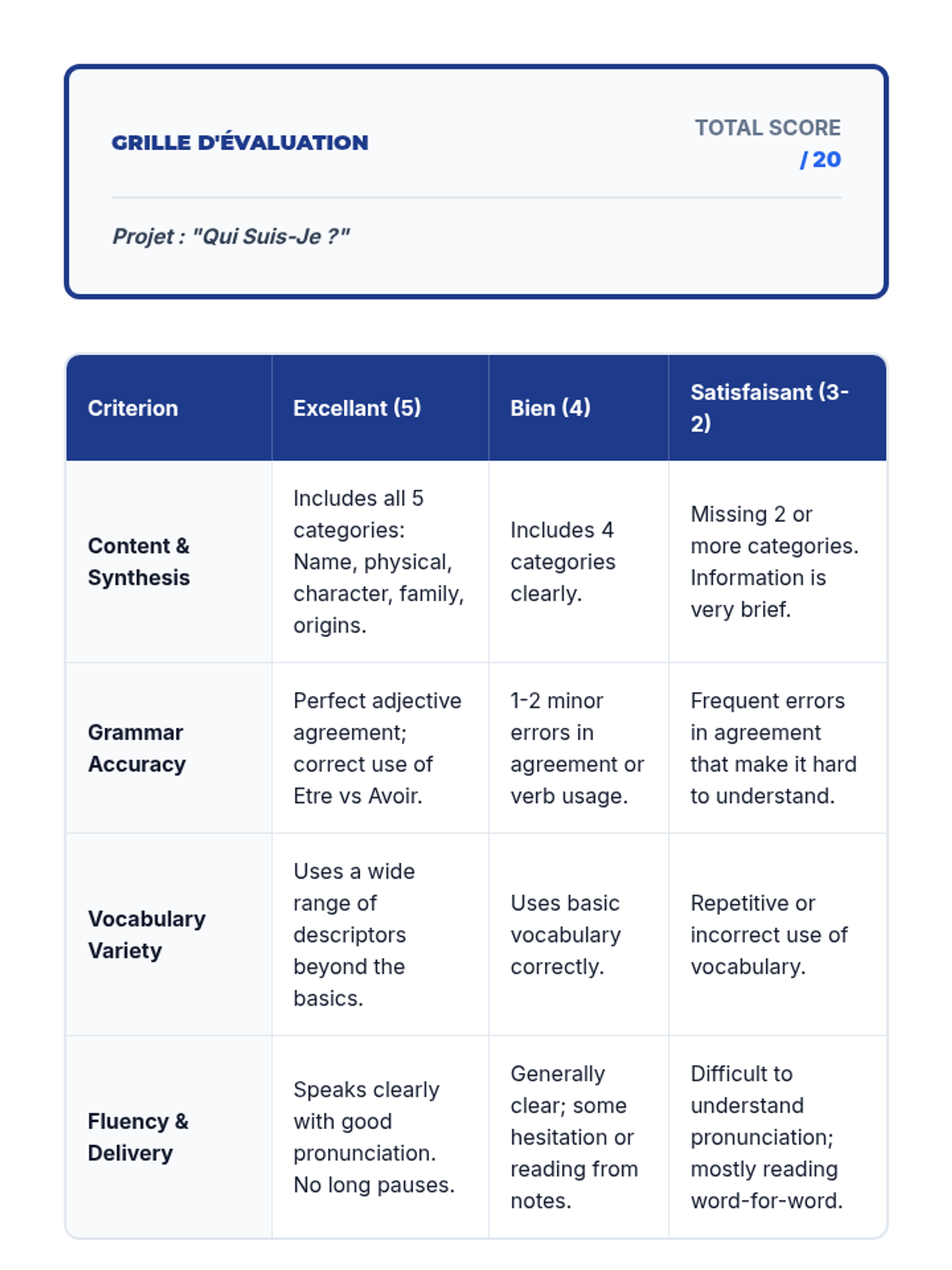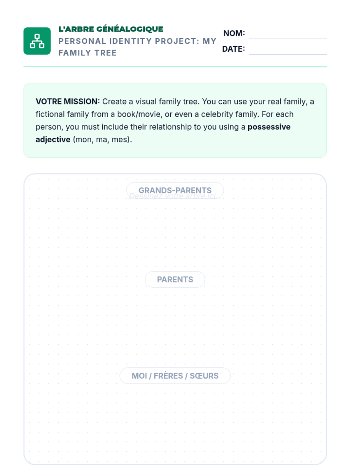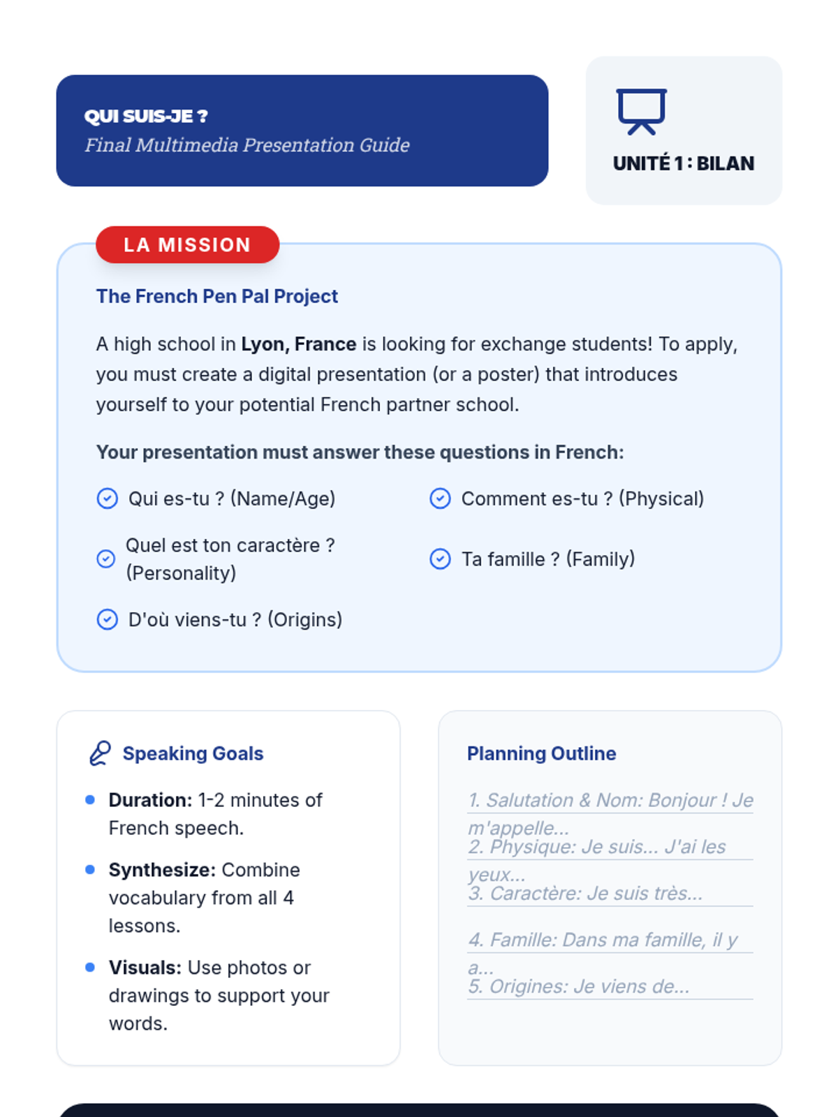 A comprehensive French unit for beginners focused on personal identity, physical traits, personality, family, and origins. Students master adjective agreement and possessive adjectives while building a 'Carnet d'Identité' that culminates in a presentational speaking project.