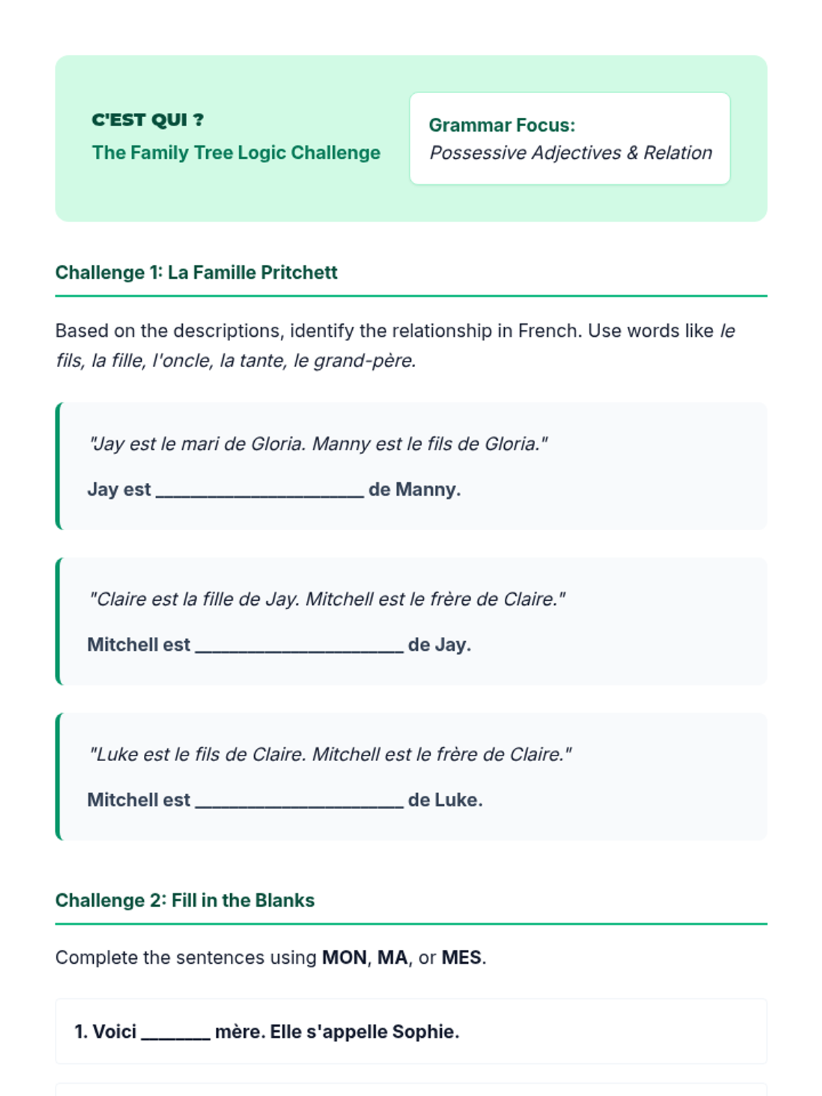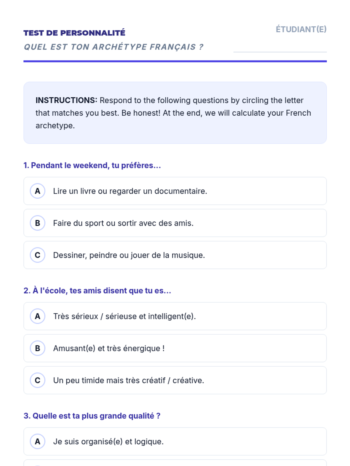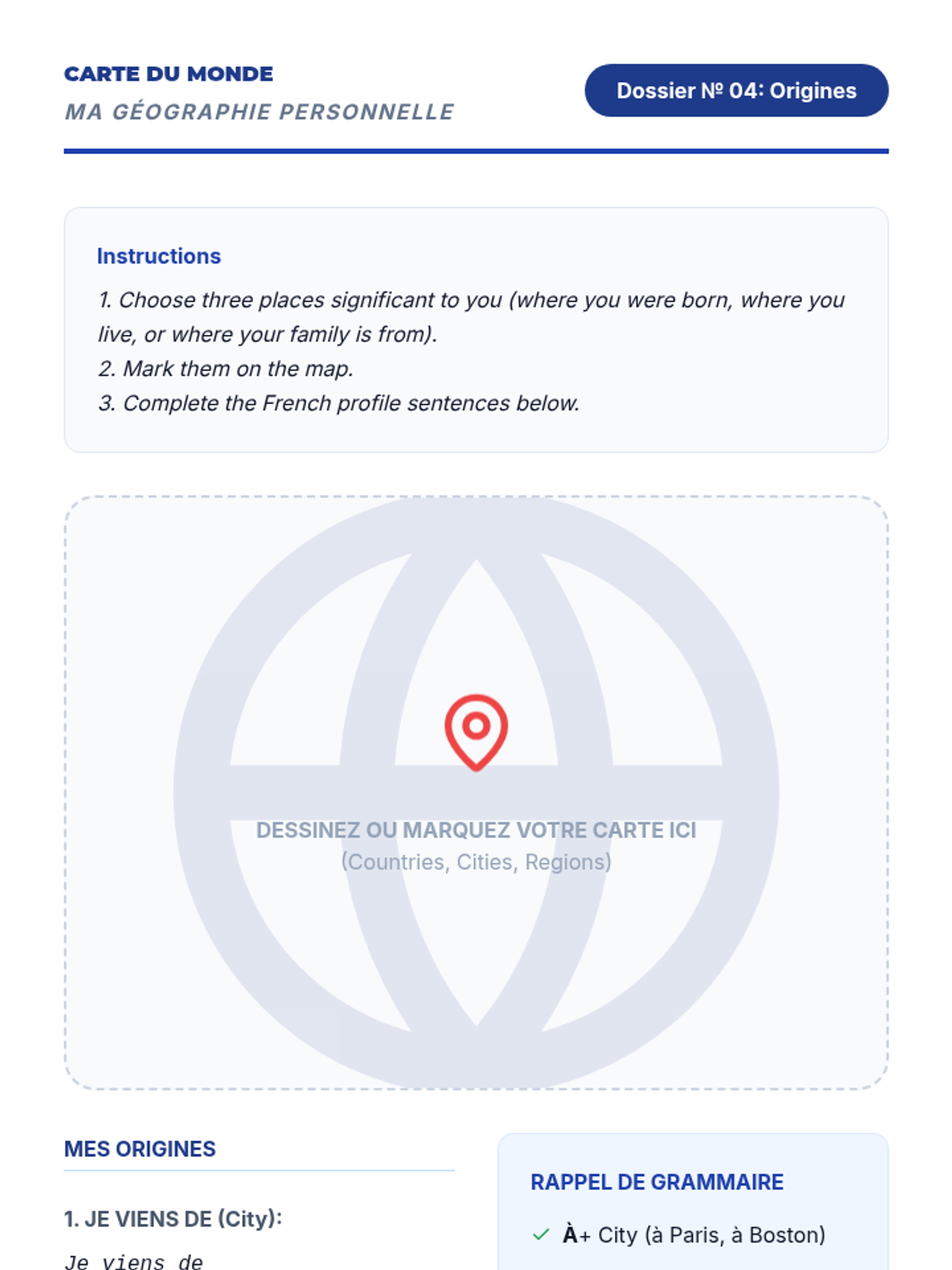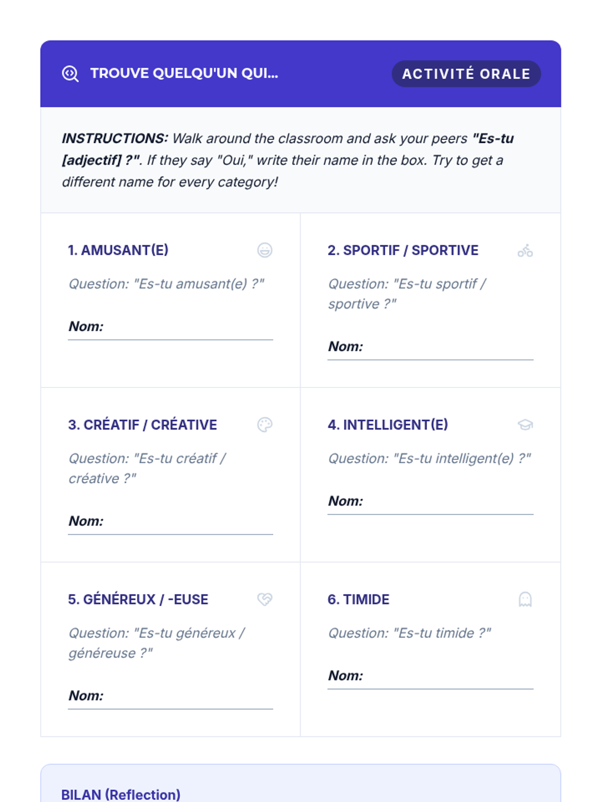 A comprehensive French unit for beginners focused on personal identity, physical traits, personality, family, and origins. Students master adjective agreement and possessive adjectives while building a 'Carnet d'Identité' that culminates in a presentational speaking project.